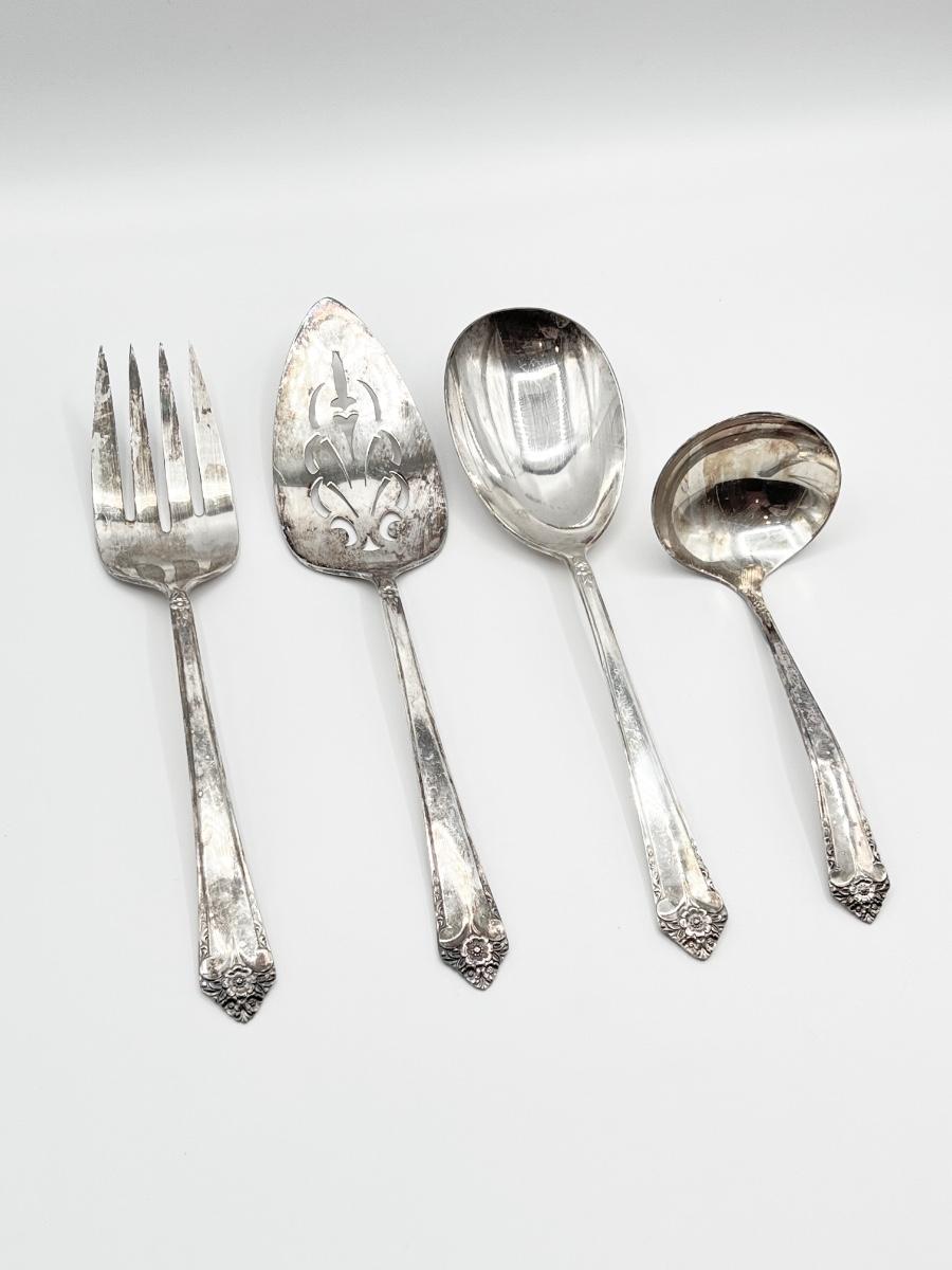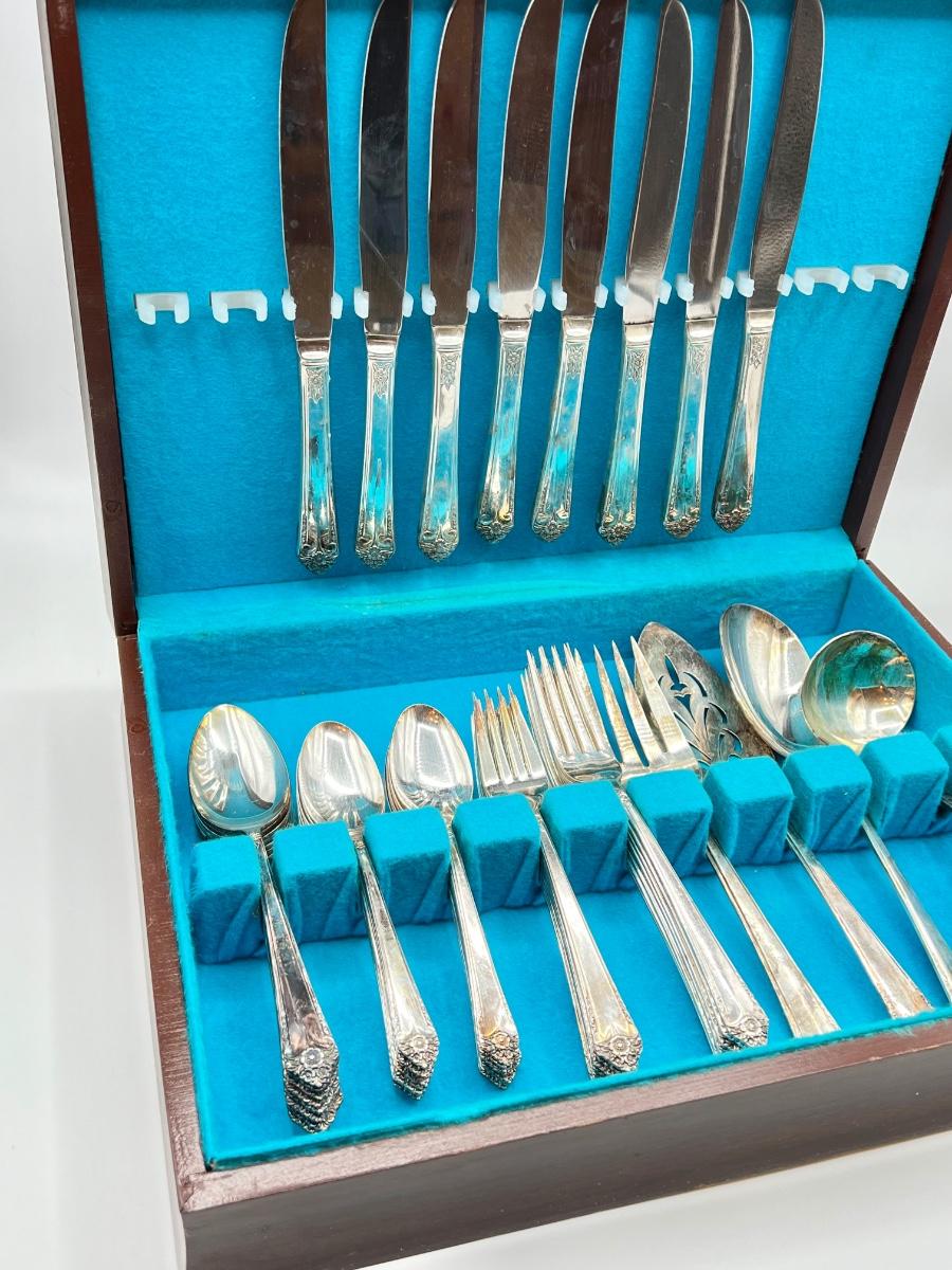 52 piece set includes: 8 Dinner forks, 8 salad forks, 8 soup spoons, 16 tea spoons, 8 butter knives, 4 serving pieces ~ Flatware set does need to be polished ~ Box not included