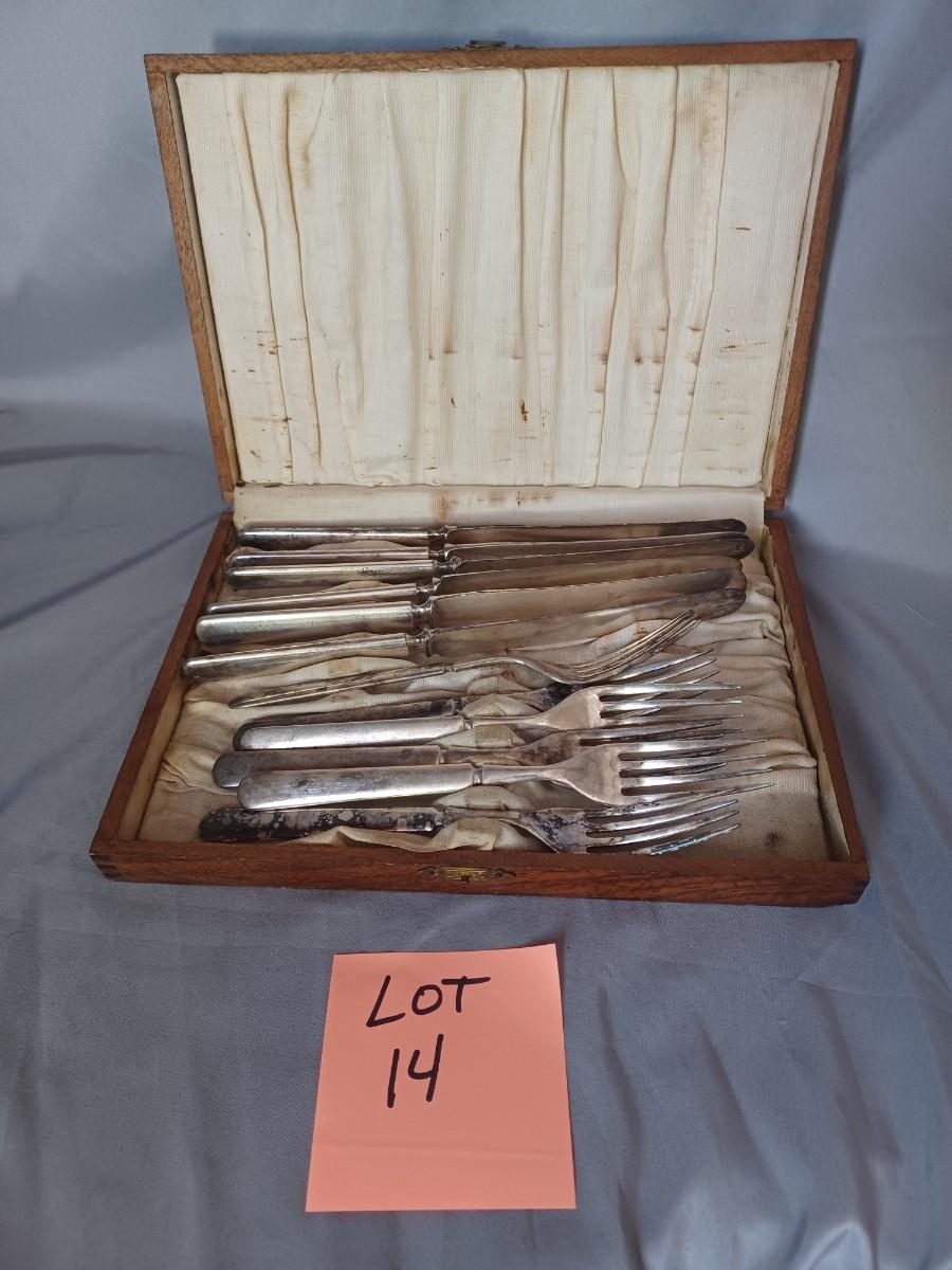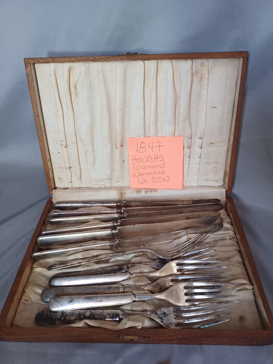vintage 1847 Hacketts Diamond Warranted 12 DTW, Roger's Bros Silverware set with box 6 forks and 6