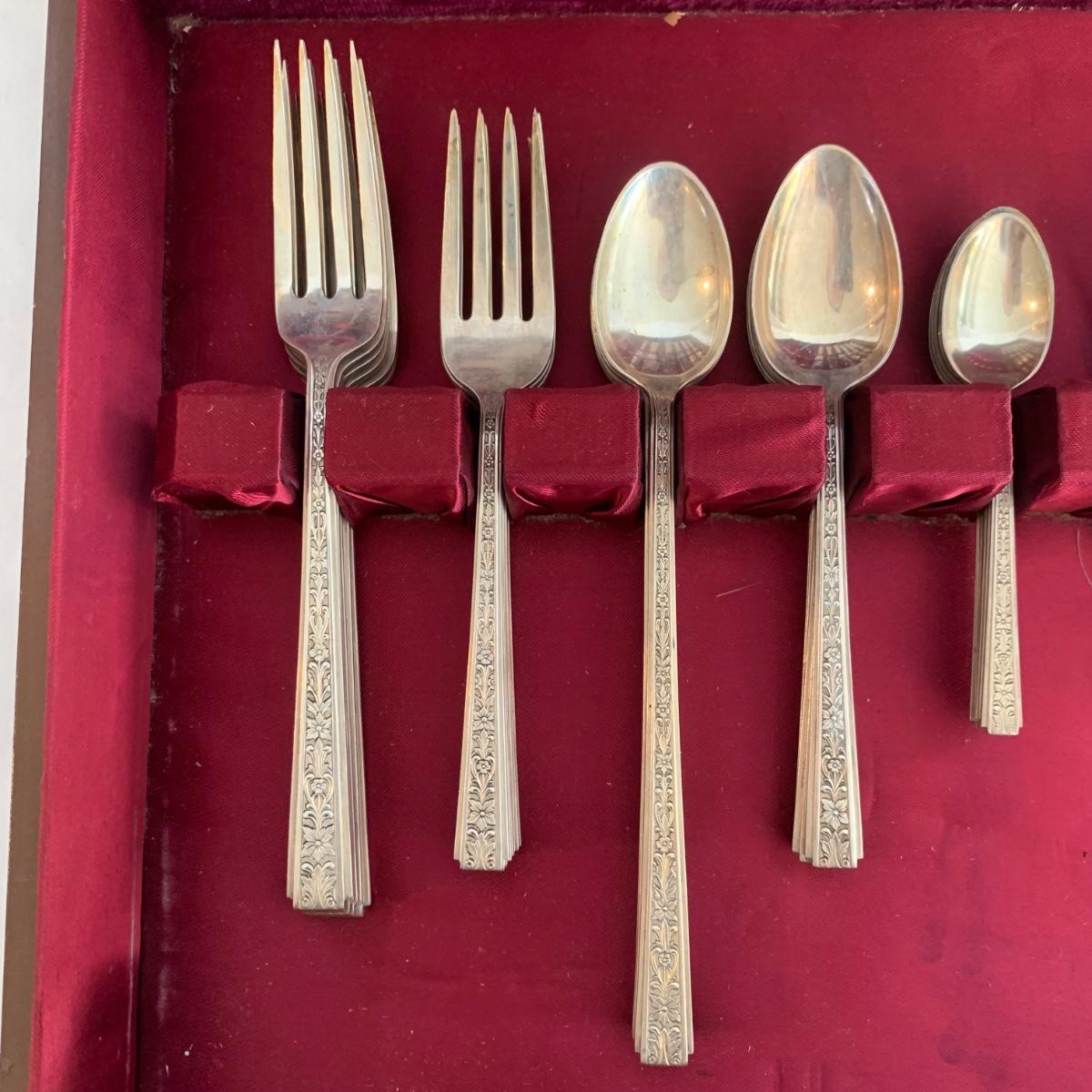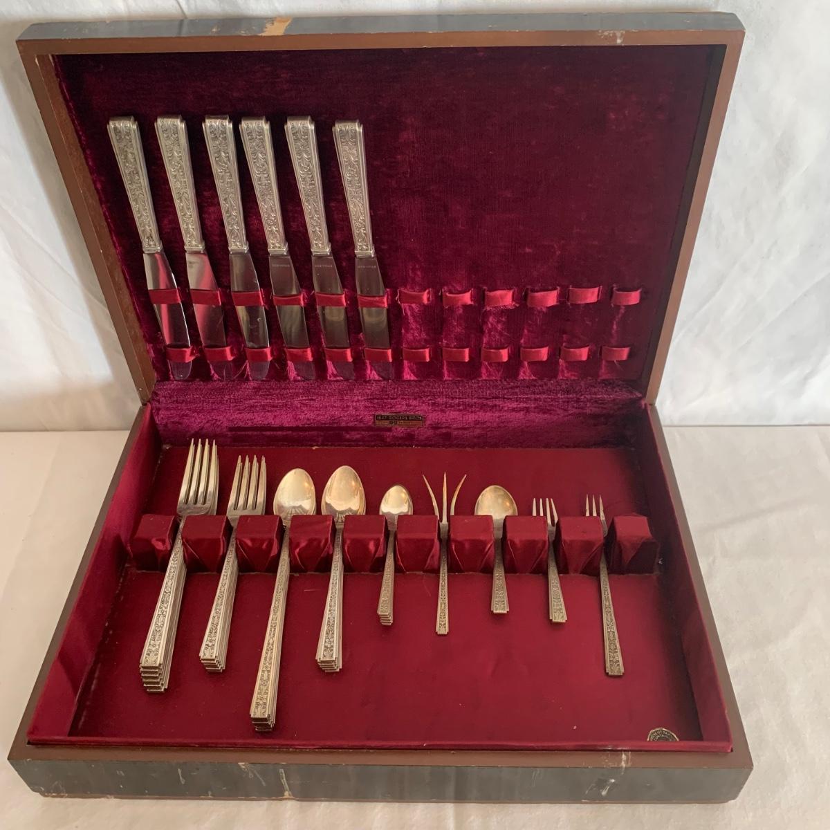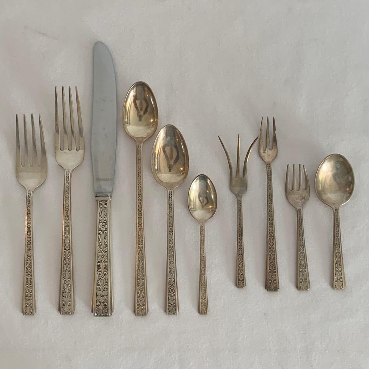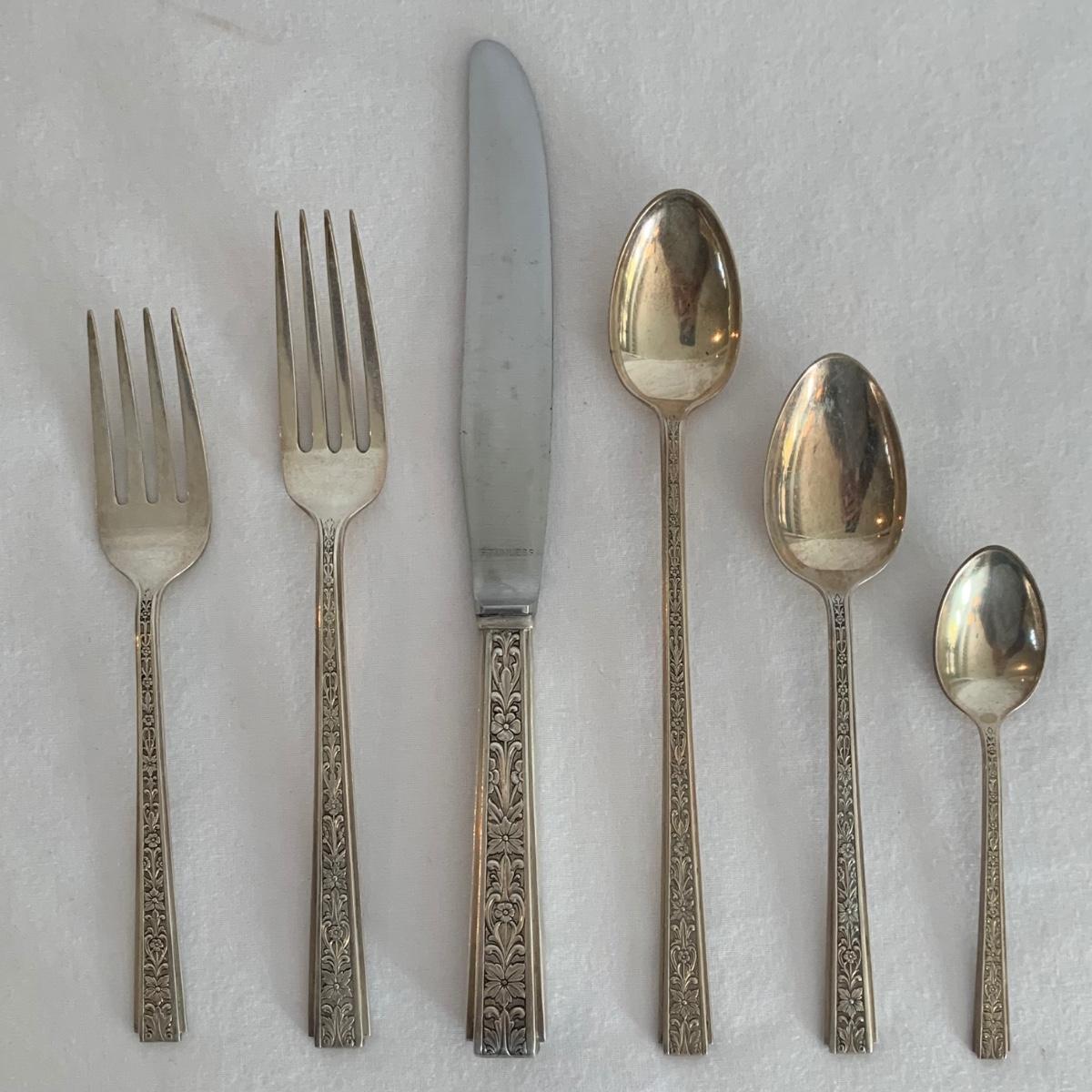 Gorgeous Sterling silver flatware set by Lunt Silversmiths (Rogers, Lunt, & Bowlen) in their ‘Chased Classic’ pattern. The set is a six-piece six-person set plus four single small utensils (40 pieces total) that come in a wooden anti-tarnish case. The case measures 15.75” x 11” x 3”H. It is a bit scratched on the exterior.