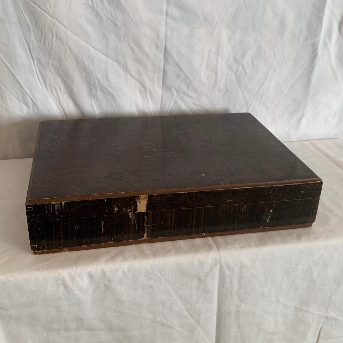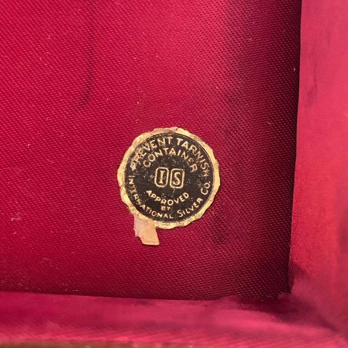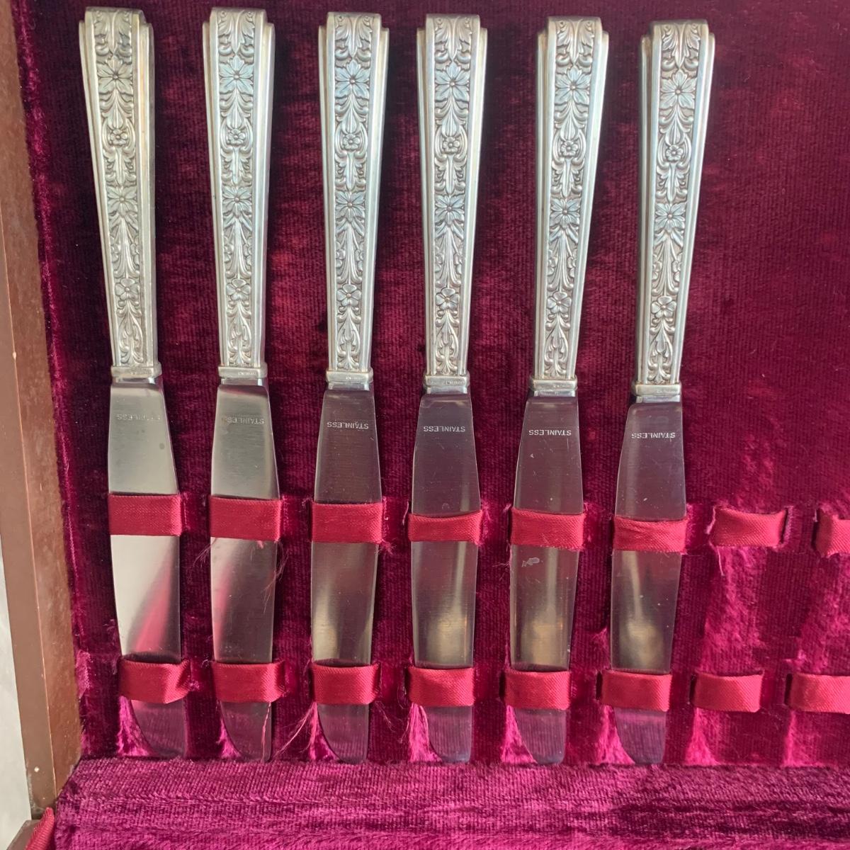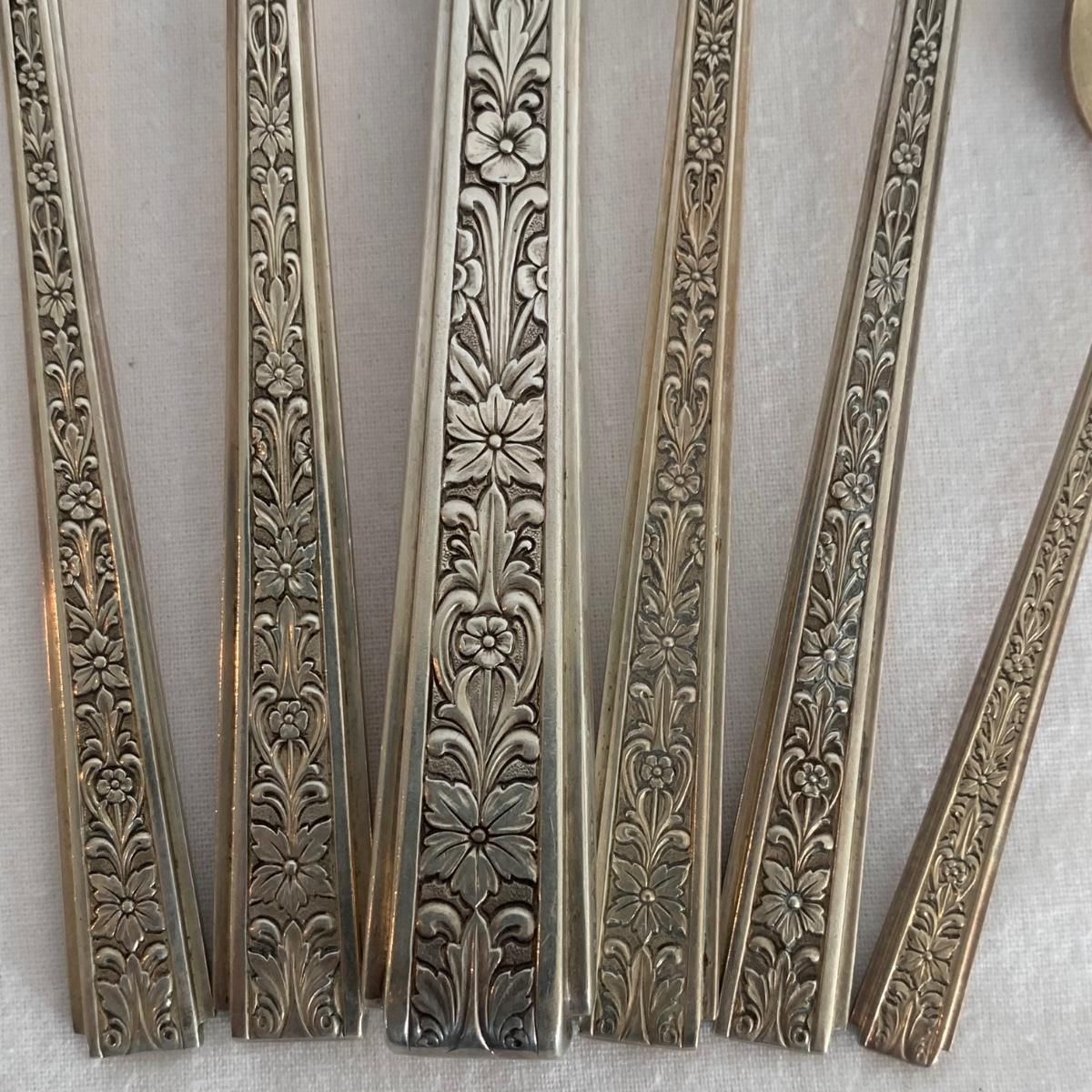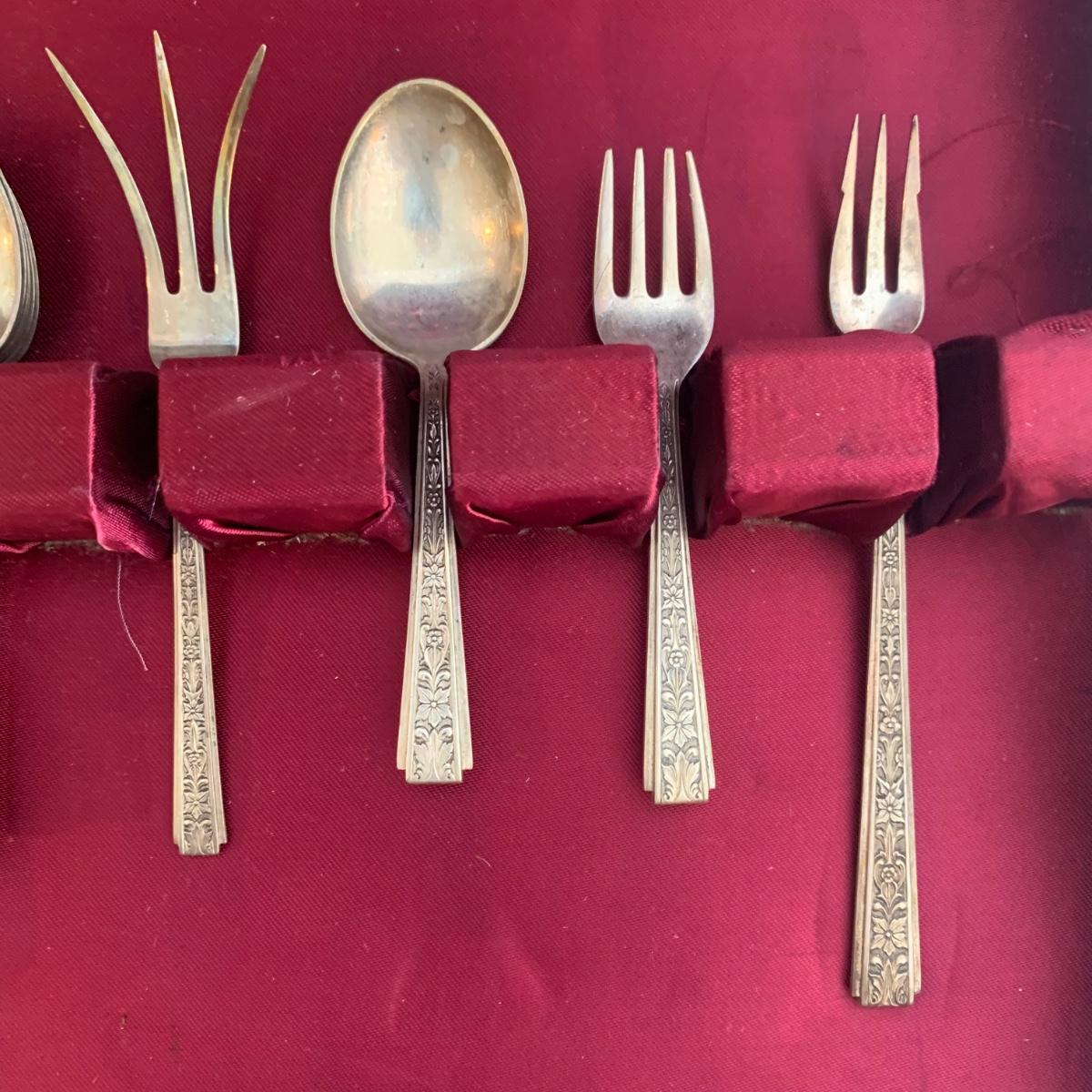 Gorgeous Sterling silver flatware set by Lunt Silversmiths (Rogers, Lunt, & Bowlen) in their ‘Chased Classic’ pattern. The set is a six-piece six-person set plus four single small utensils (40 pieces total) that come in a wooden anti-tarnish case. The case measures 15.75” x 11” x 3”H. It is a bit scratched on the exterior.