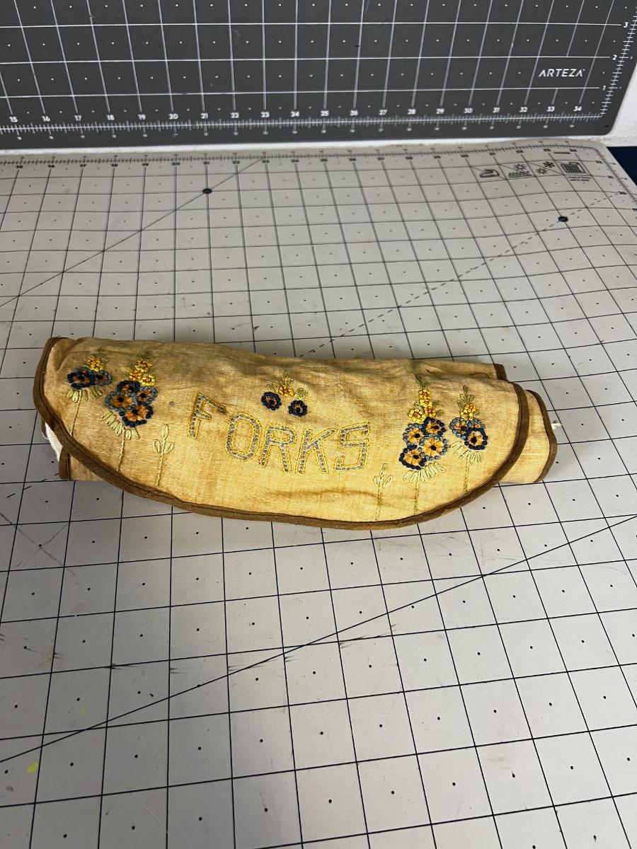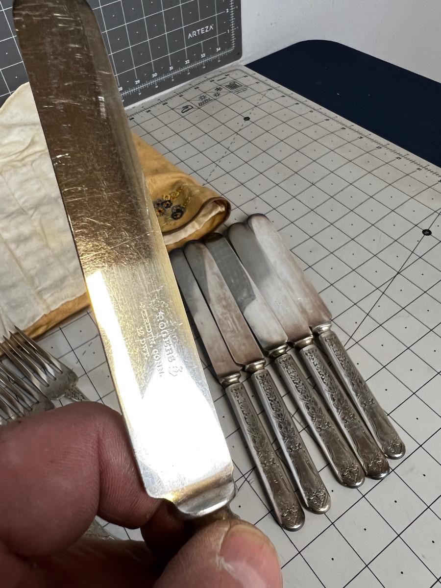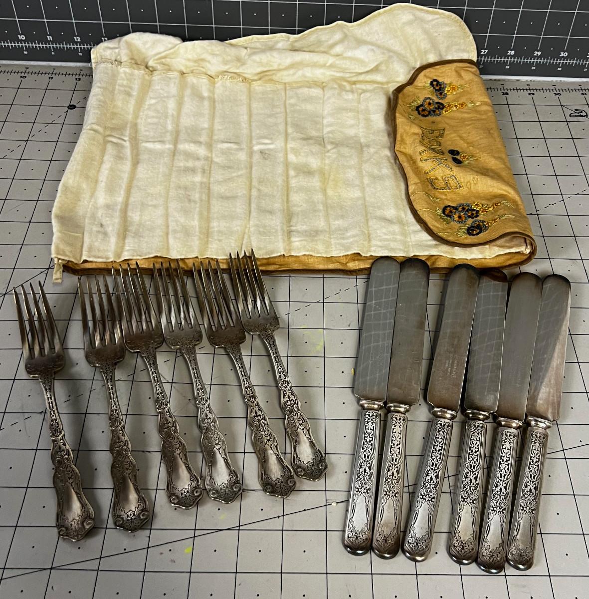 Rogers Silver Plate Set Antique with Embroidered Holder.