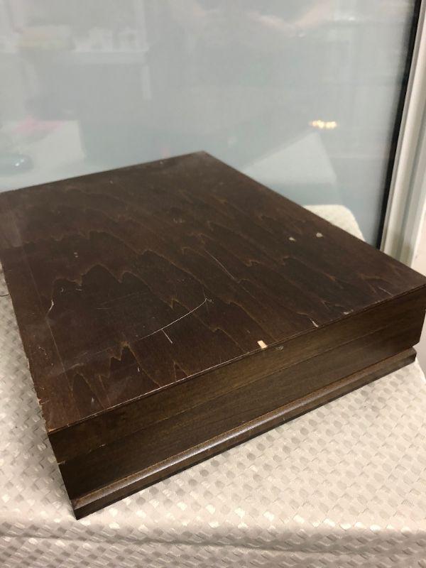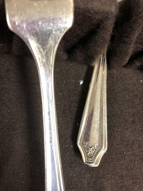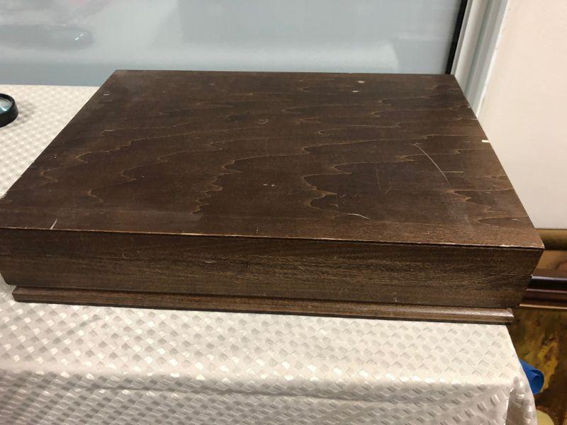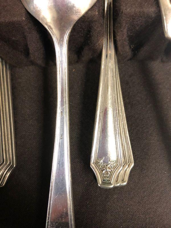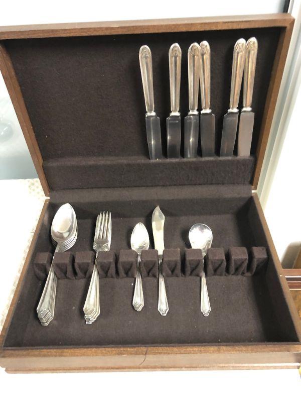 Rogers silverplate flatware with storage box. Wood box is felt lined. Previously owned.