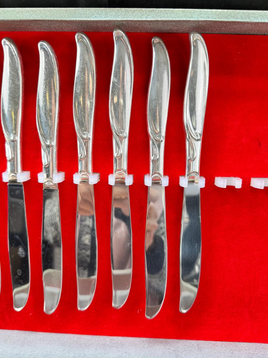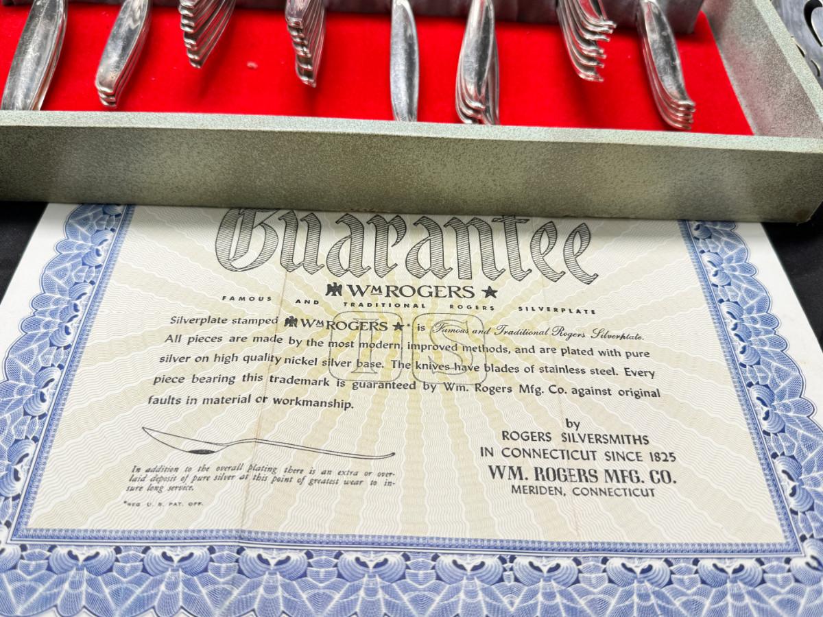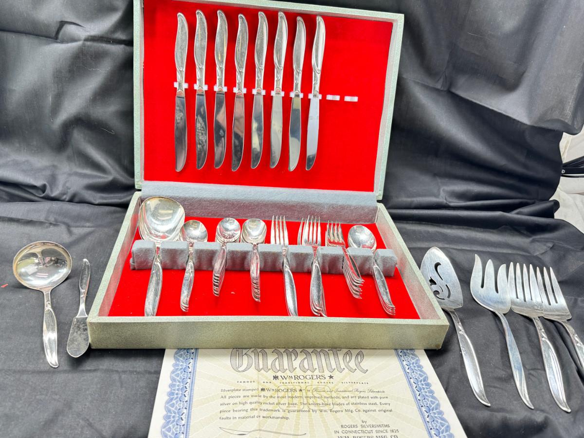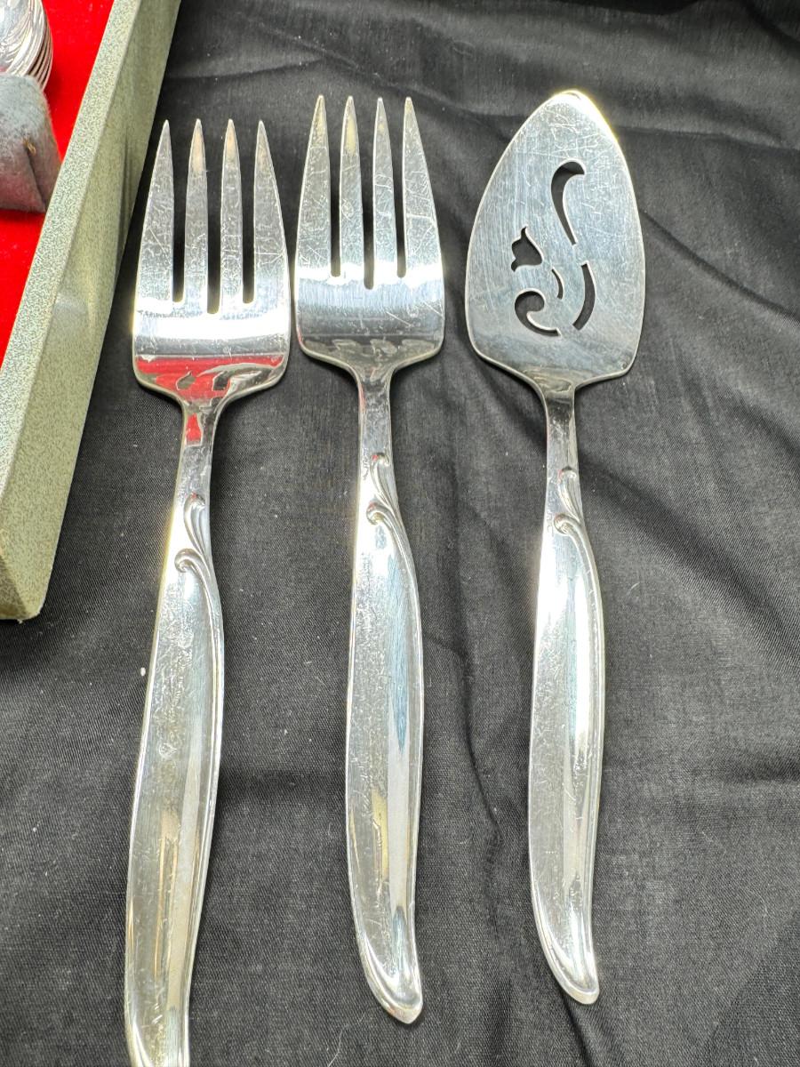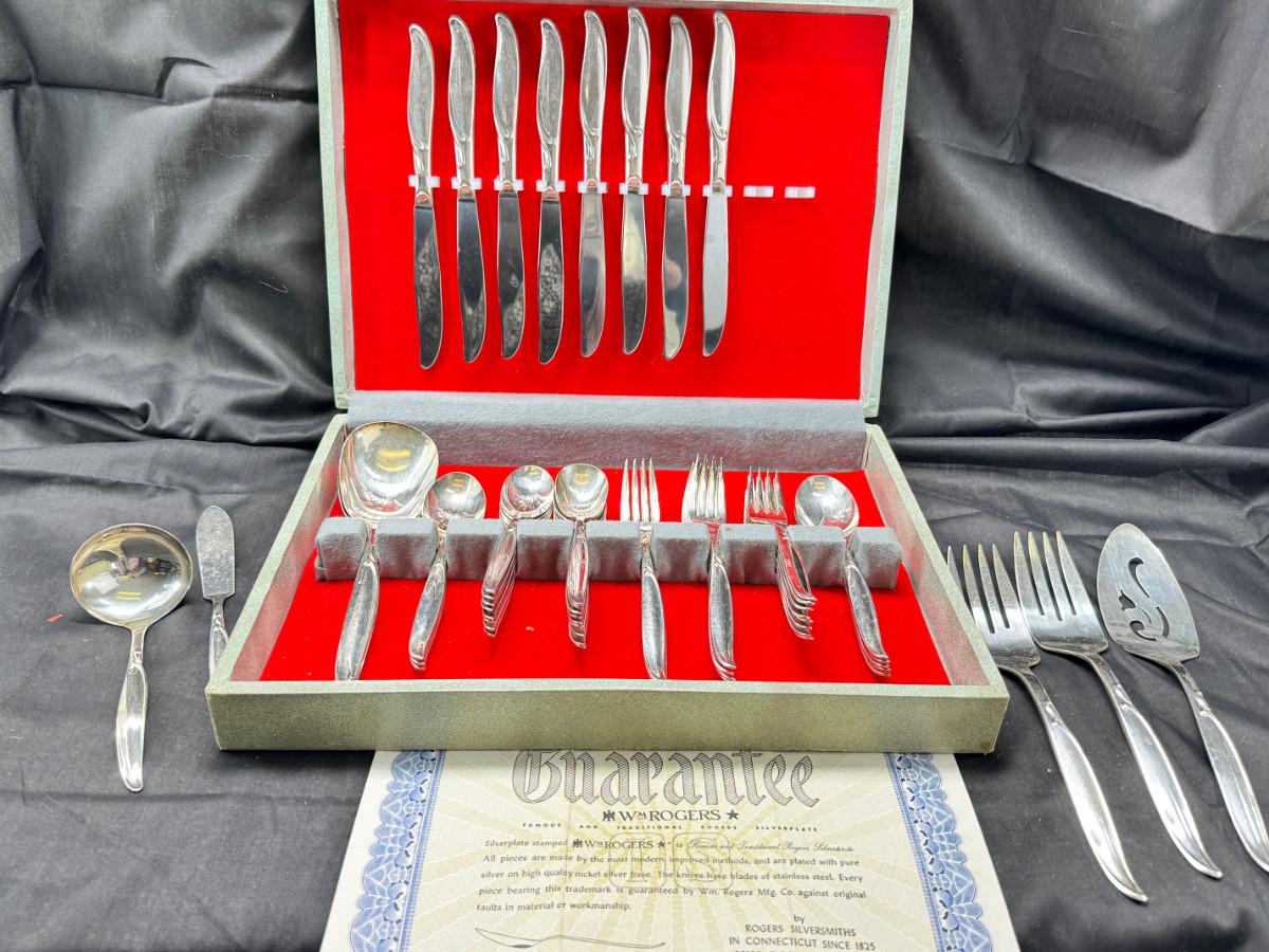 Set for 12 ( 8 knives) with serving pieces in original tarnish proof box with COA. Lovely simple pattern Silver plate Service/6+ 50's Mid-Century Modern ROGERS International Flatware SWEEP Pattern SWIRL in Handle w/Leaf Good Condition No Wear