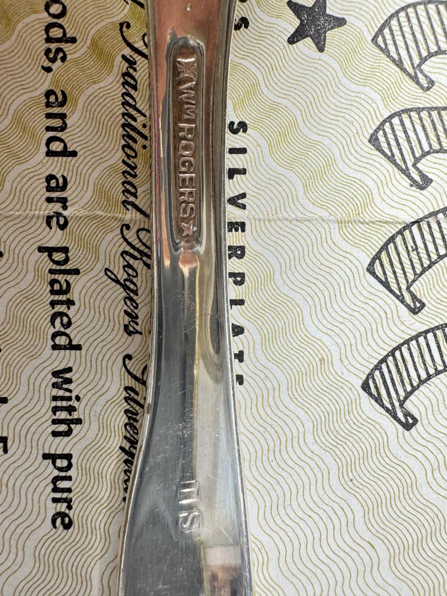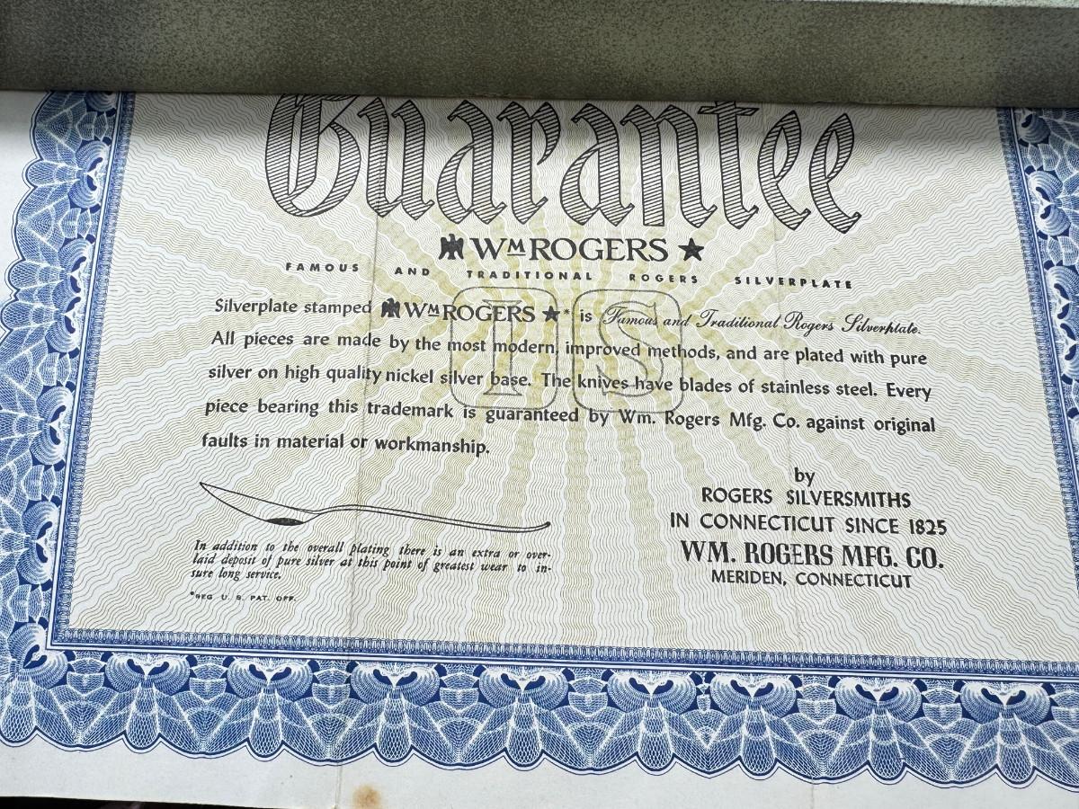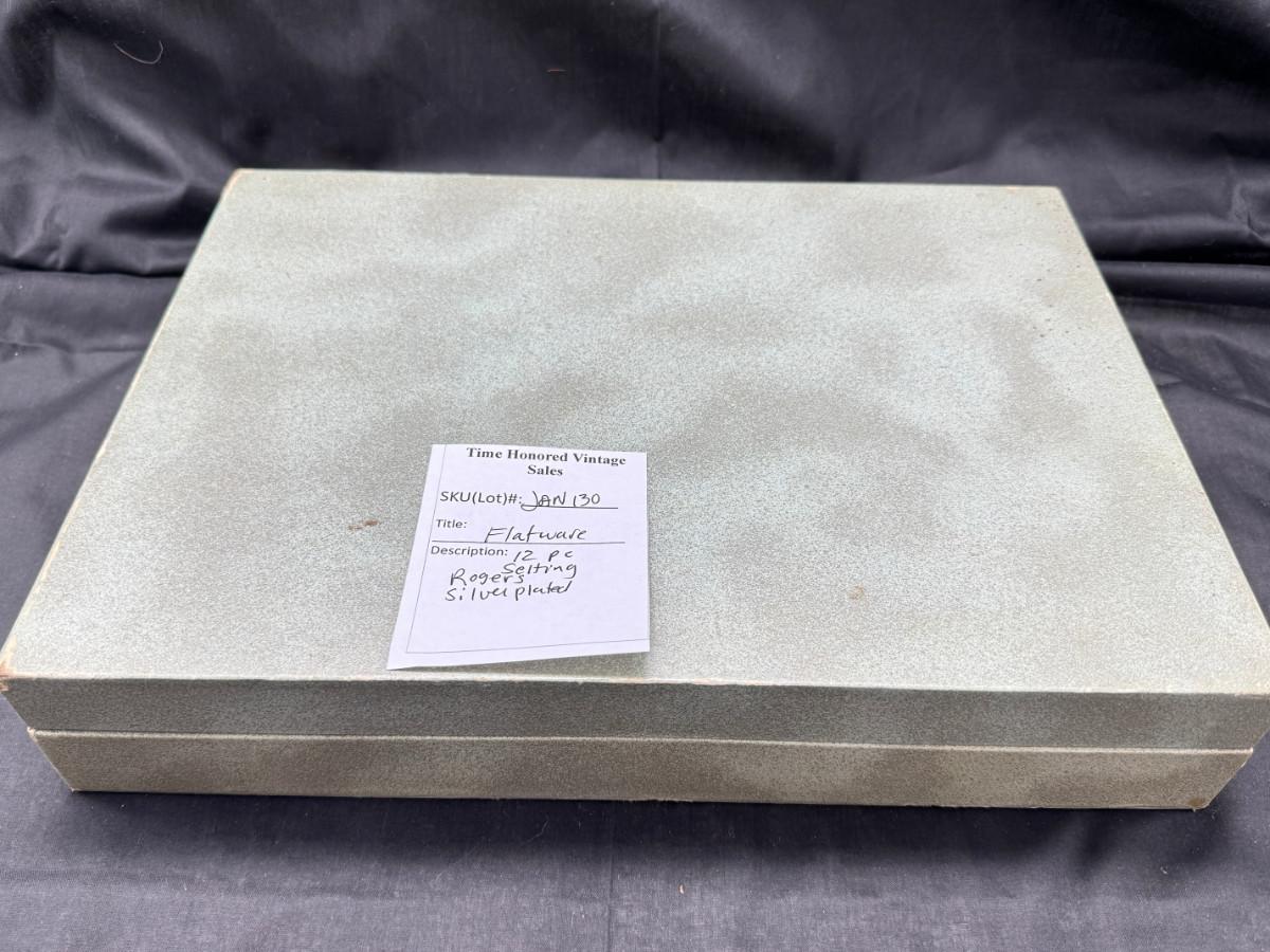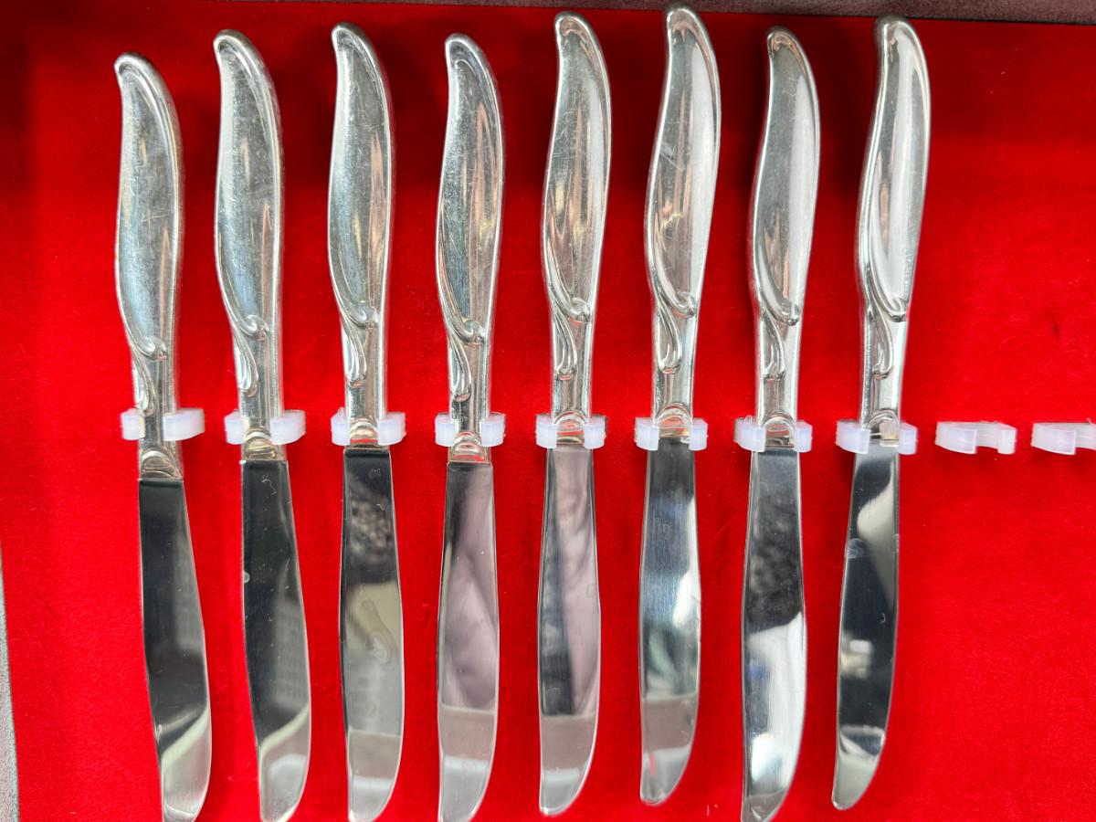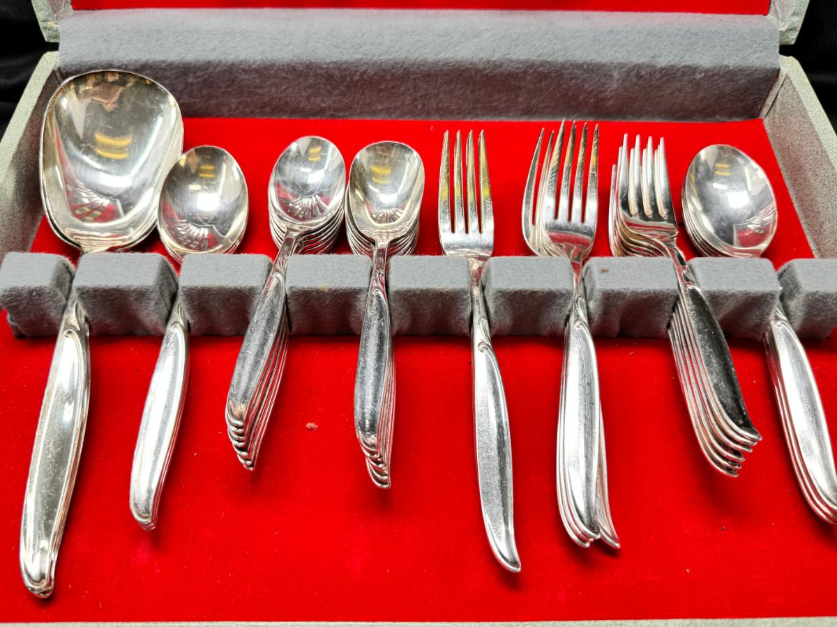 Set for 12 ( 8 knives) with serving pieces in original tarnish proof box with COA. Lovely simple pattern Silver plate Service/6+ 50's Mid-Century Modern ROGERS International Flatware SWEEP Pattern SWIRL in Handle w/Leaf Good Condition No Wear