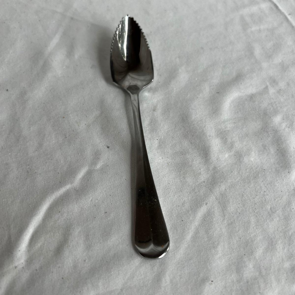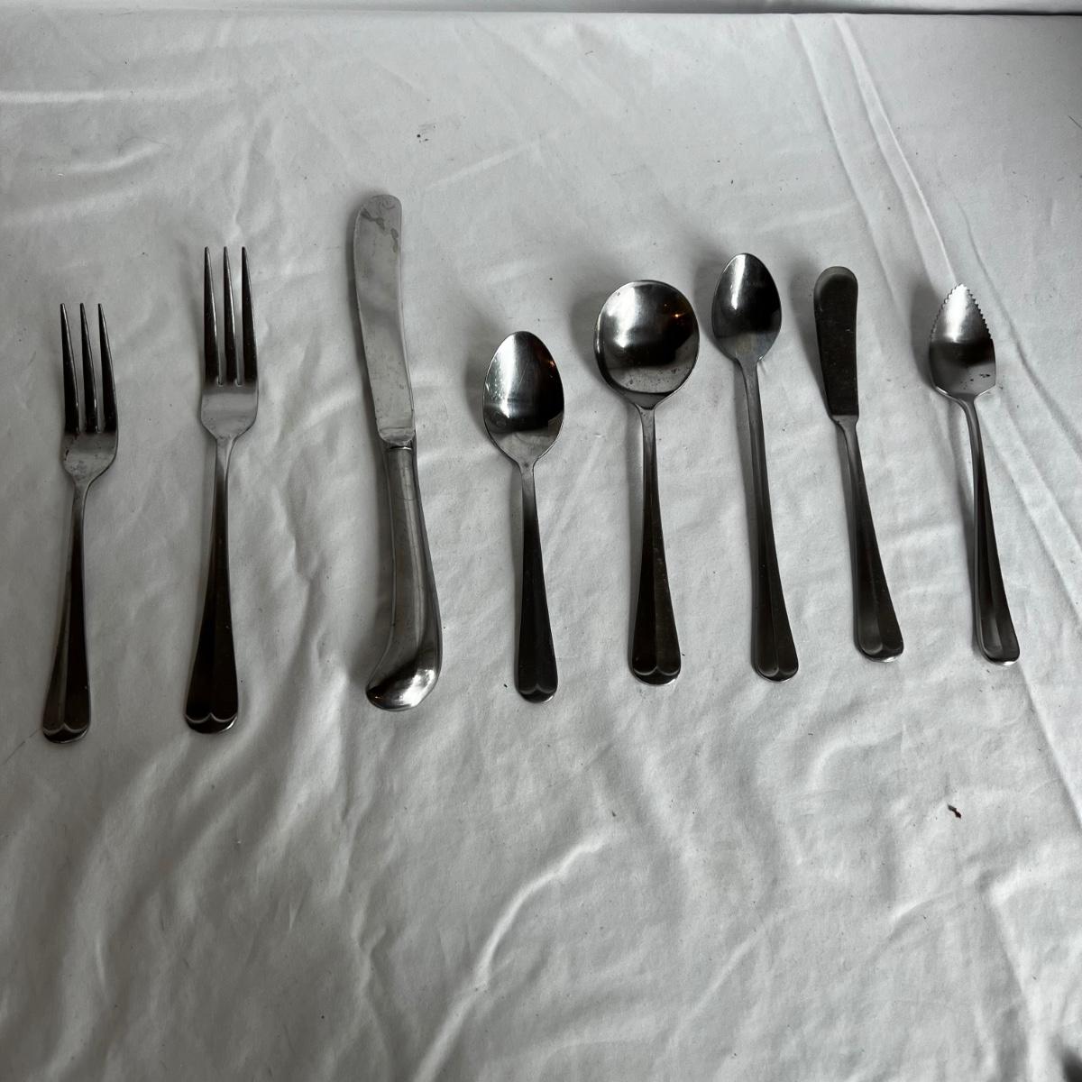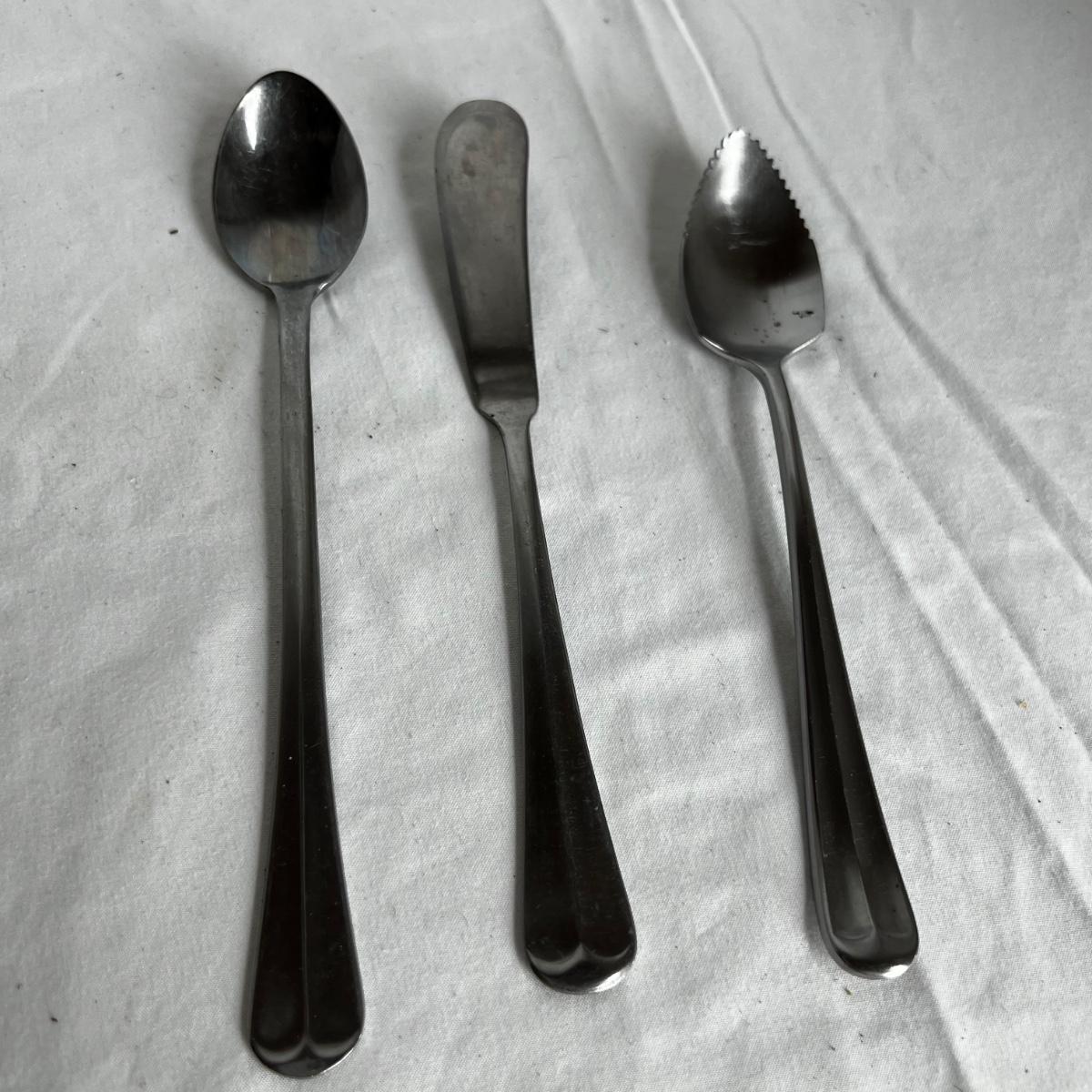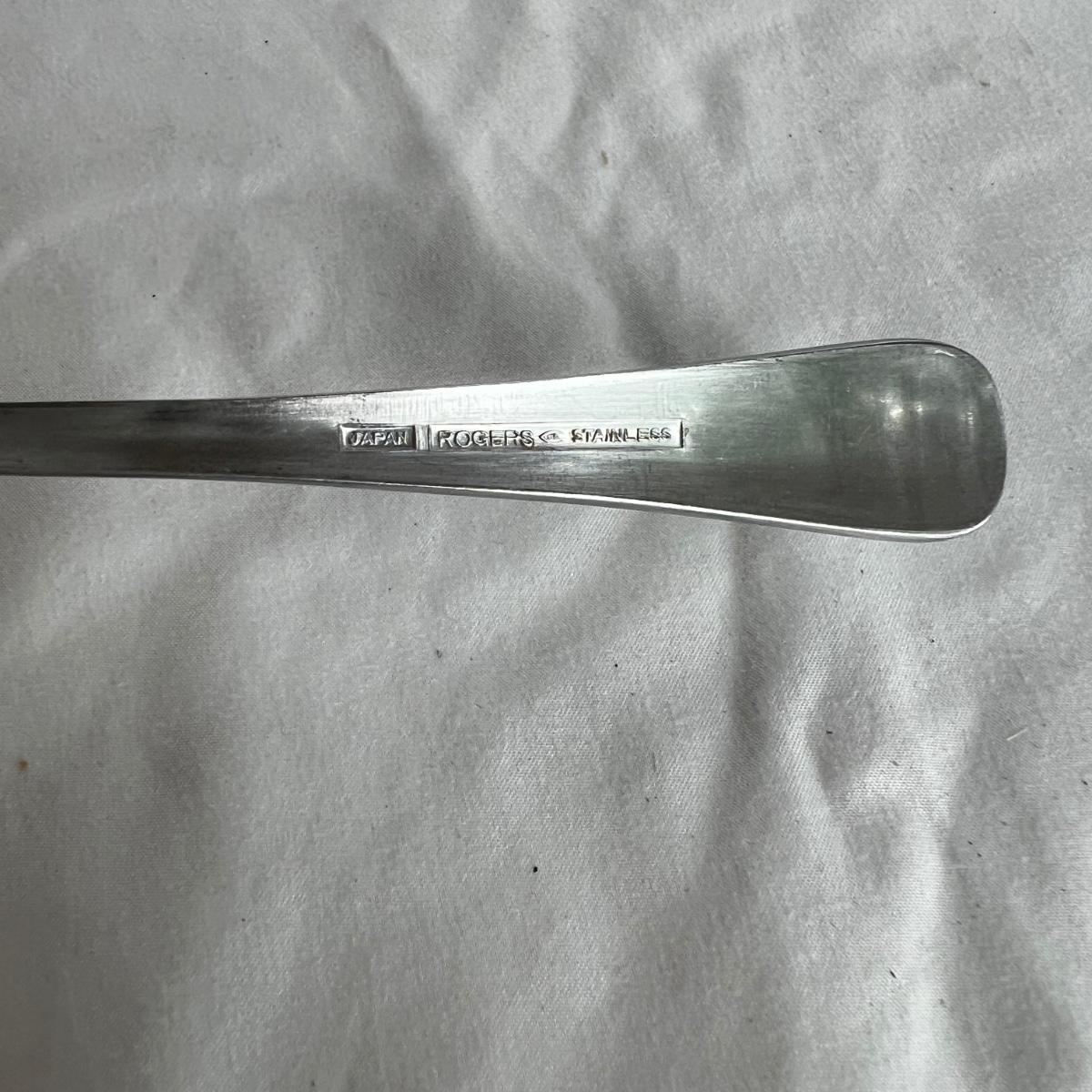 A large set of mostly Rogers stainless flatware, including grapefruit spoons. All of the grapefruit spoons are stainless steel, four by Supreme Stainless, and one is by Norpro Stainless. each measure approximately 6.25” long. The set includes four soup spoons, seven tea stirring long spoons, 16 teaspoons, 14 dinner knives, three salad forks, 11 dinner forks, one butter serving knife and one serving spoon. Local pick up only.