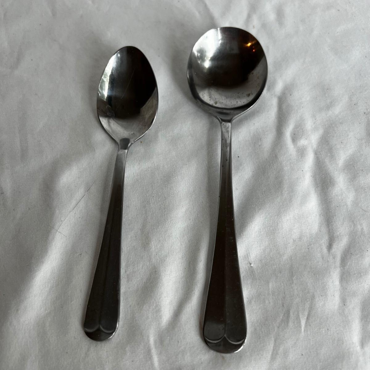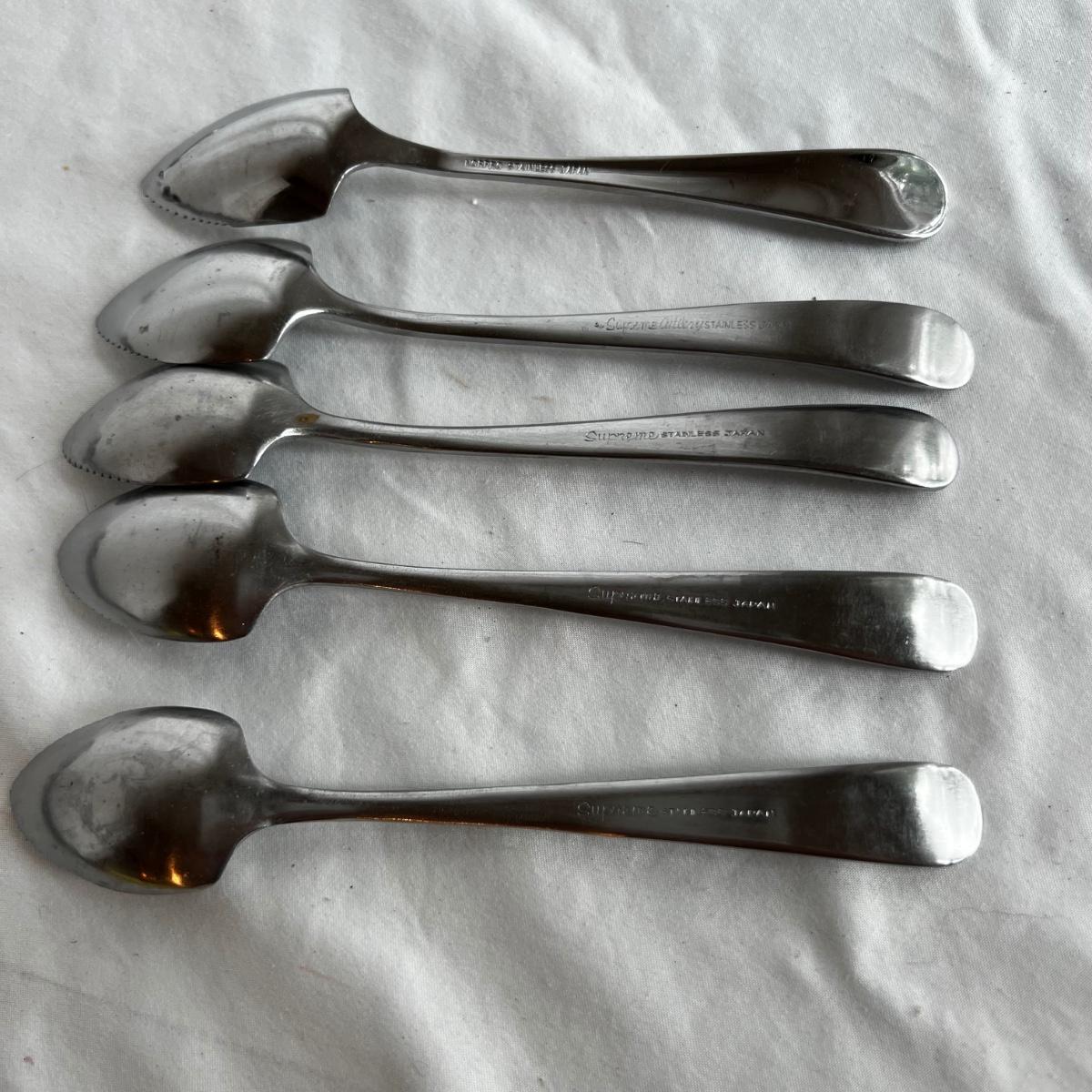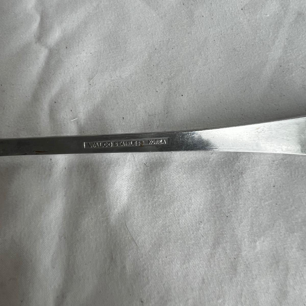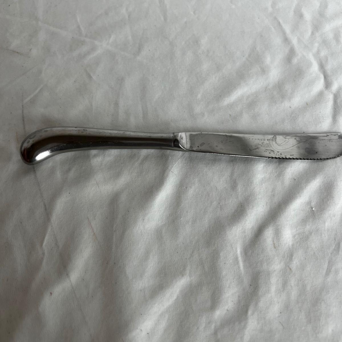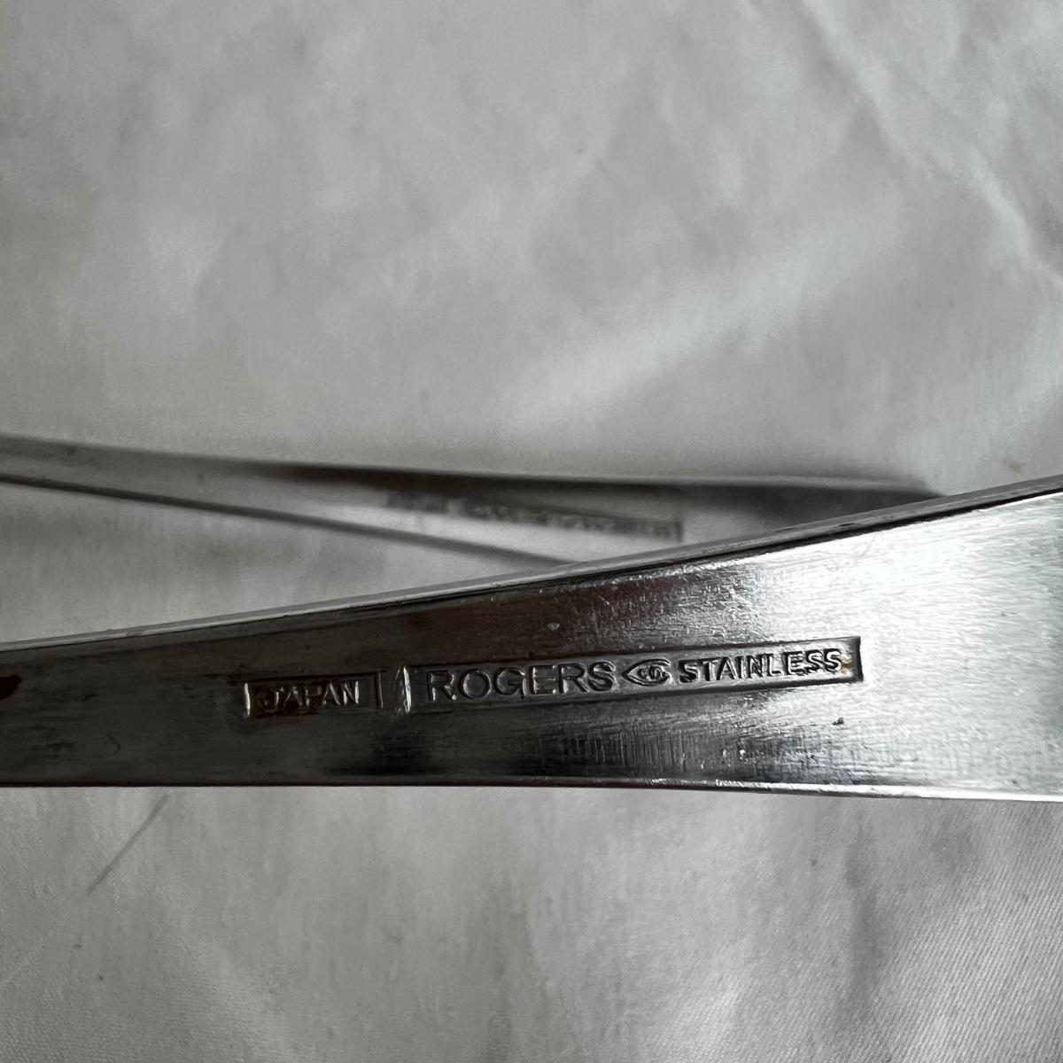 A large set of mostly Rogers stainless flatware, including grapefruit spoons. All of the grapefruit spoons are stainless steel, four by Supreme Stainless, and one is by Norpro Stainless. each measure approximately 6.25” long. The set includes four soup spoons, seven tea stirring long spoons, 16 teaspoons, 14 dinner knives, three salad forks, 11 dinner forks, one butter serving knife and one serving spoon. Local pick up only.