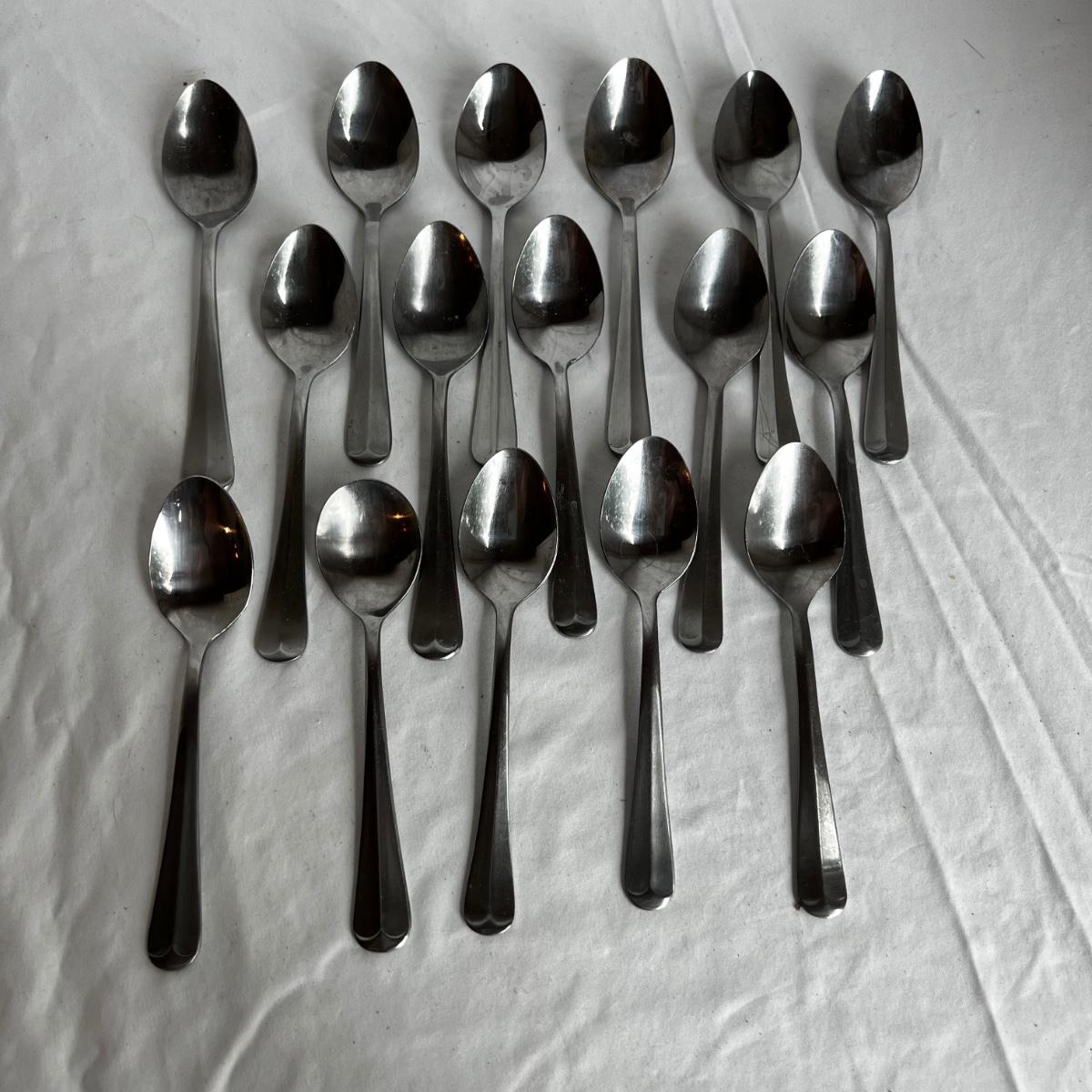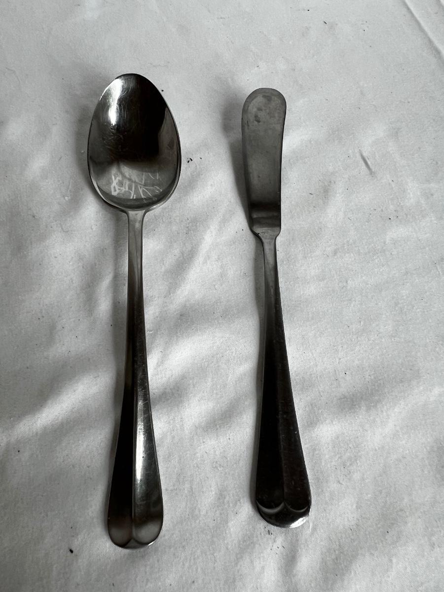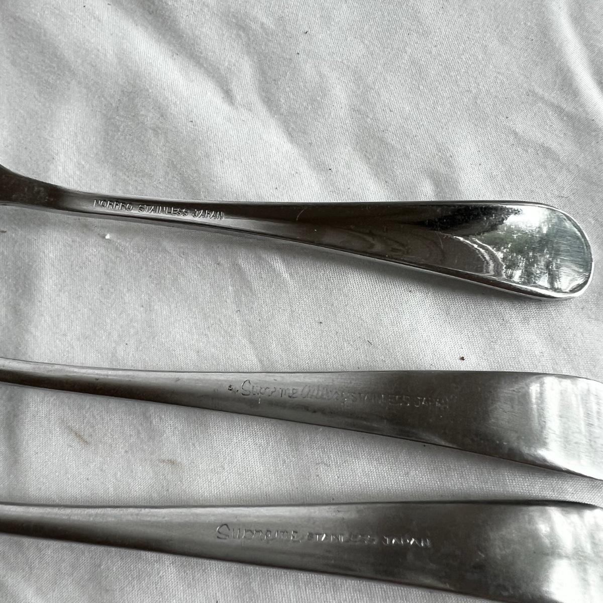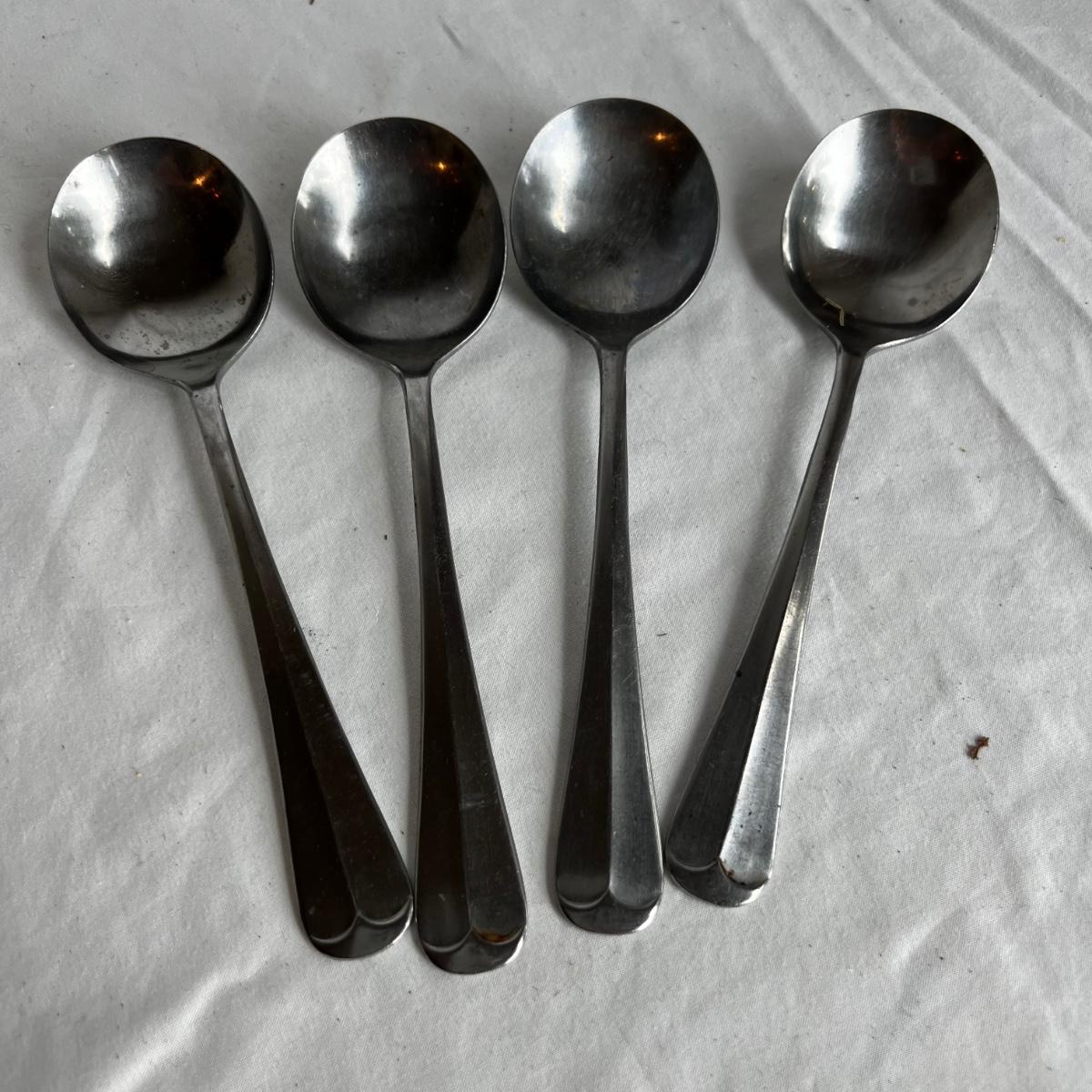 A large set of mostly Rogers stainless flatware, including grapefruit spoons. All of the grapefruit spoons are stainless steel, four by Supreme Stainless, and one is by Norpro Stainless. each measure approximately 6.25” long. The set includes four soup spoons, seven tea stirring long spoons, 16 teaspoons, 14 dinner knives, three salad forks, 11 dinner forks, one butter serving knife and one serving spoon. Local pick up only.