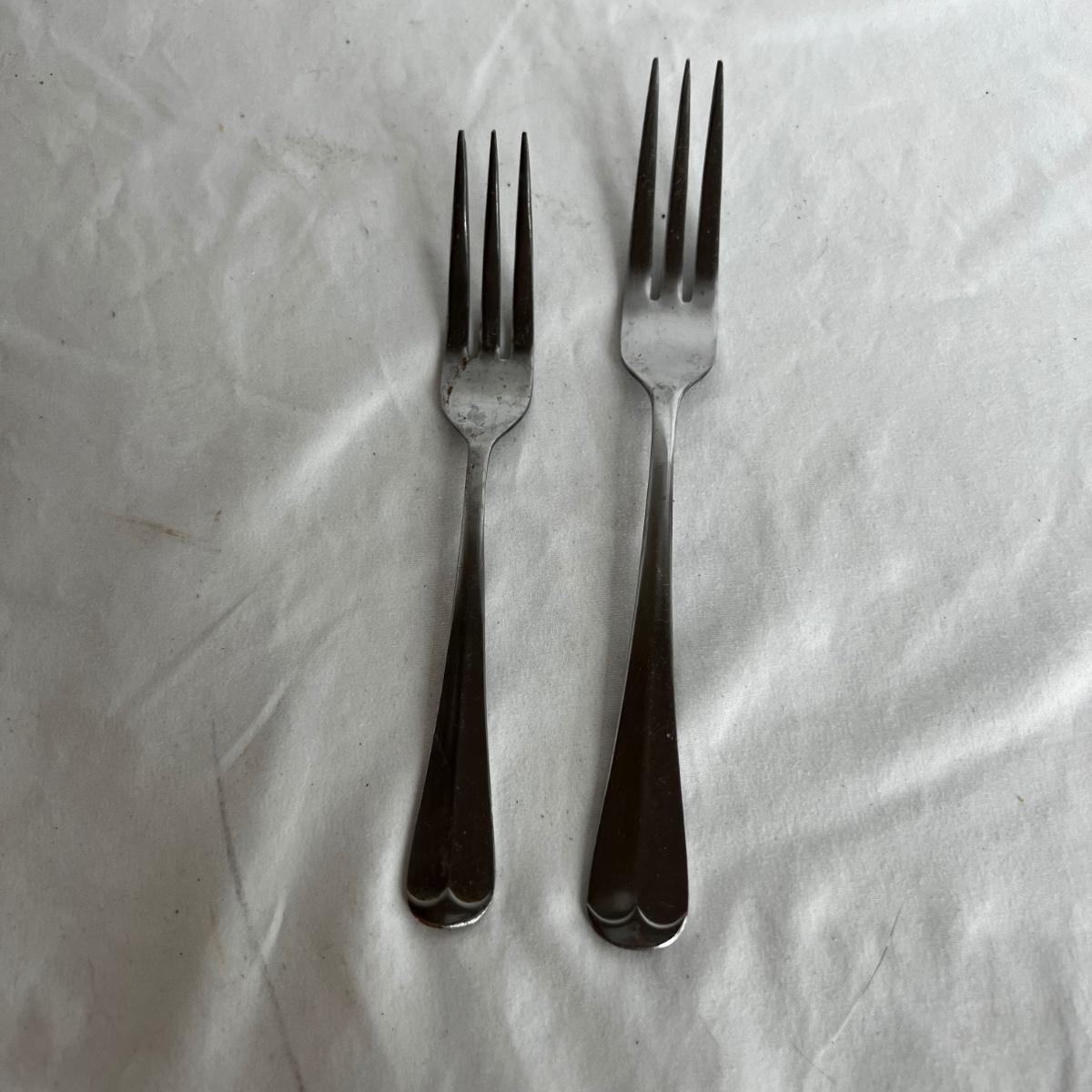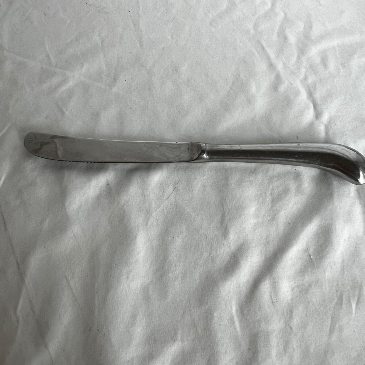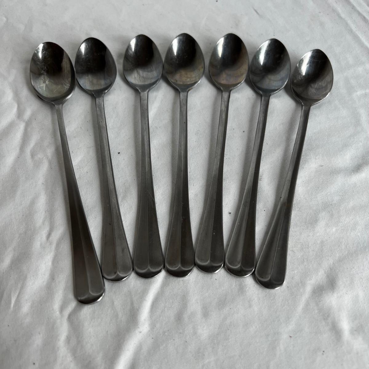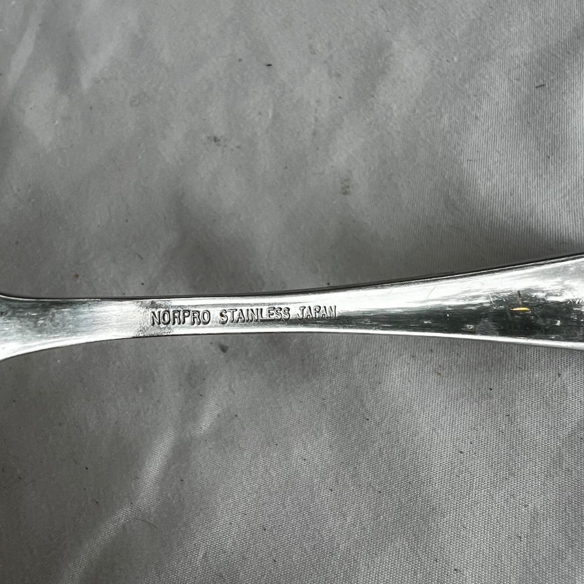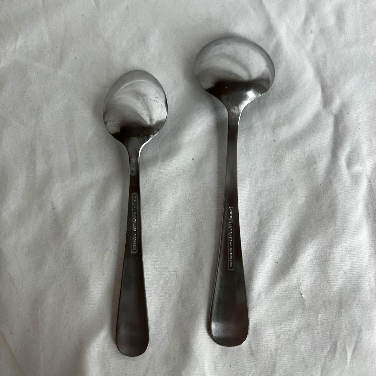 A large set of mostly Rogers stainless flatware, including grapefruit spoons. All of the grapefruit spoons are stainless steel, four by Supreme Stainless, and one is by Norpro Stainless. each measure approximately 6.25” long. The set includes four soup spoons, seven tea stirring long spoons, 16 teaspoons, 14 dinner knives, three salad forks, 11 dinner forks, one butter serving knife and one serving spoon. Local pick up only.