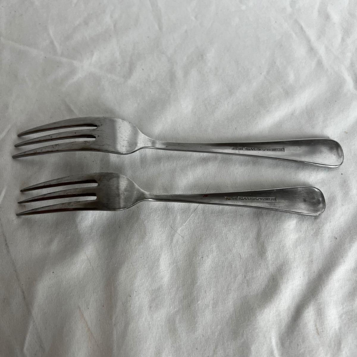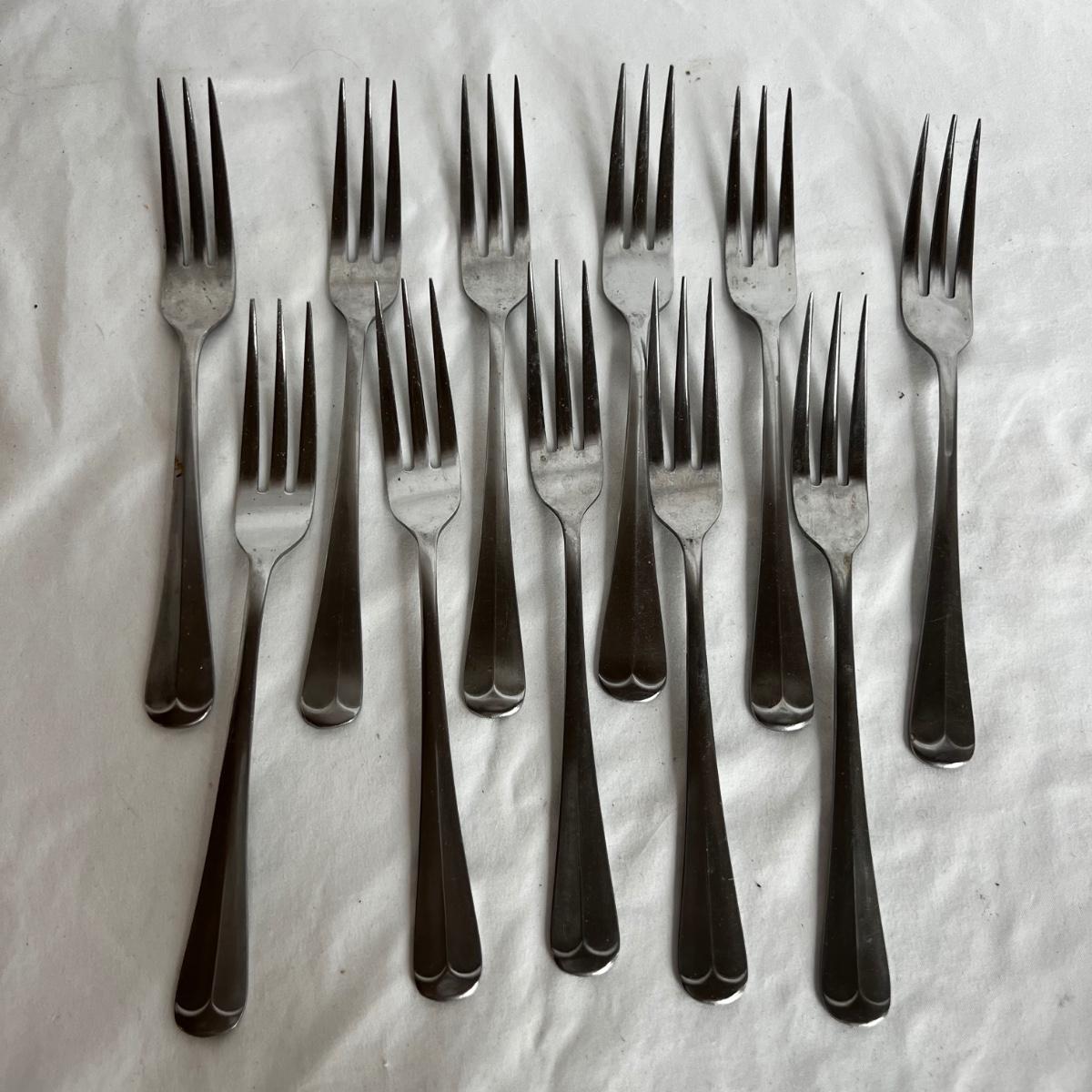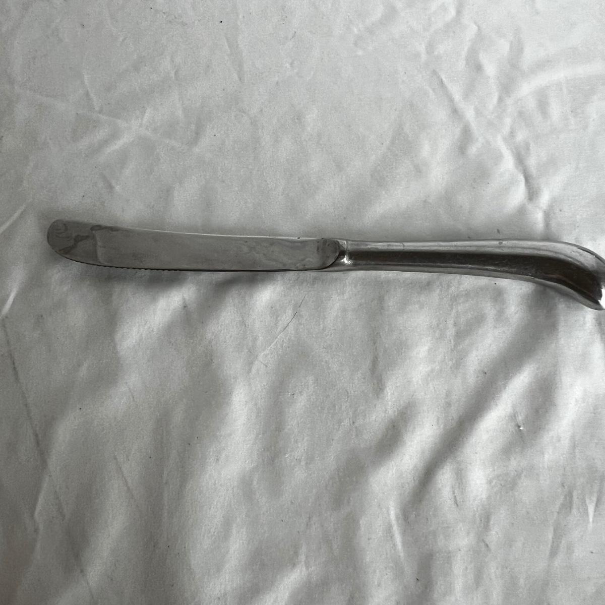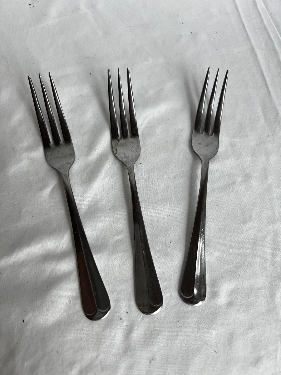 A large set of mostly Rogers stainless flatware, including grapefruit spoons. All of the grapefruit spoons are stainless steel, four by Supreme Stainless, and one is by Norpro Stainless. each measure approximately 6.25” long. The set includes four soup spoons, seven tea stirring long spoons, 16 teaspoons, 14 dinner knives, three salad forks, 11 dinner forks, one butter serving knife and one serving spoon. Local pick up only.