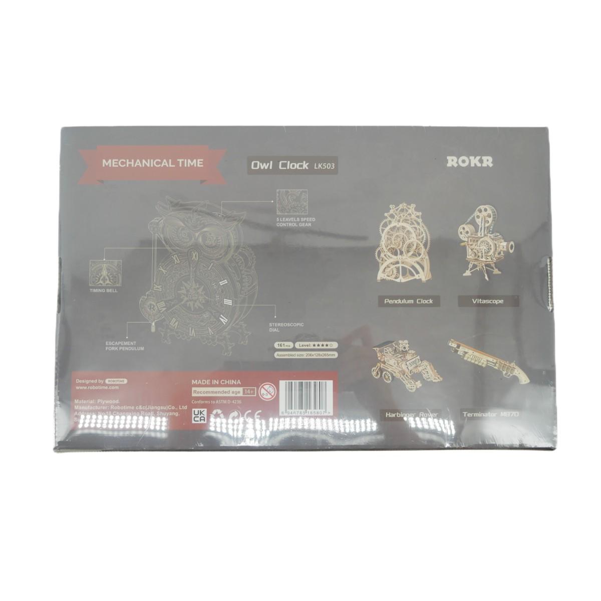 New, sealed Rokr wooden owl mechanical time clock puzzle.