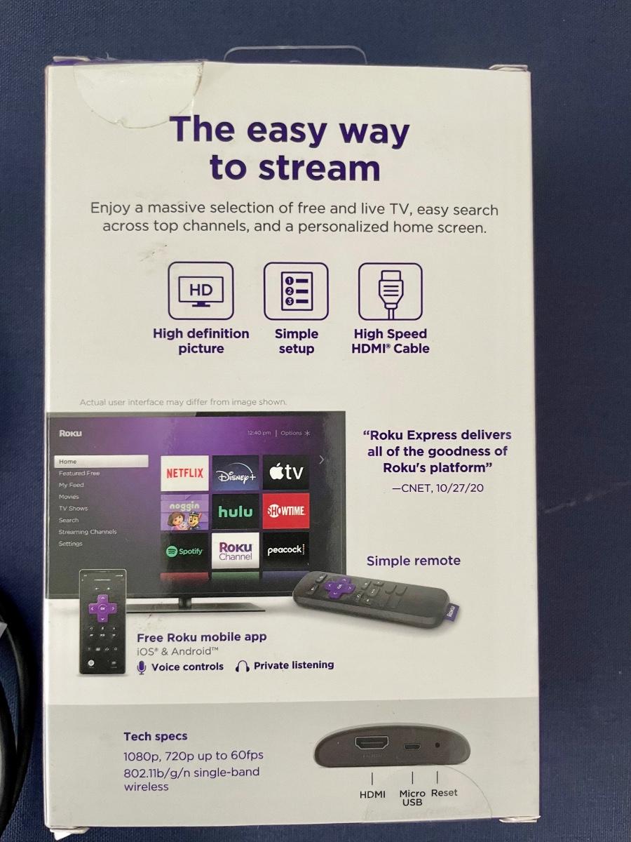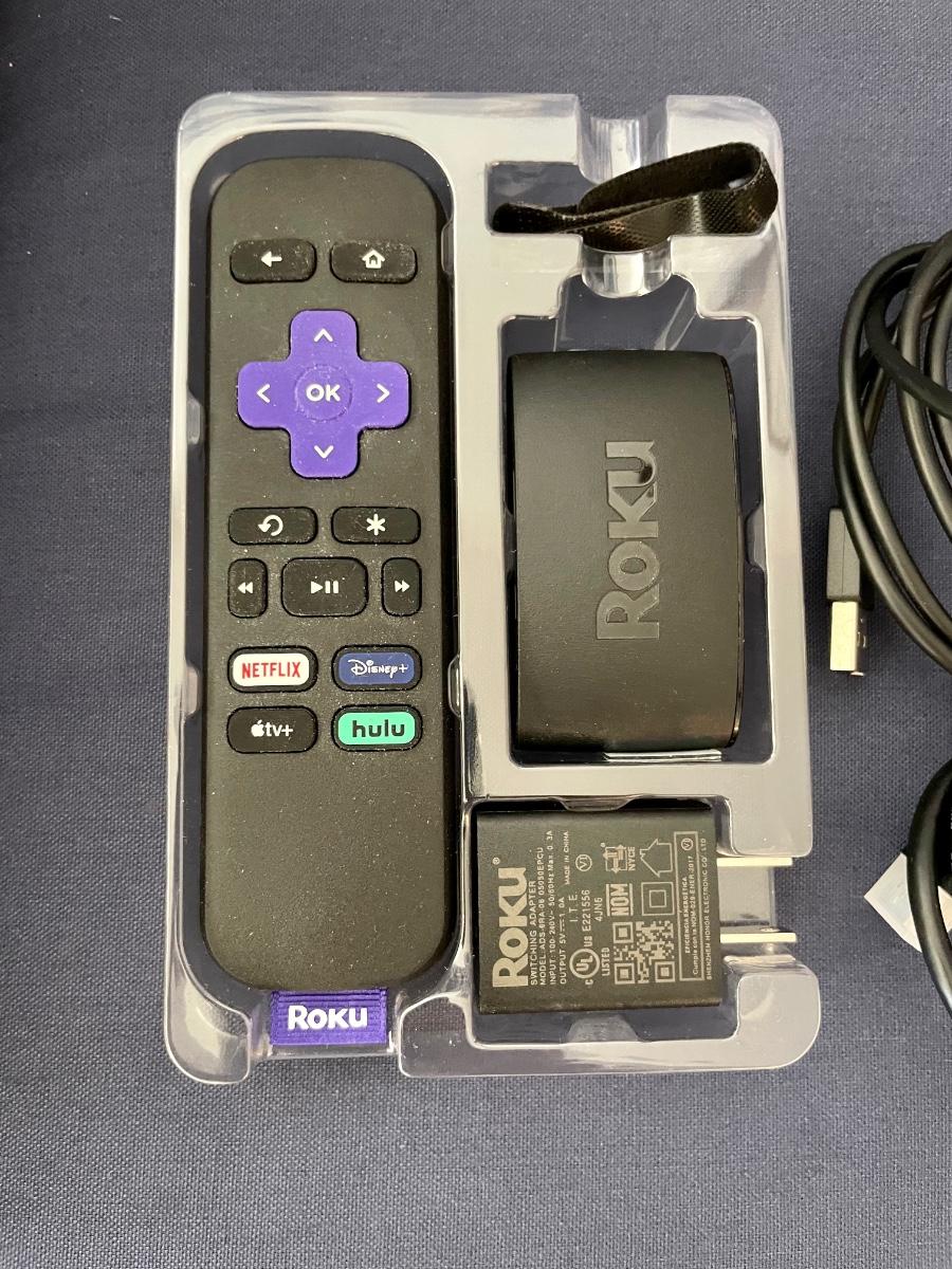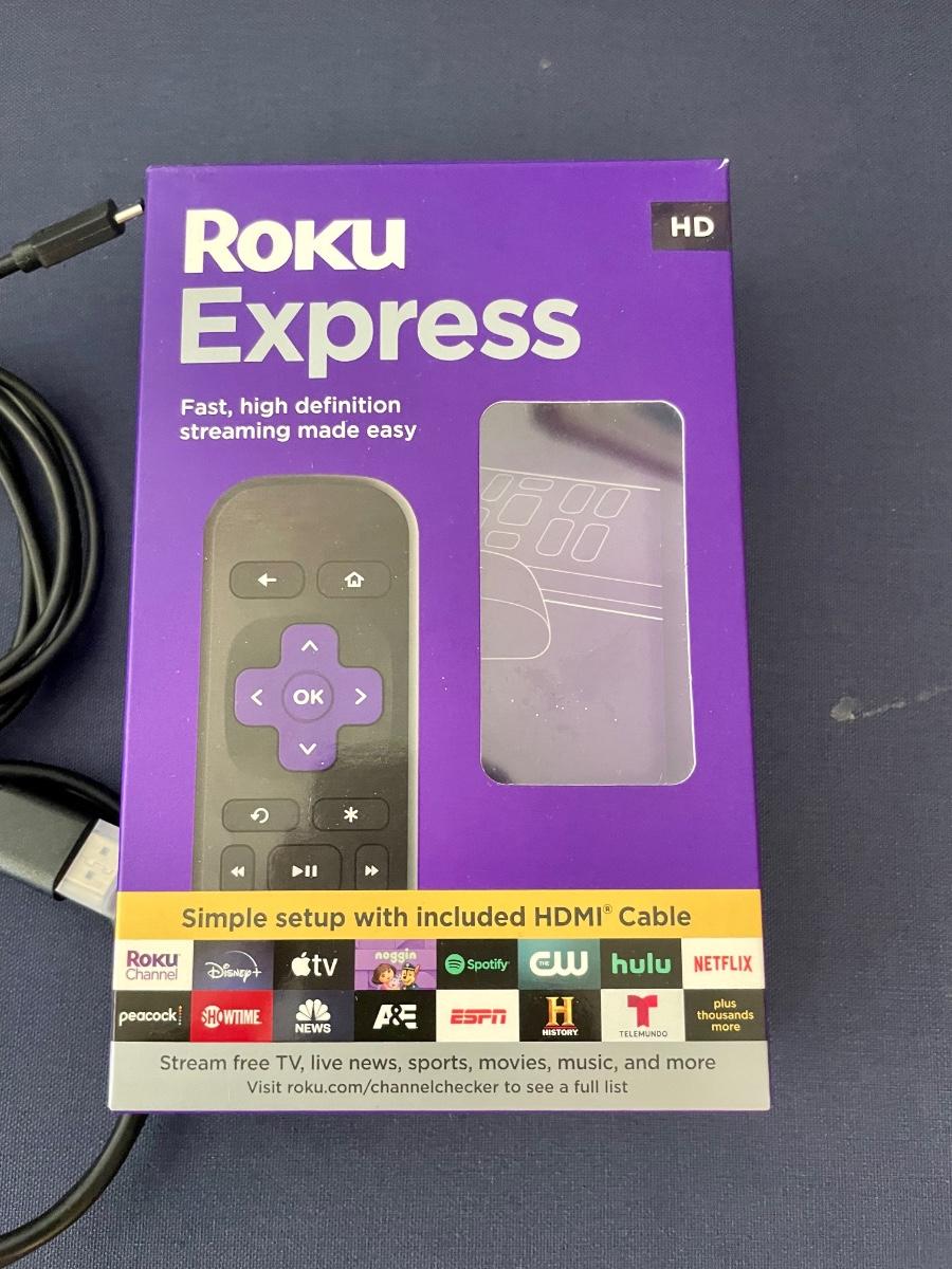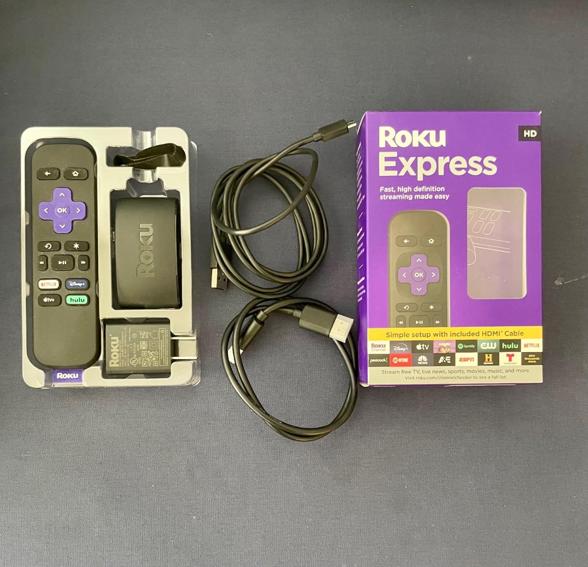 Roku Express Streaming Device Kit, includes remote and connection cables. Tested, works perfectly.