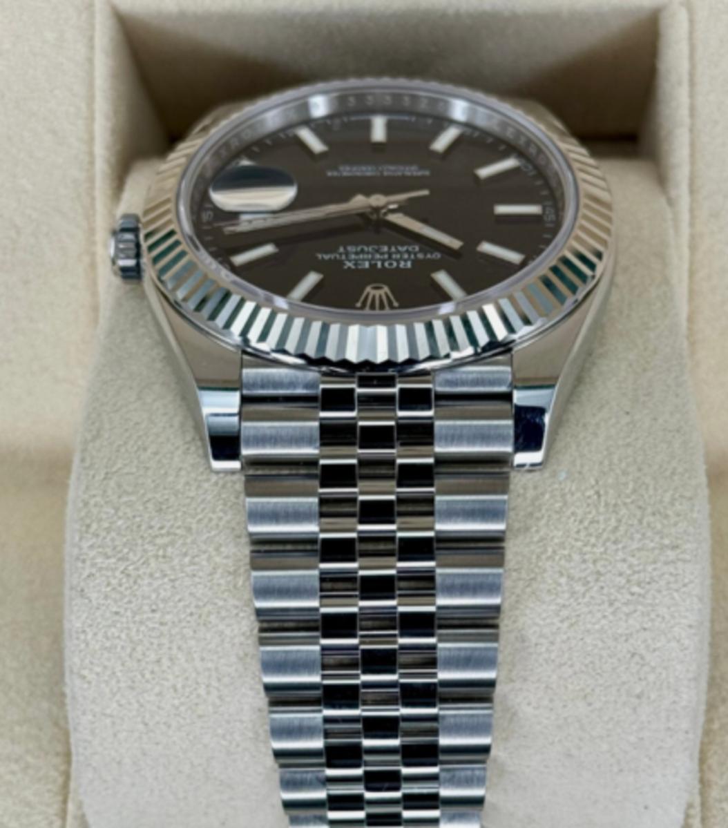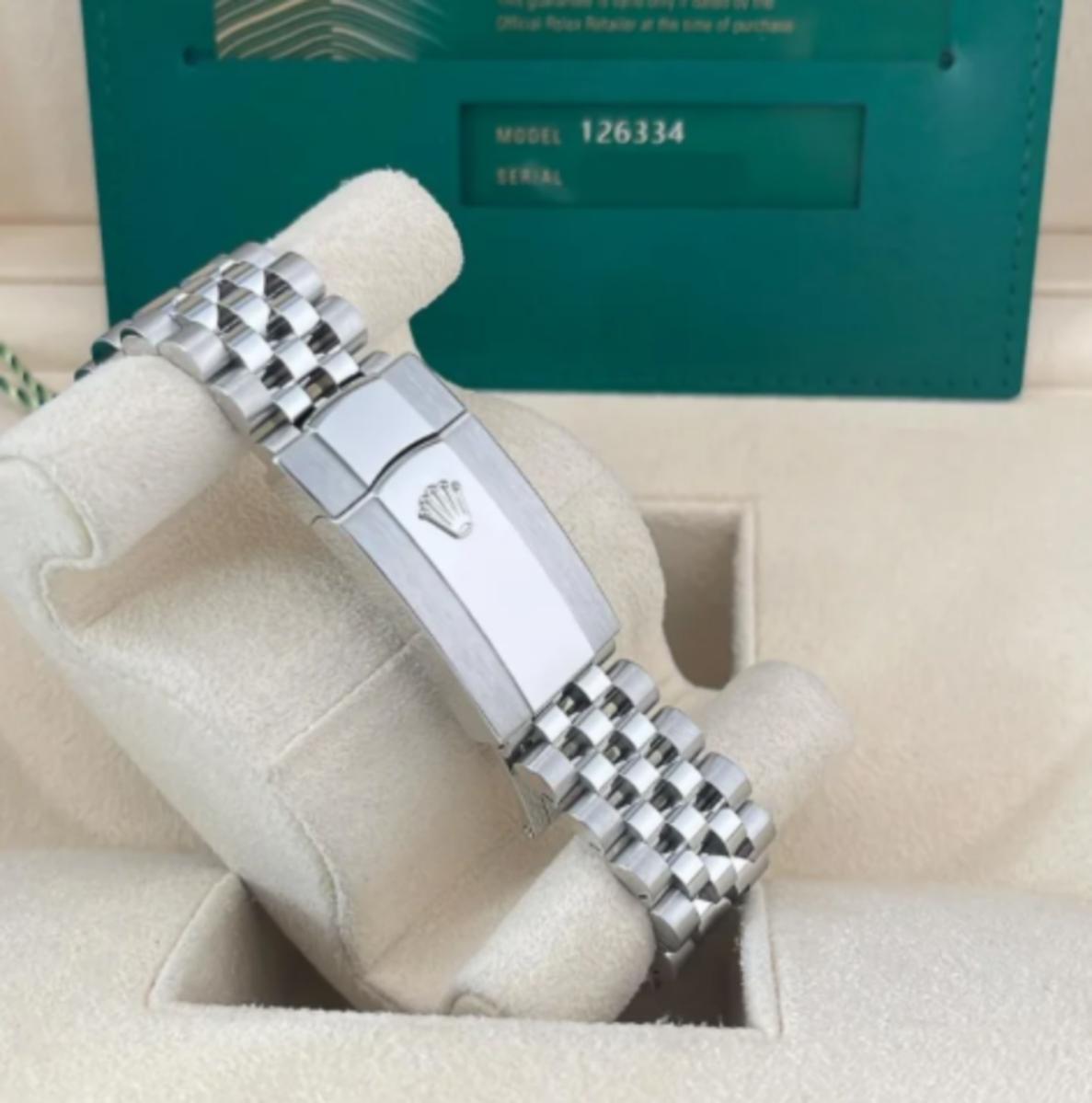 Reference 126334 has a stainless steel case and a white gold fluted bezel. It is fitted with either an Oyster or Jubilee bracelet.