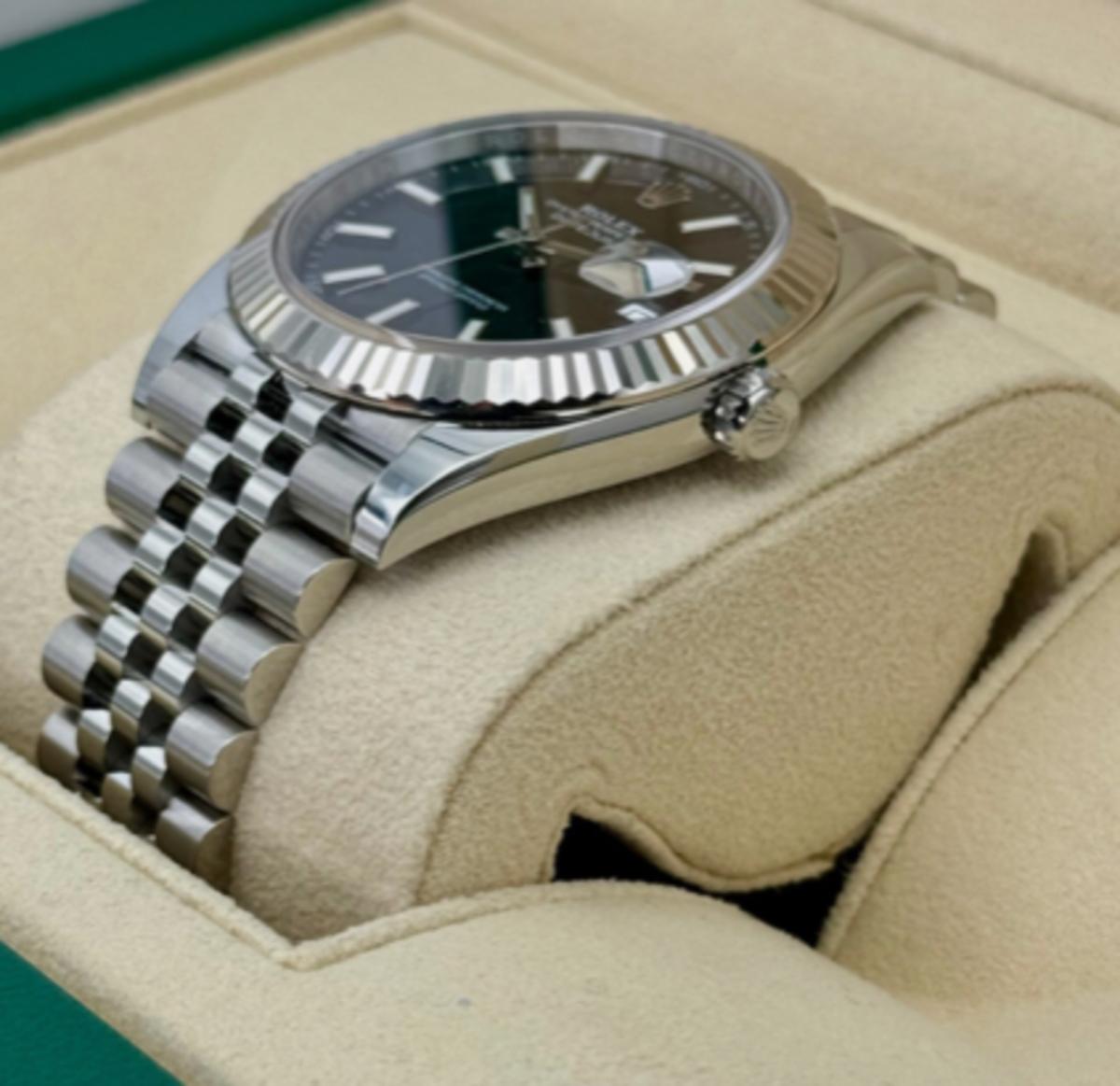 Reference 126334 has a stainless steel case and a white gold fluted bezel. It is fitted with either an Oyster or Jubilee bracelet.