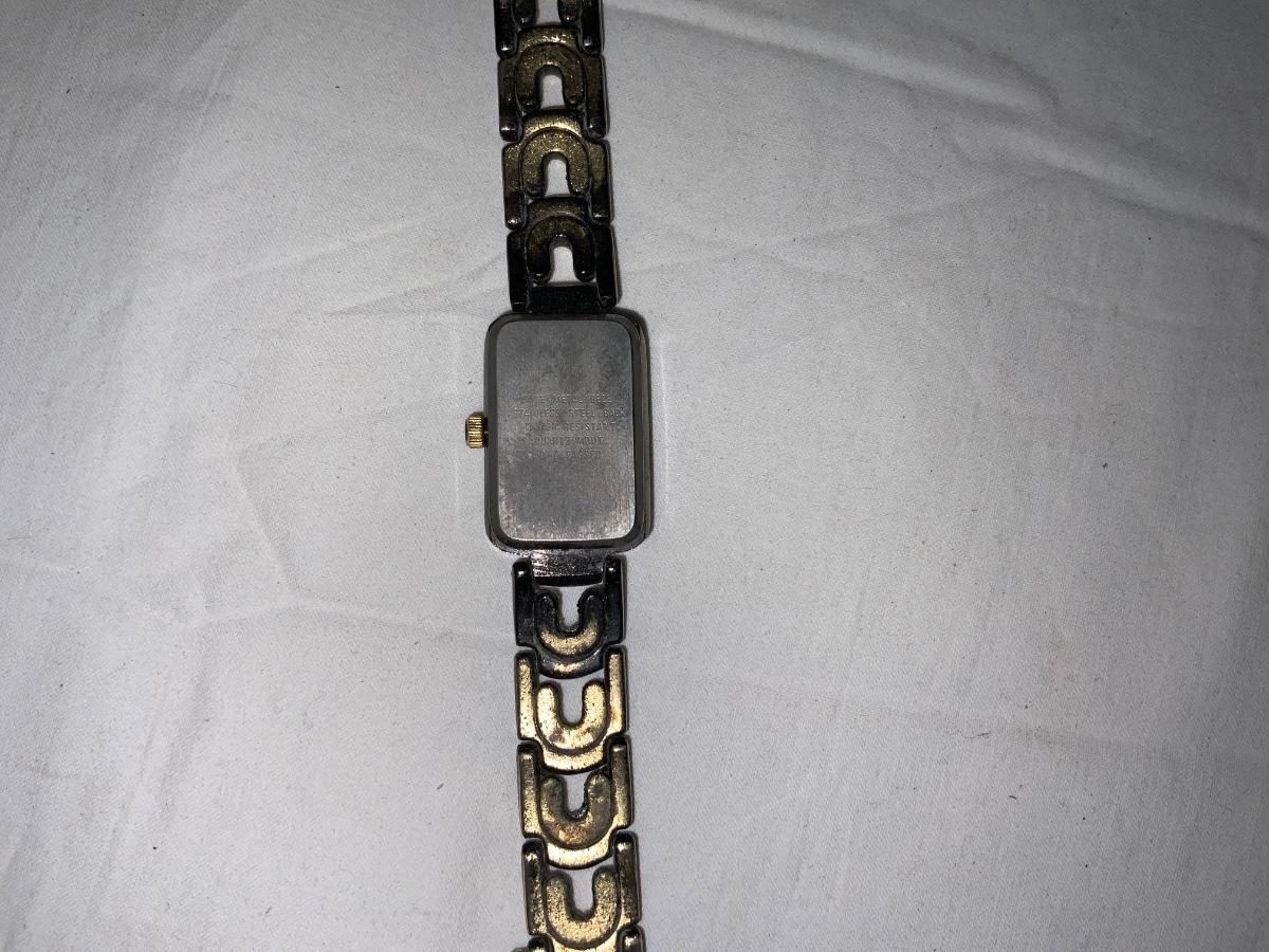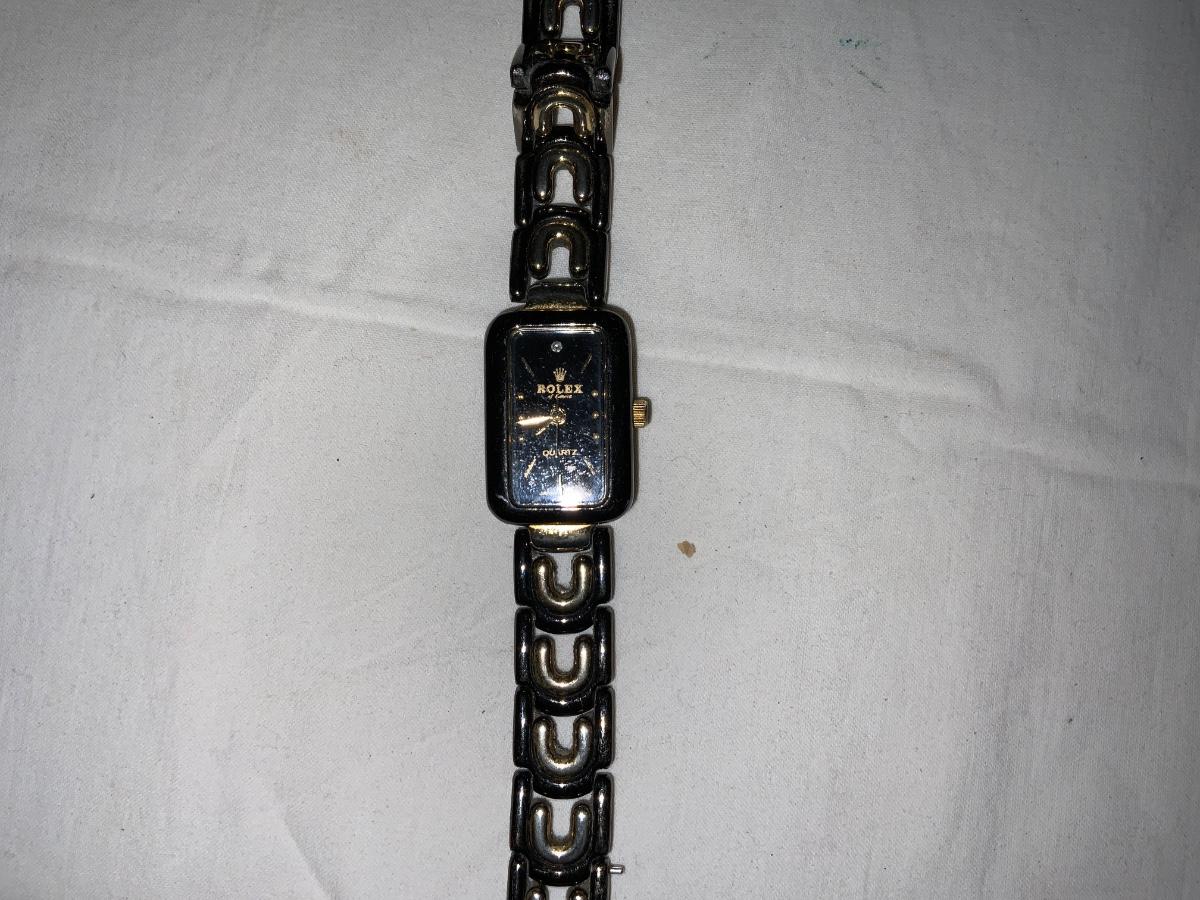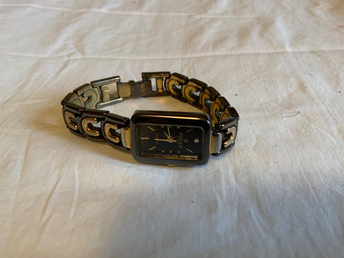 Well loved Rolex Watch in Gunmetal and gold. Face says Rolex Quartz, Japan MOVT. Not tested or verified to be a real Rolex. Please see pictures for condition.
