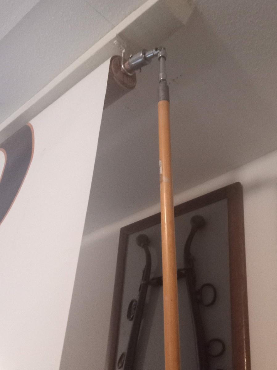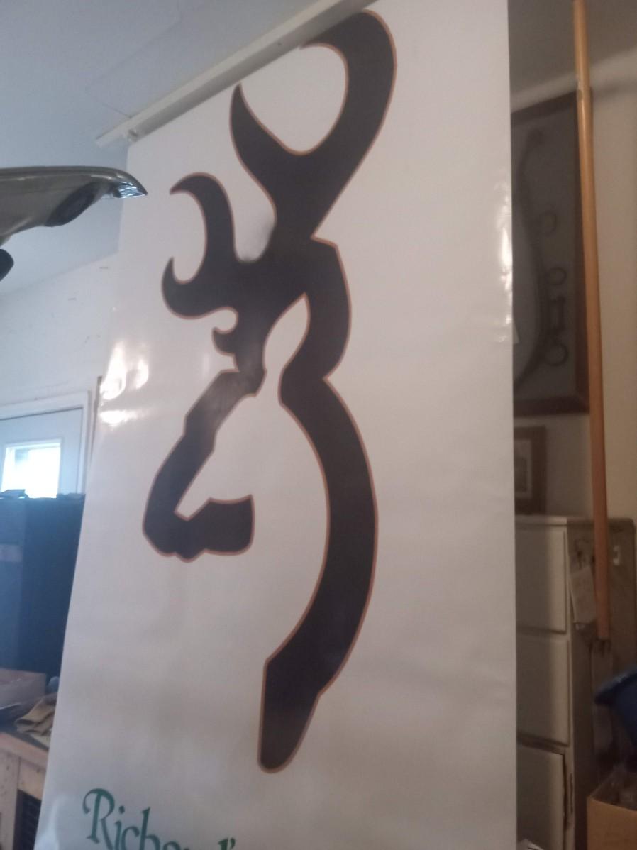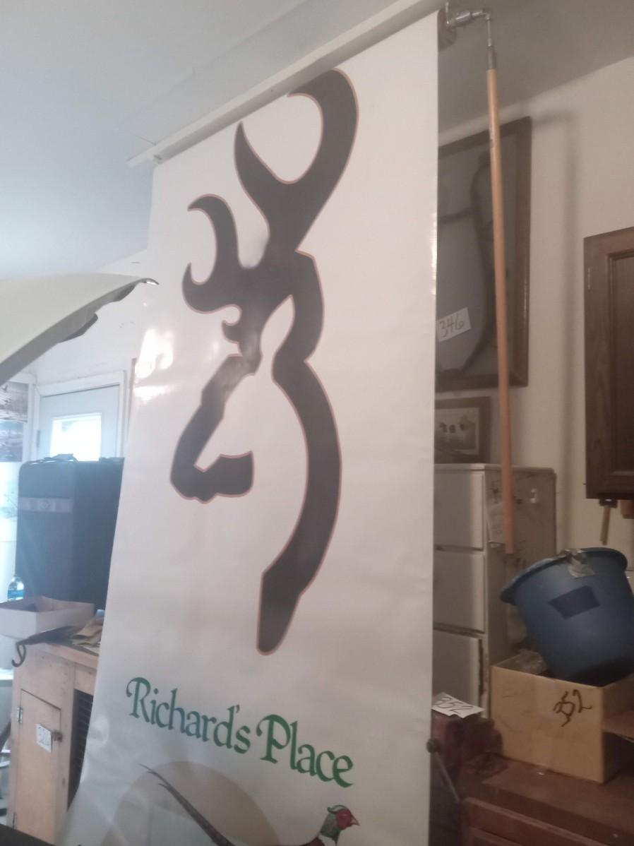 THE BANNER IS ON A WOODEN TUBE THAT CAN EASILY BE ROLLED UP OR DOWN IT MEASURES APPROX 7 1/2' X 4'
