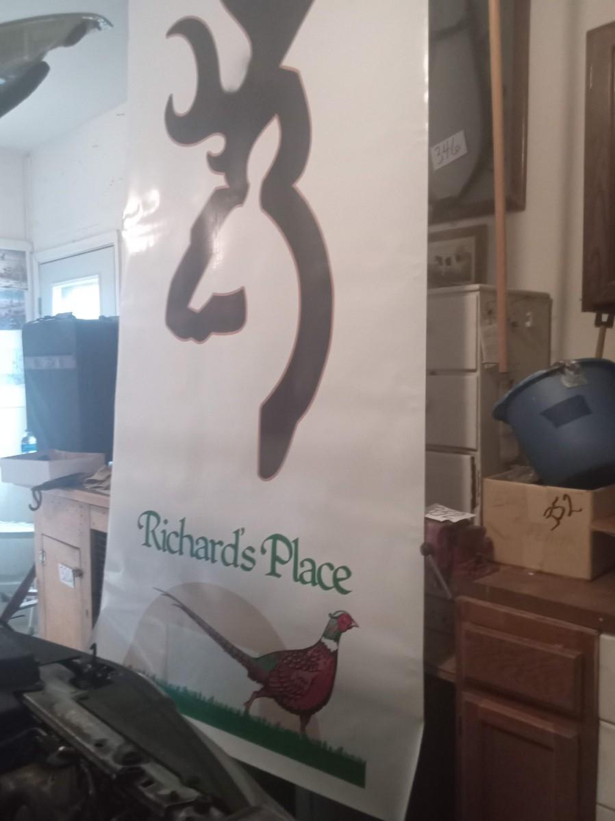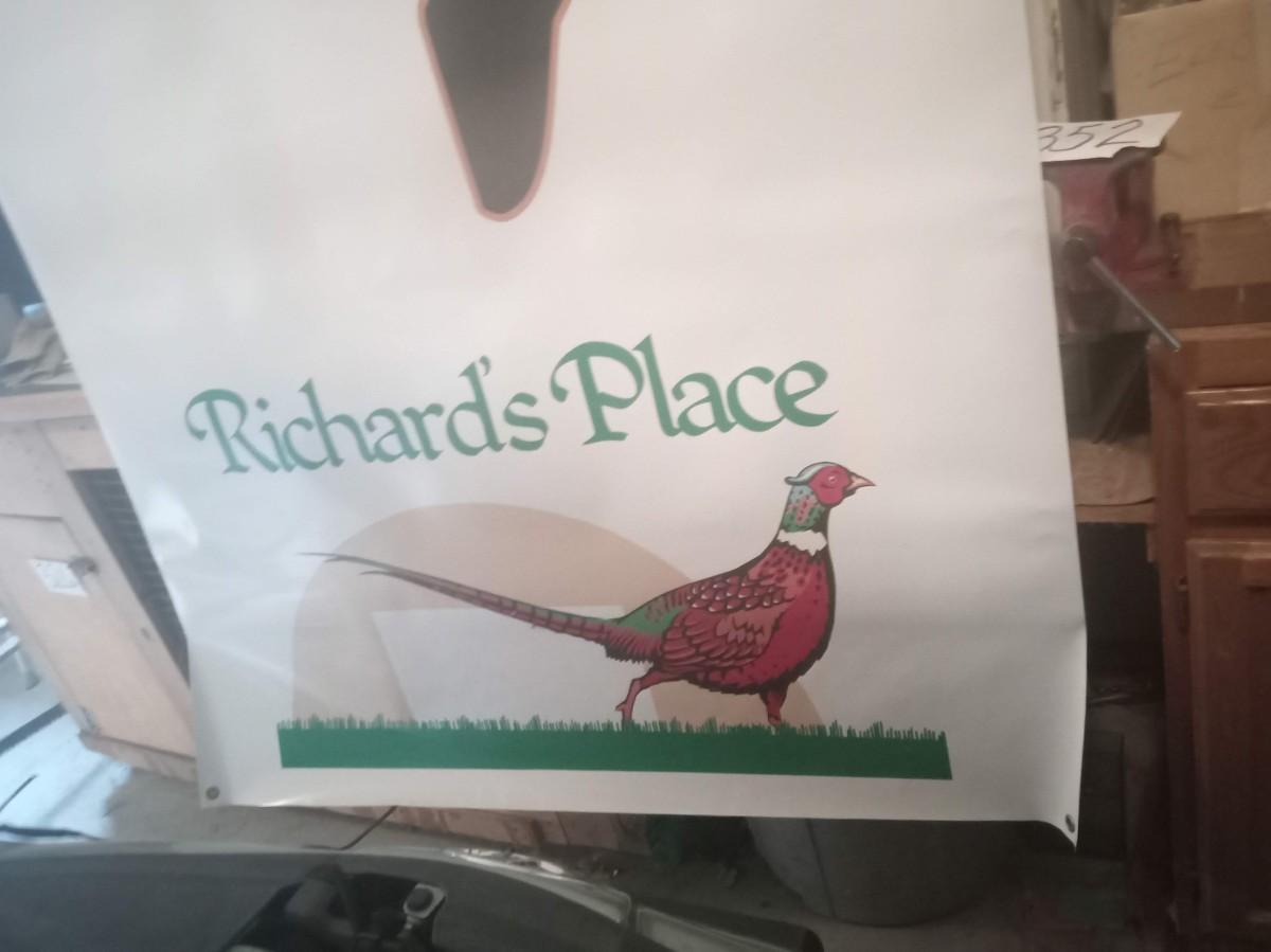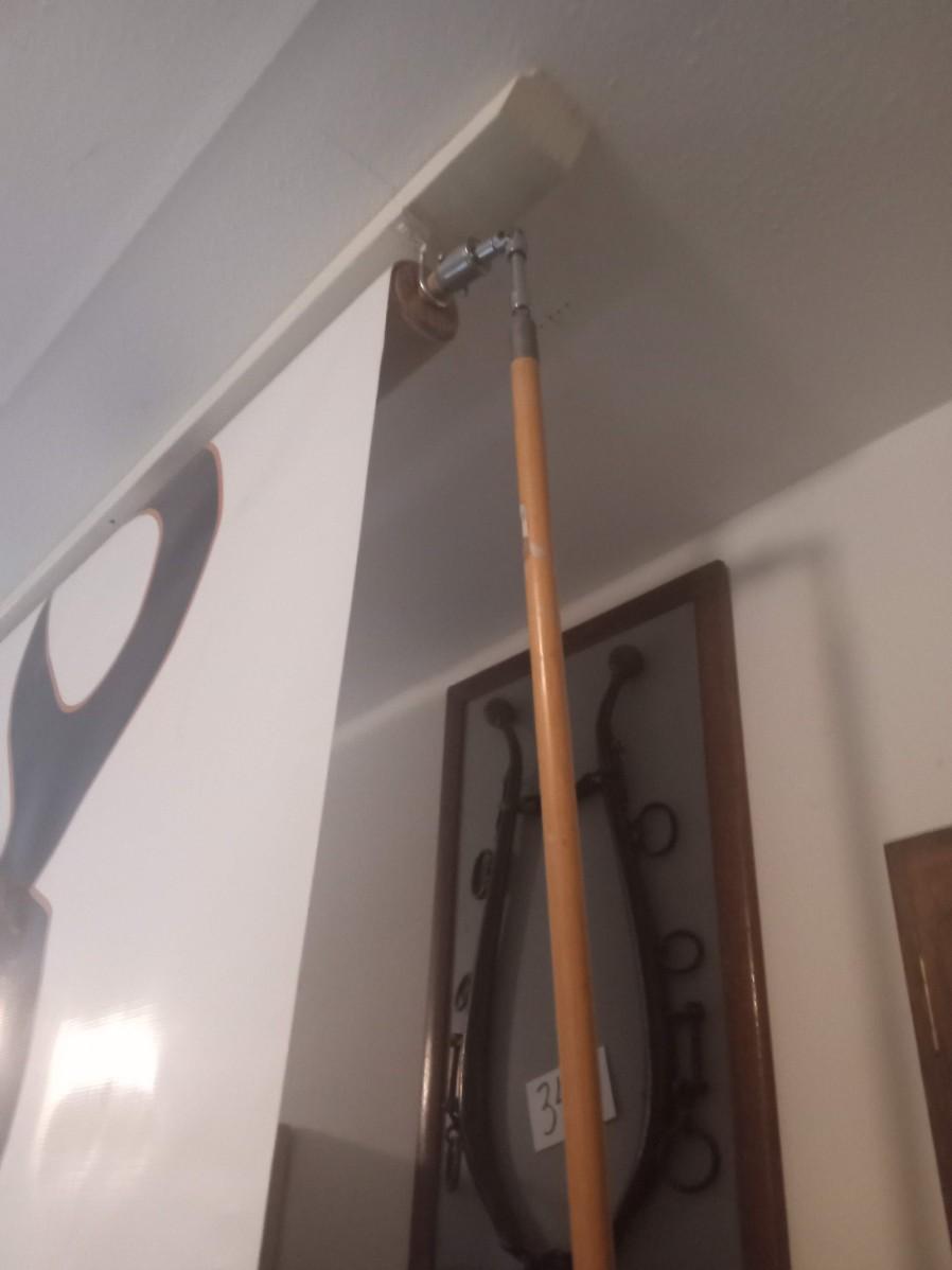 THE BANNER IS ON A WOODEN TUBE THAT CAN EASILY BE ROLLED UP OR DOWN IT MEASURES APPROX 7 1/2' X 4'