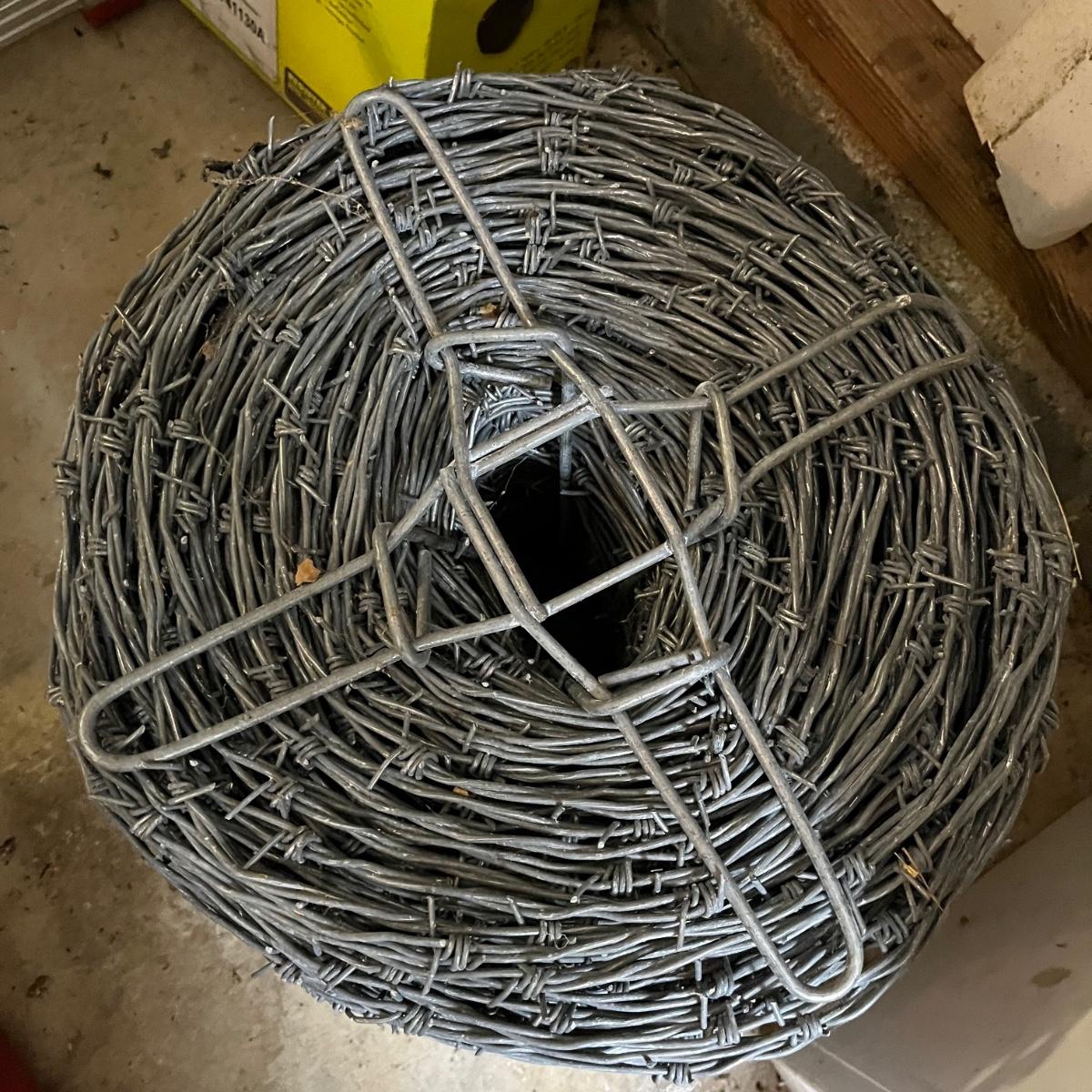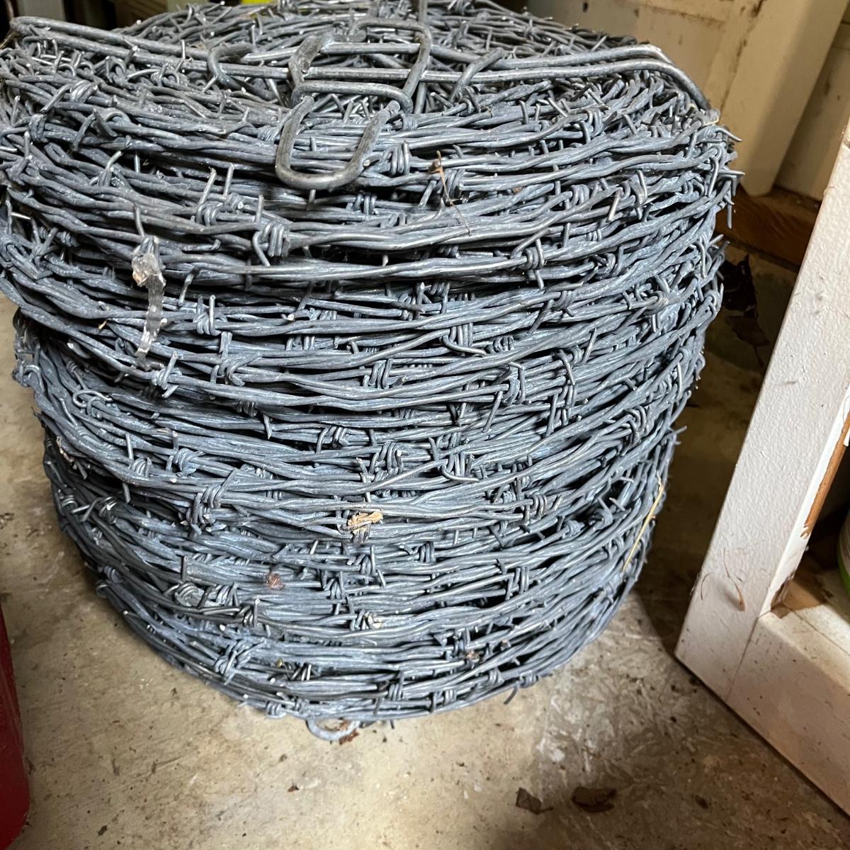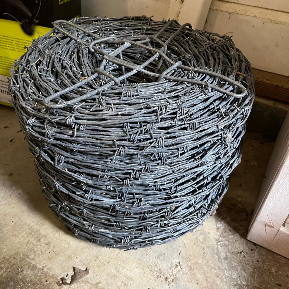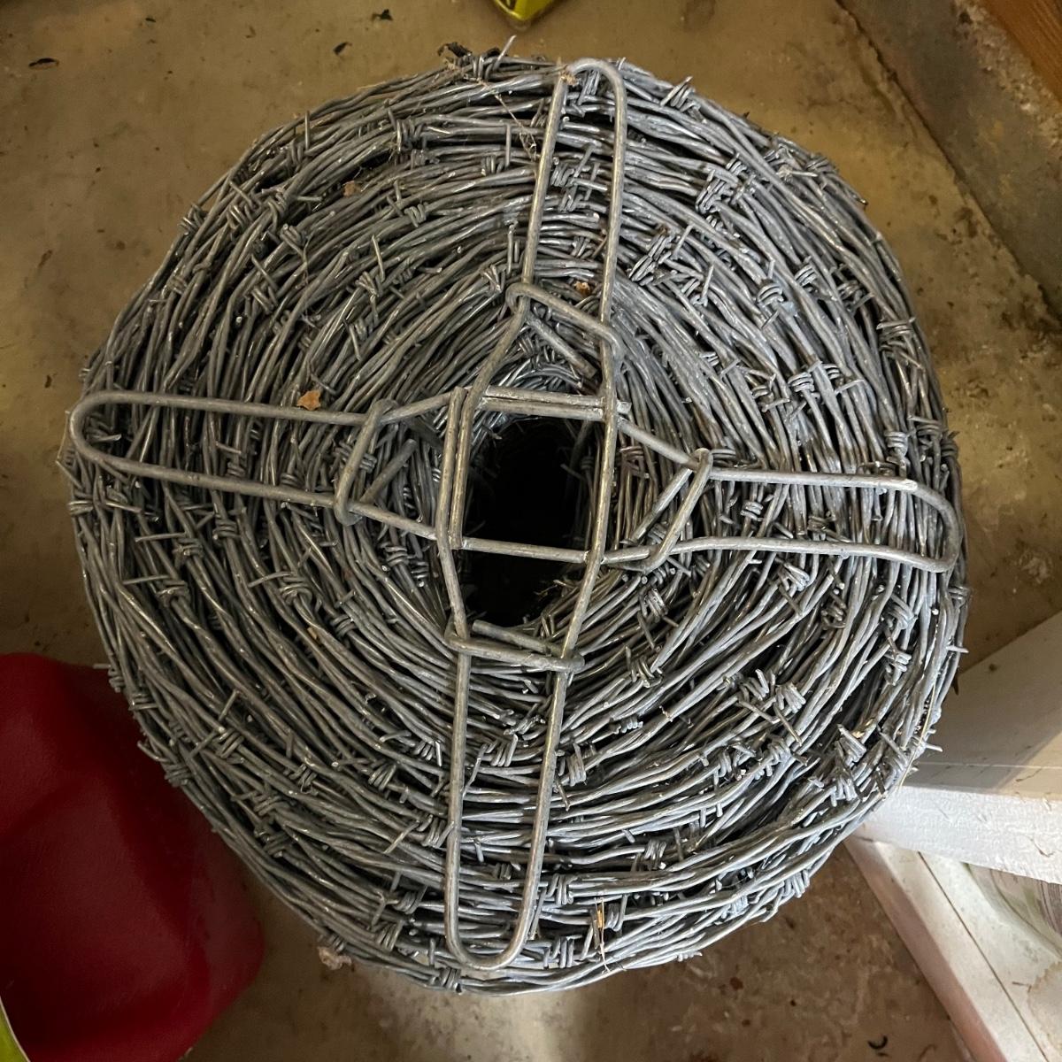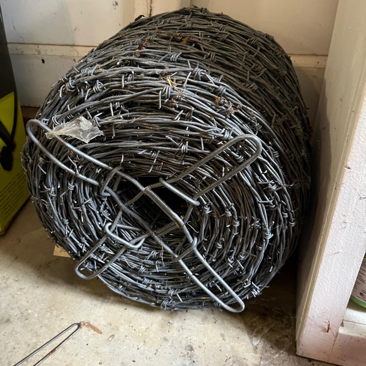 Lot includes a large roll of barb wire. Roll measures 15”D x 12” tall.