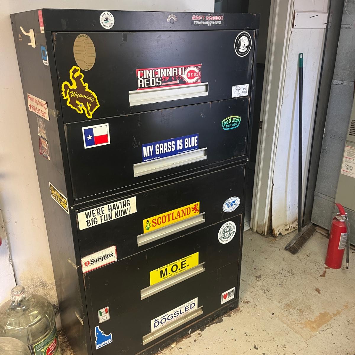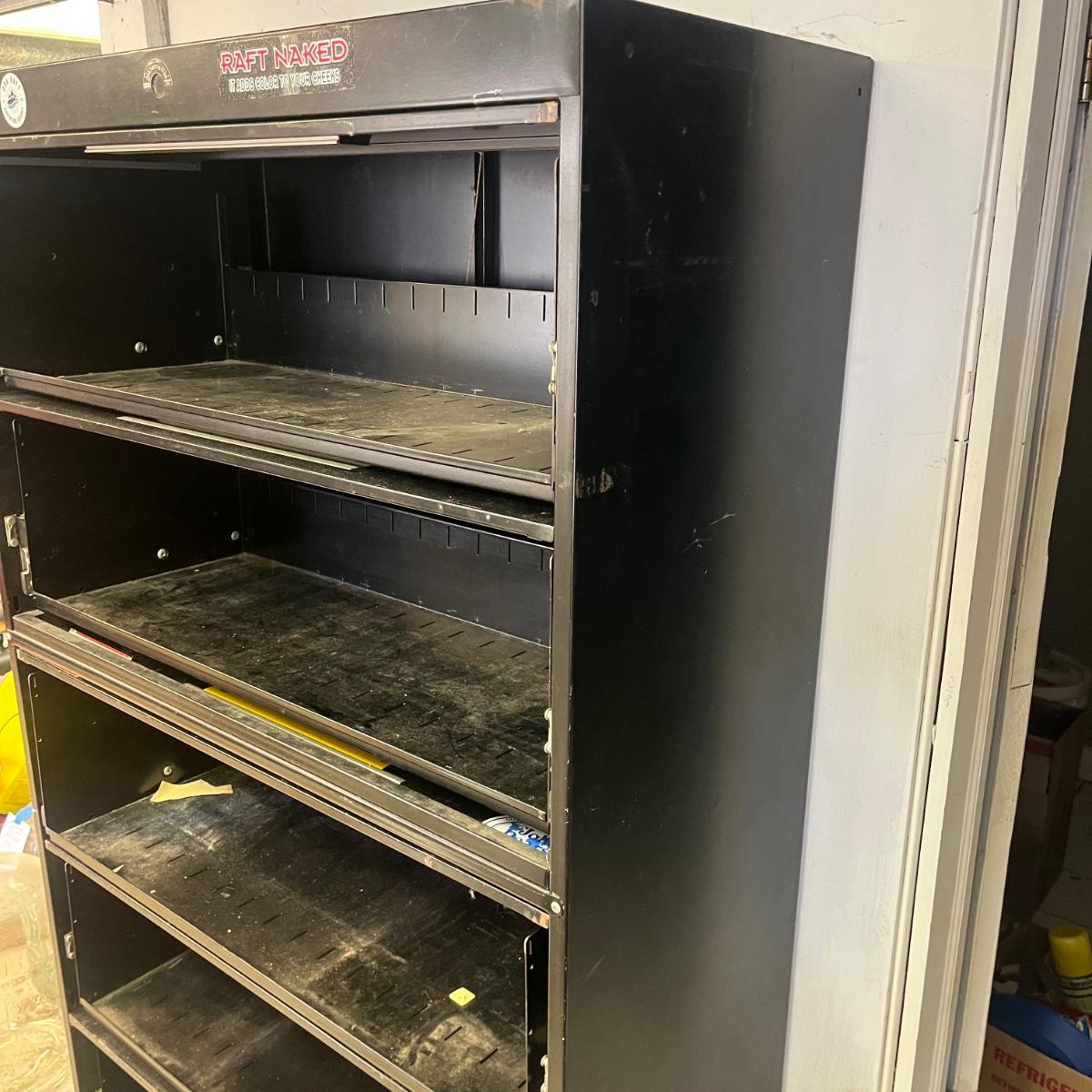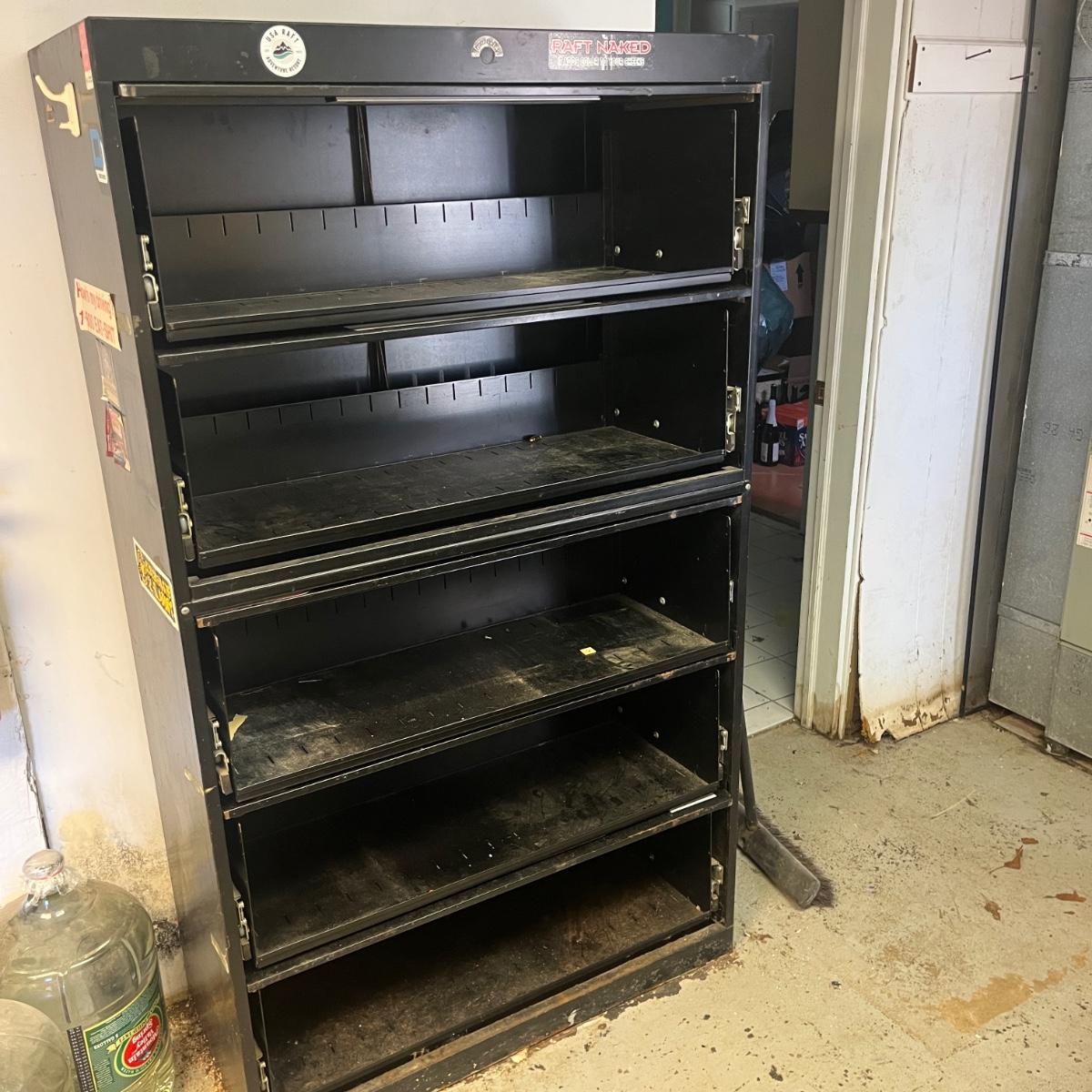 Lot includes a metal five drawer Roll Out Conserve-a-File cabinet with rollout drawers. Cabinet has scratches, nicks and rust. Cabinet measures 37” x 17” x 59”H.