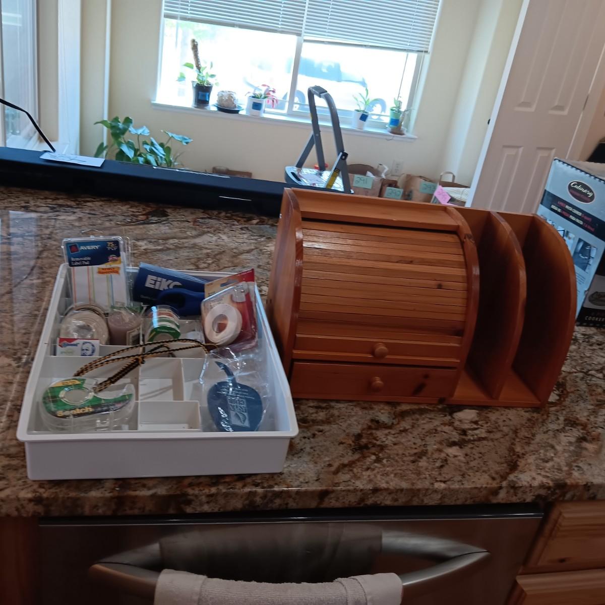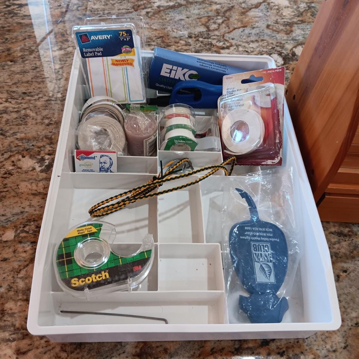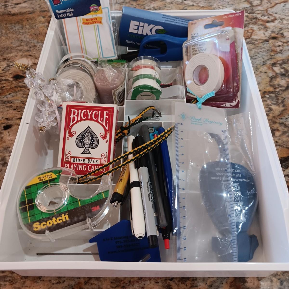ROLL TOP ORGANIZER AND SOME SUPPLIES IN A DRAWER ORGANIZER