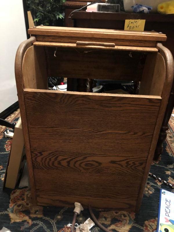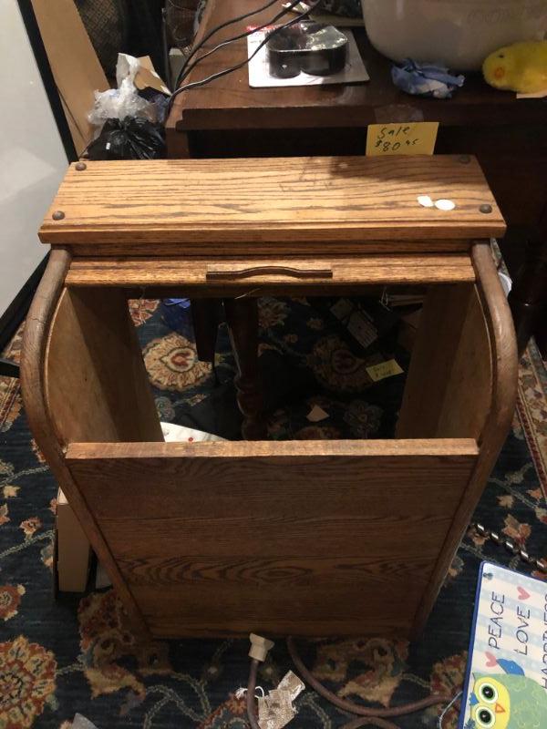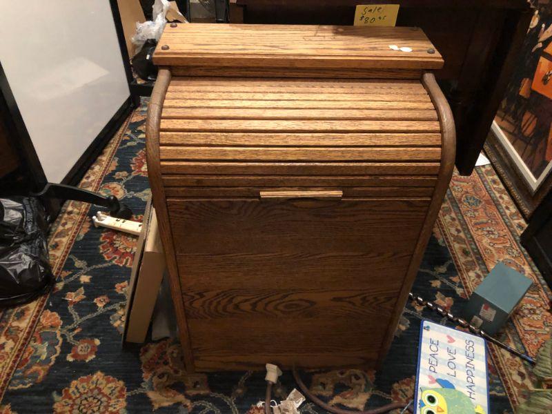 OAK ROLL TOP TRASH BIN. HOW CUTE IS THIS FOR YOUR KITCHEN AND A WONDERFUL WAY TO DECORATIVELY HIDE YOUR TRASH. ENJOY!!!