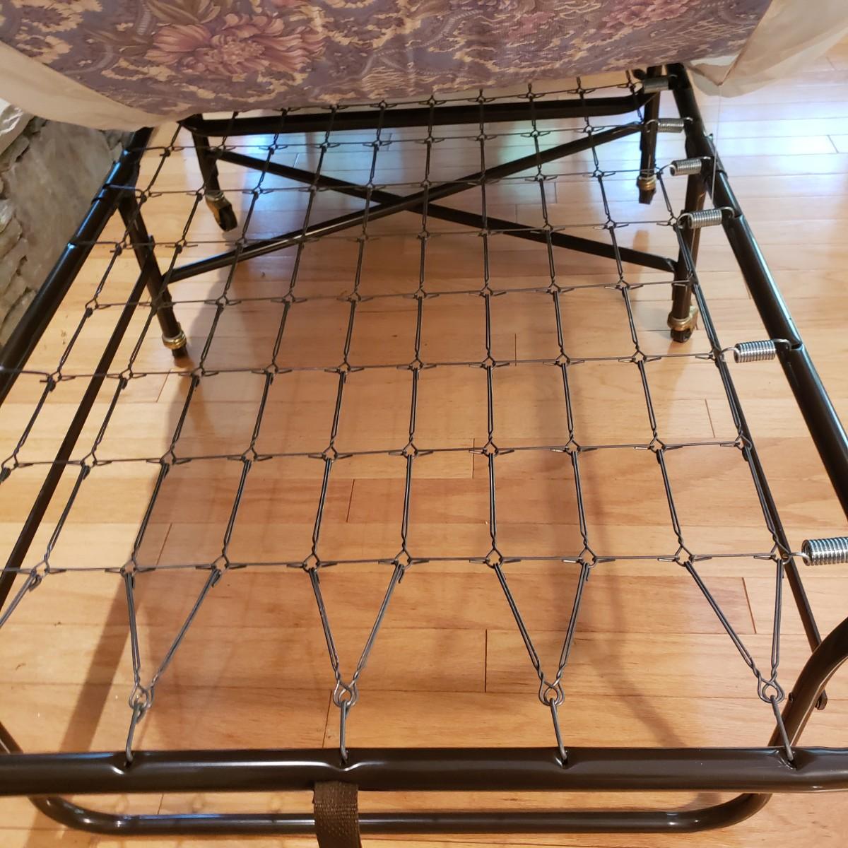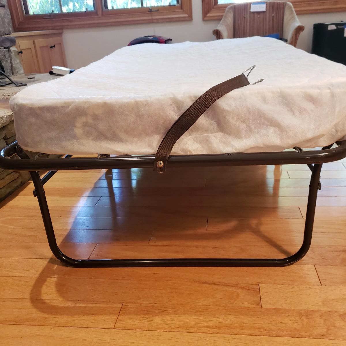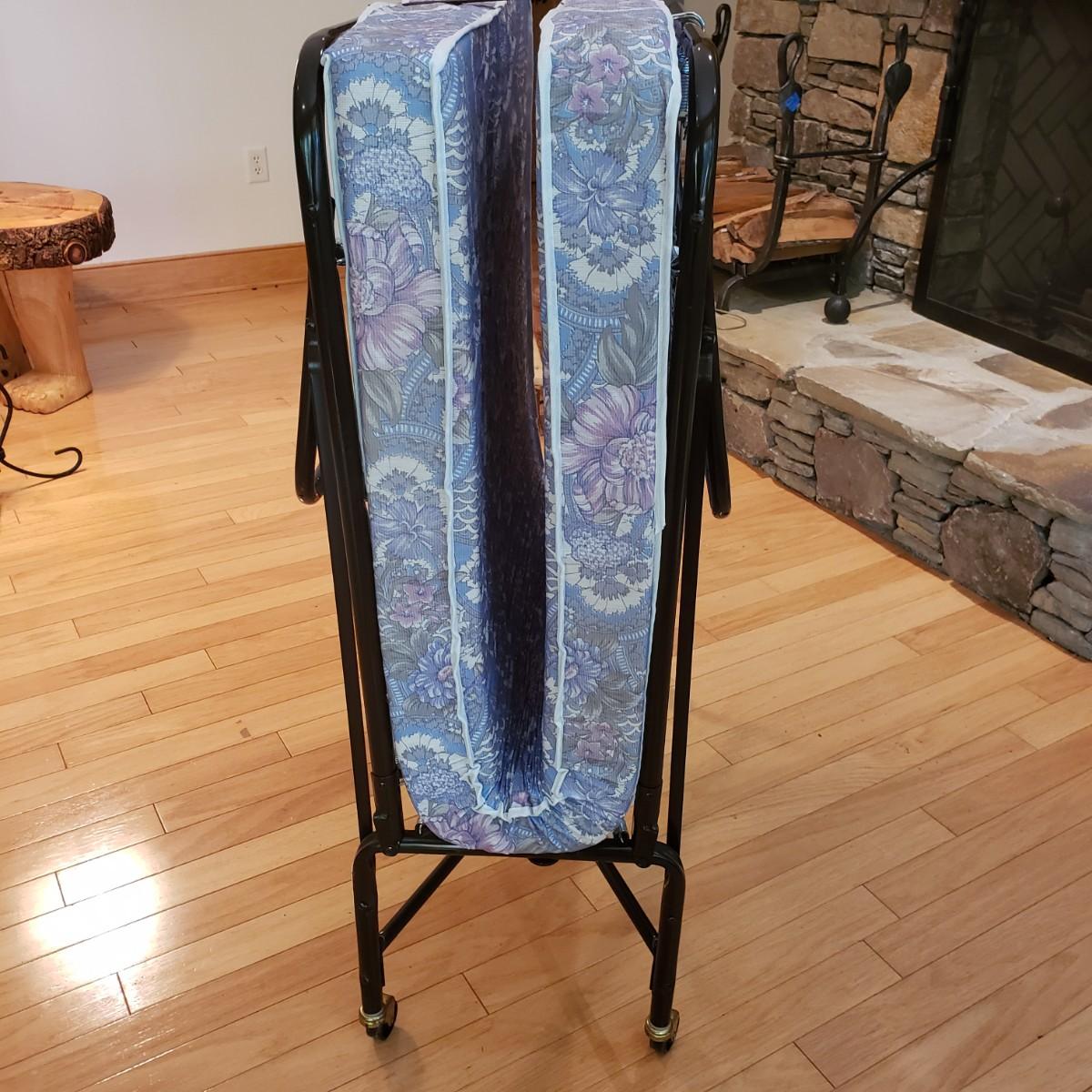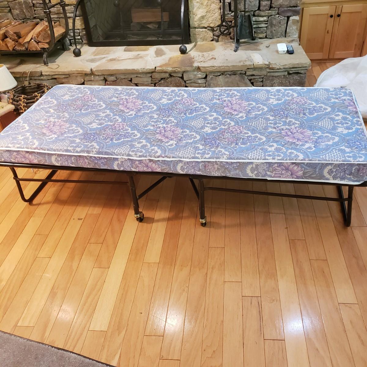 This metal rollaway cot measures 74" x 30" x 18"H unfolded. Folded it measures 14" x 30" x 47"H. The mattress is a firm foam covered in a floral print cloth pattern, with no visible blemishes. The cot has four wheels for easy movement. There is a locking strap for easy storage.
