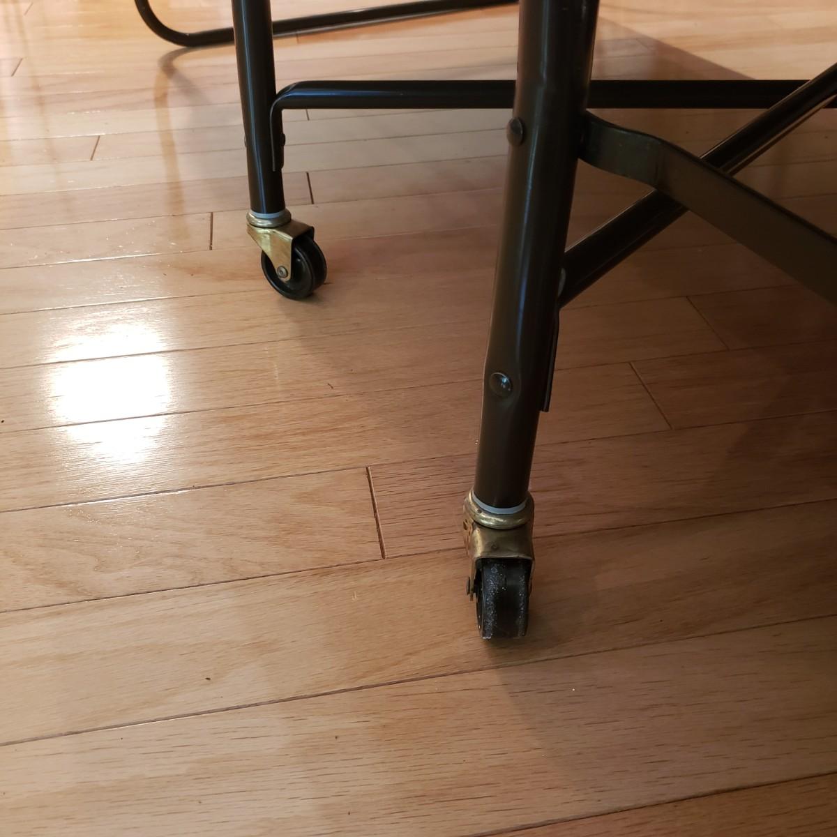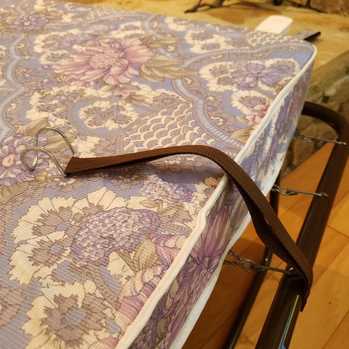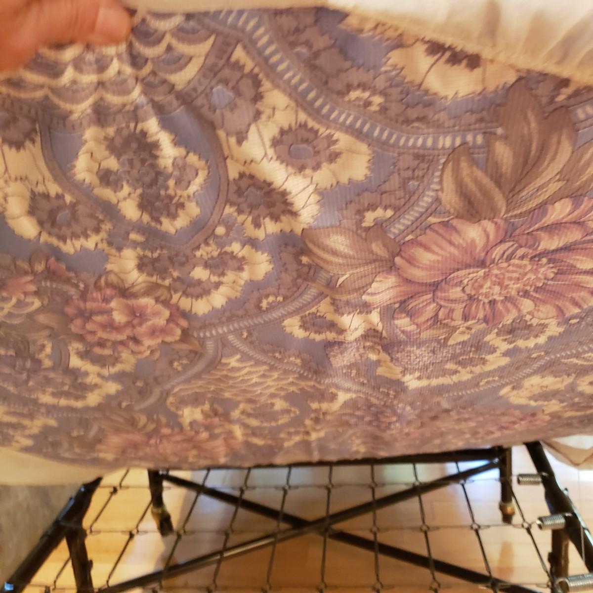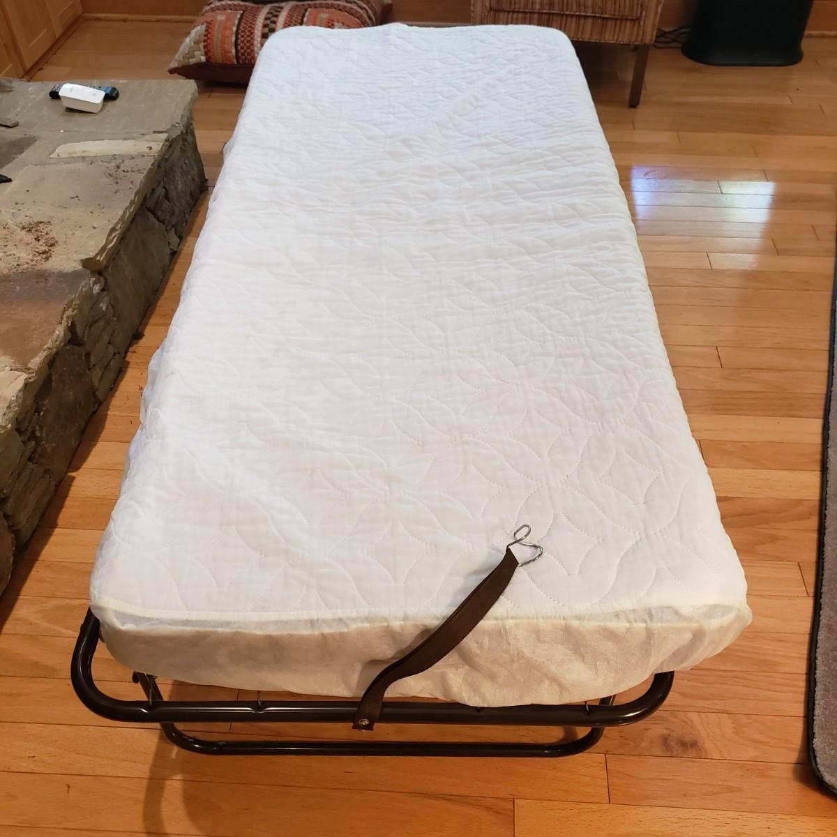 This metal rollaway cot measures 74" x 30" x 18"H unfolded. Folded it measures 14" x 30" x 47"H. The mattress is a firm foam covered in a floral print cloth pattern, with no visible blemishes. The cot has four wheels for easy movement. There is a locking strap for easy storage.