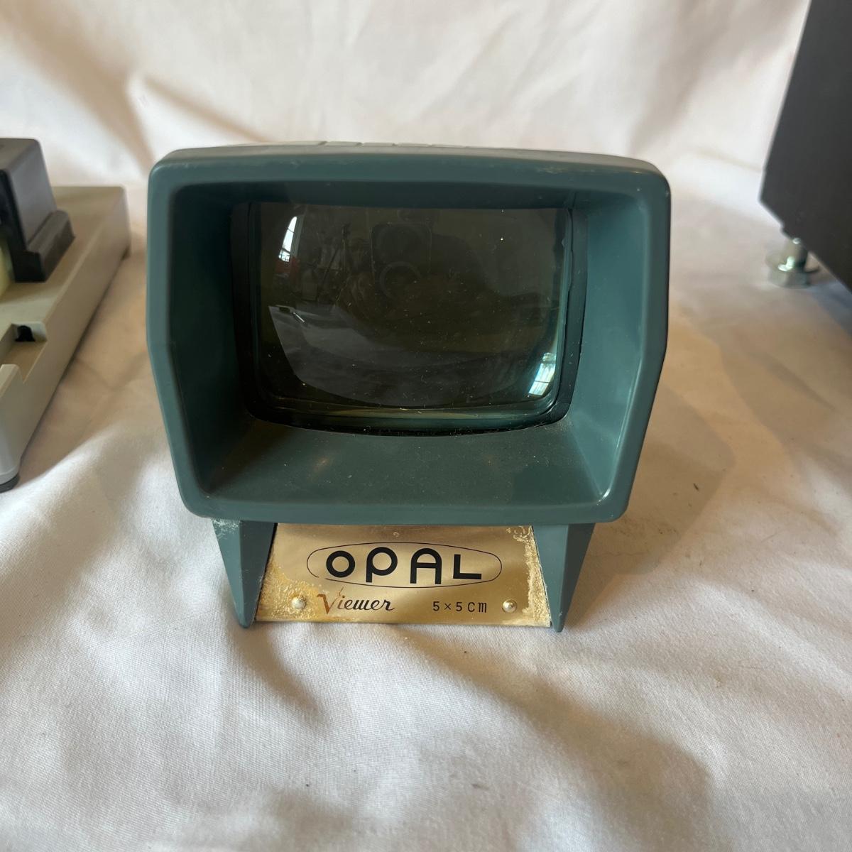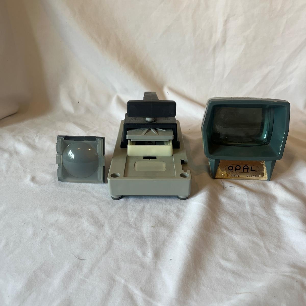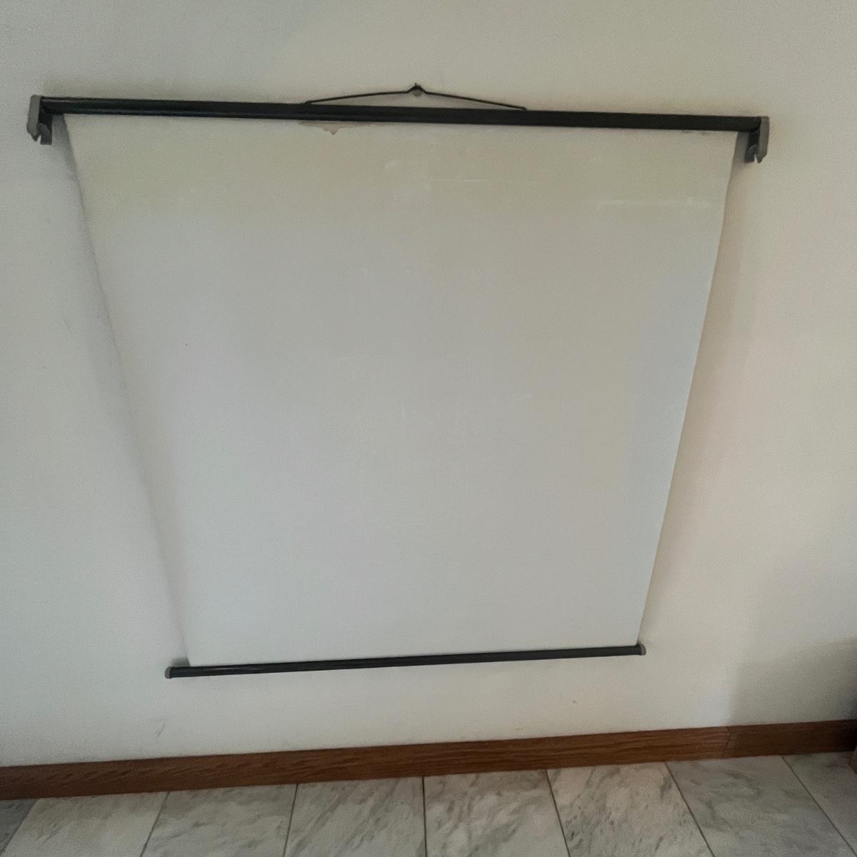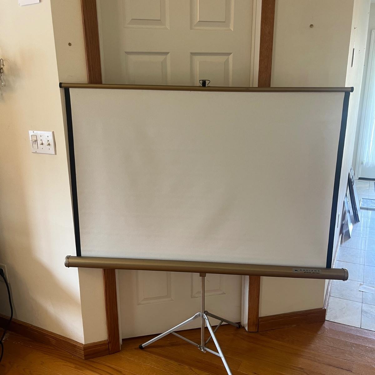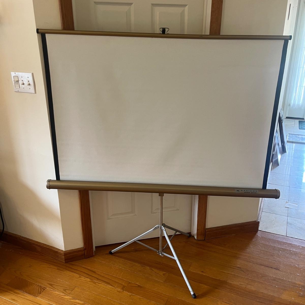 Lot includes a Rollei slide projector that powered on when plugged in. Radiant screen with stand that measures 55” x 72”H. Also includes hanging screen and a handheld slide viewer.