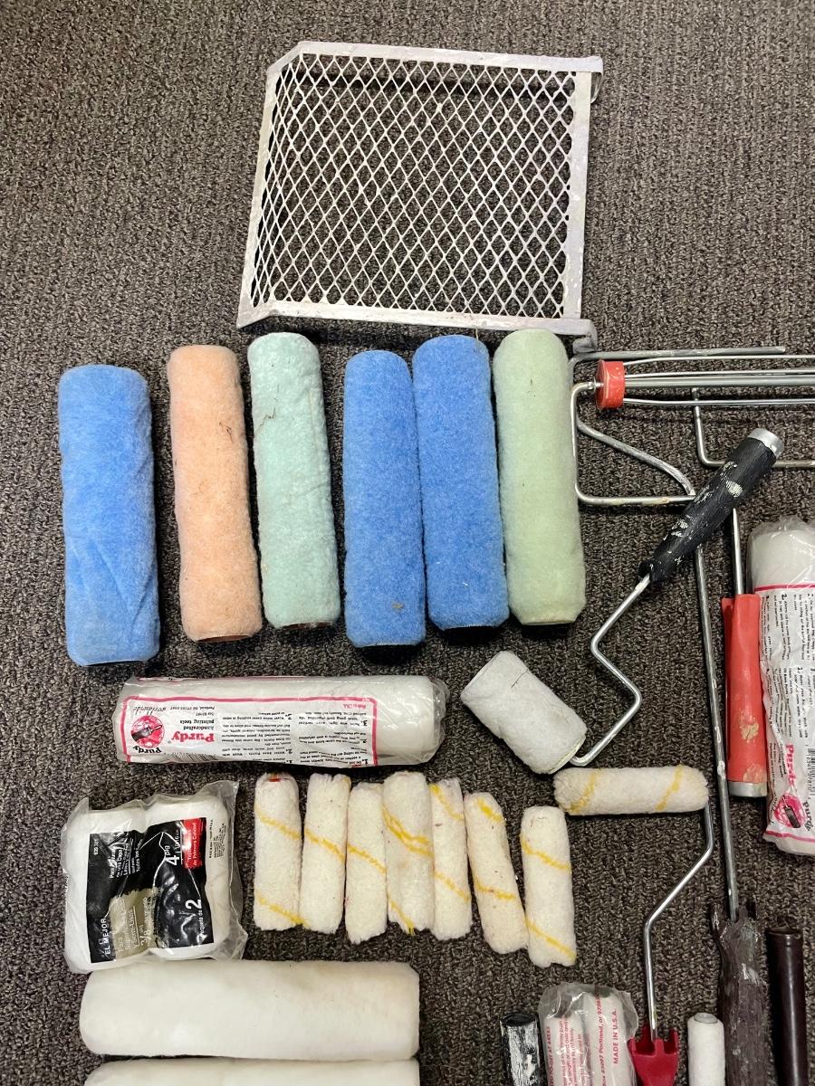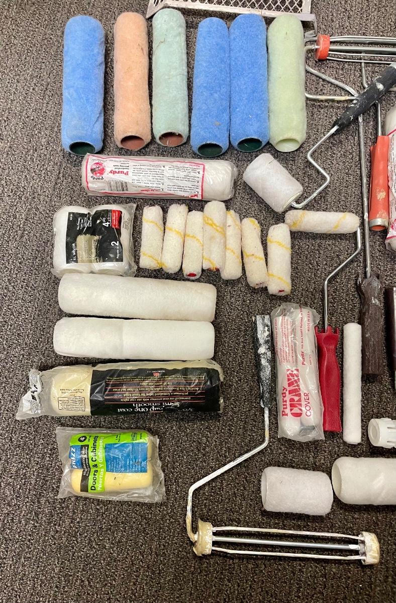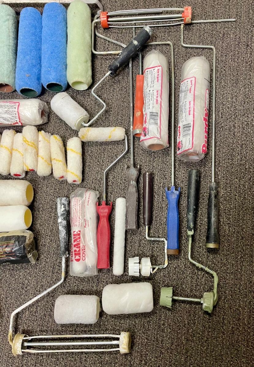 Many sizes of roller handles and rollers, More than 35 pieces, some items are unused and in new condition.