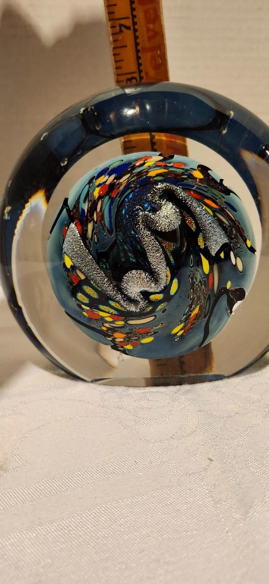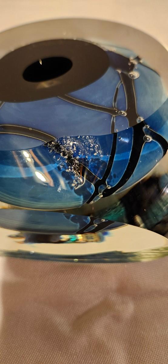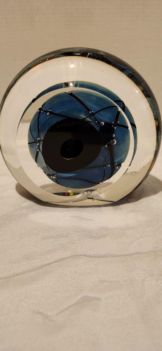 Unique circular glass sculpture by Rollin Karg. . Shows minor shelf wear