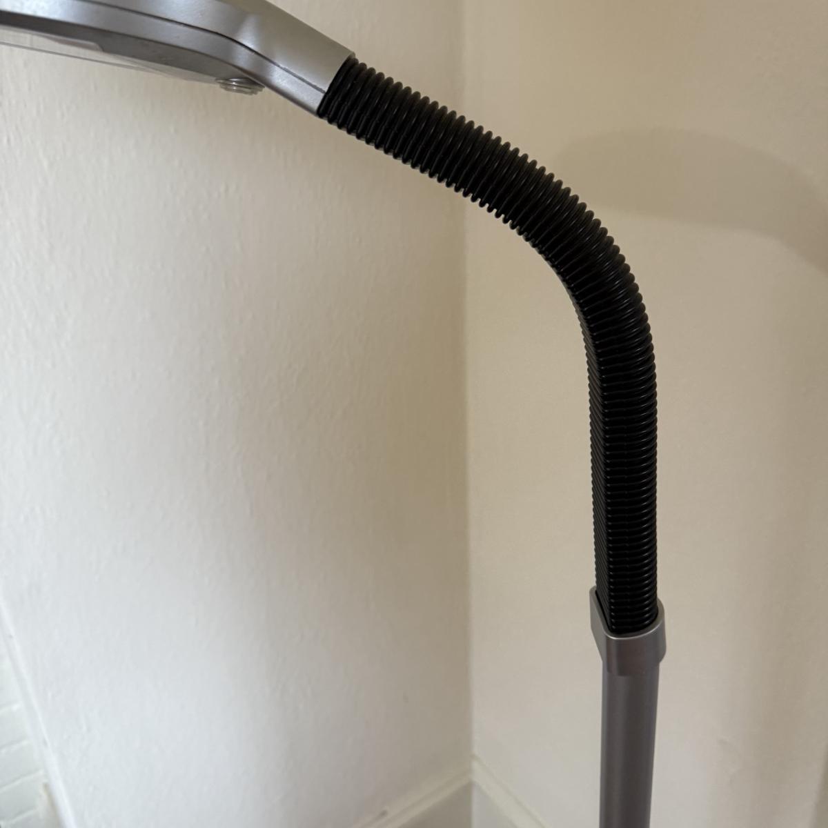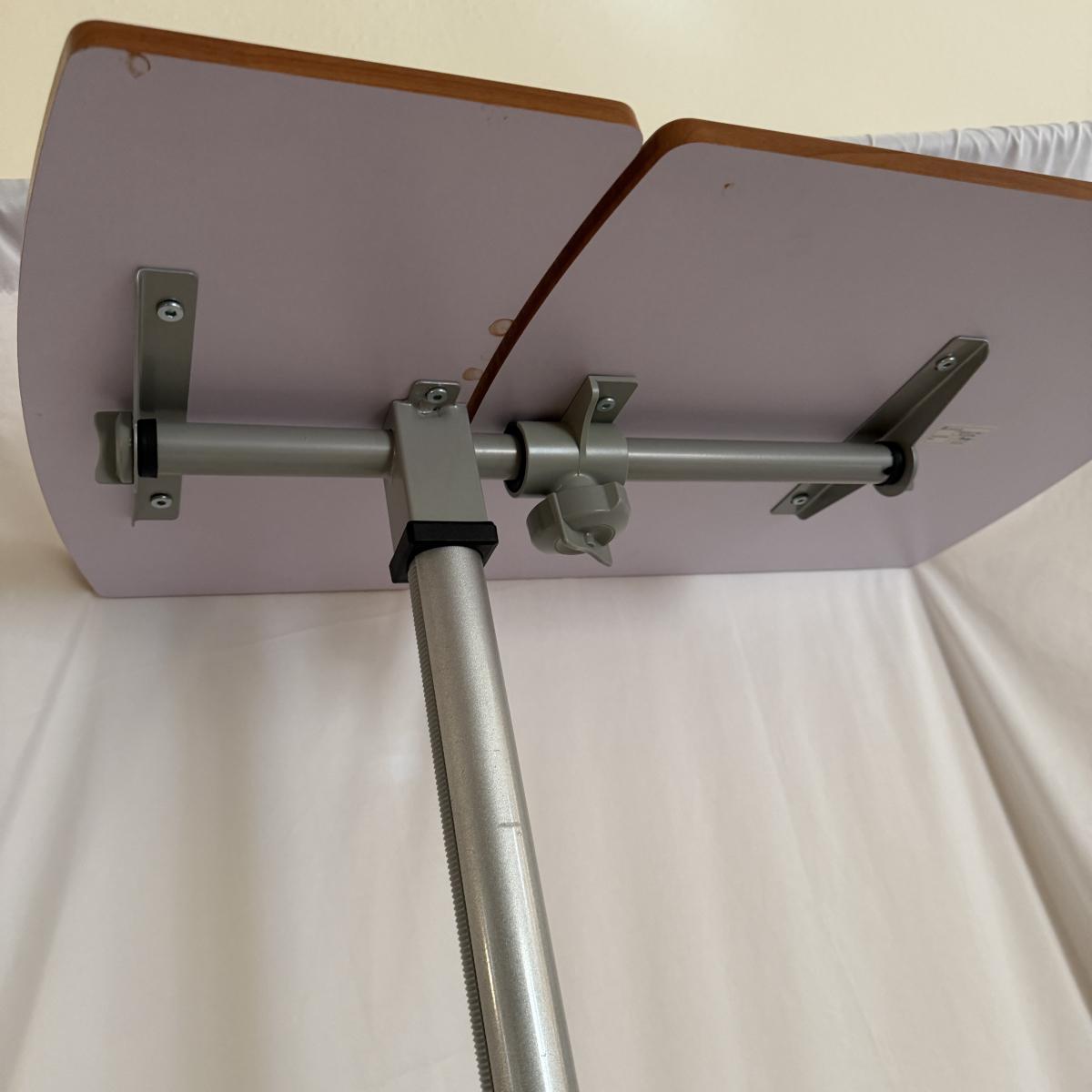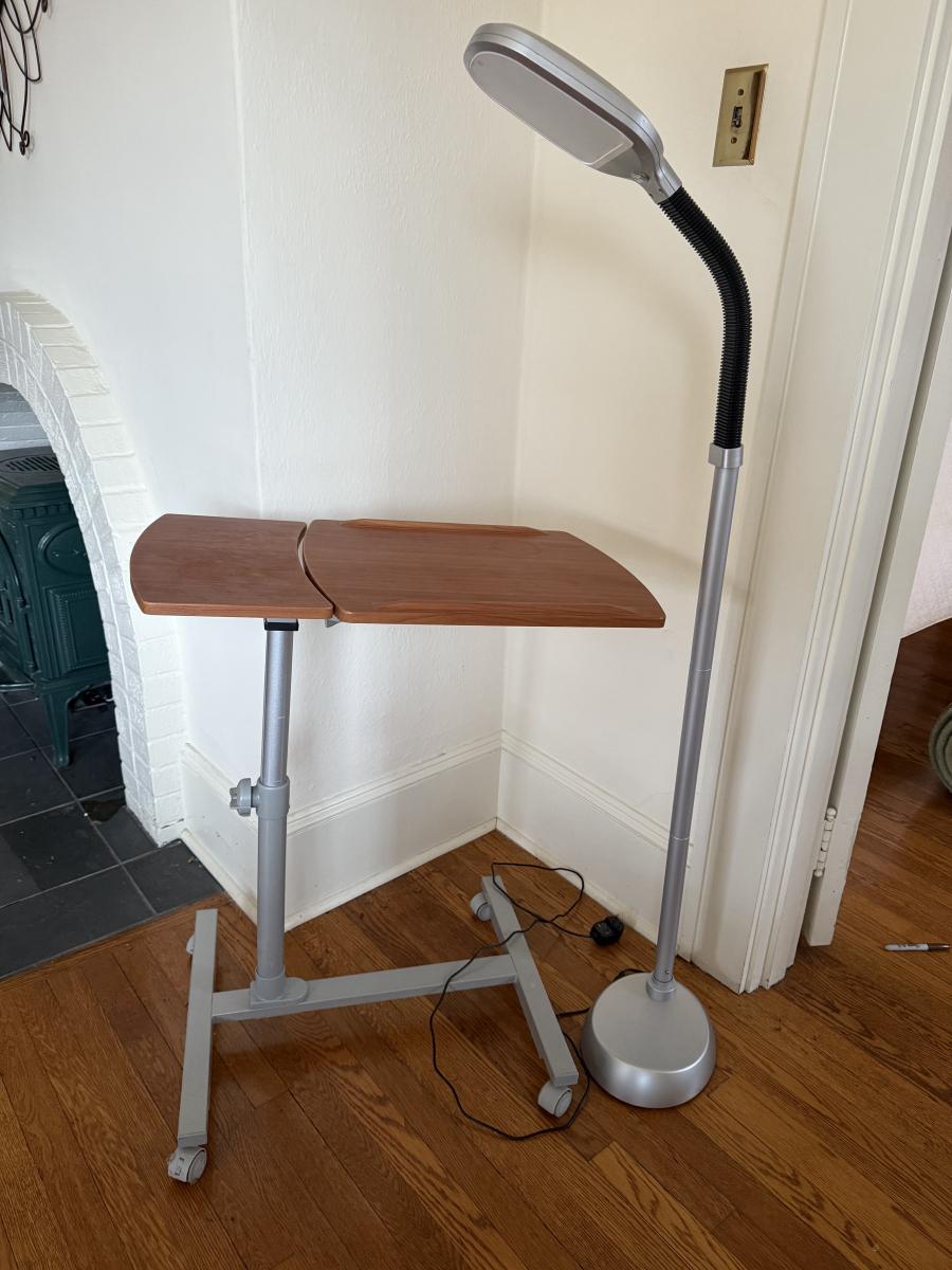 Lot includes a rolling adjustable laptop desk with metal frame and melamine style top. Piece at its tallest setting measures 19” x 23” x 33”H. Also included is a Brightech LED floor lamp reading light. Lamp powered on when plugged in.