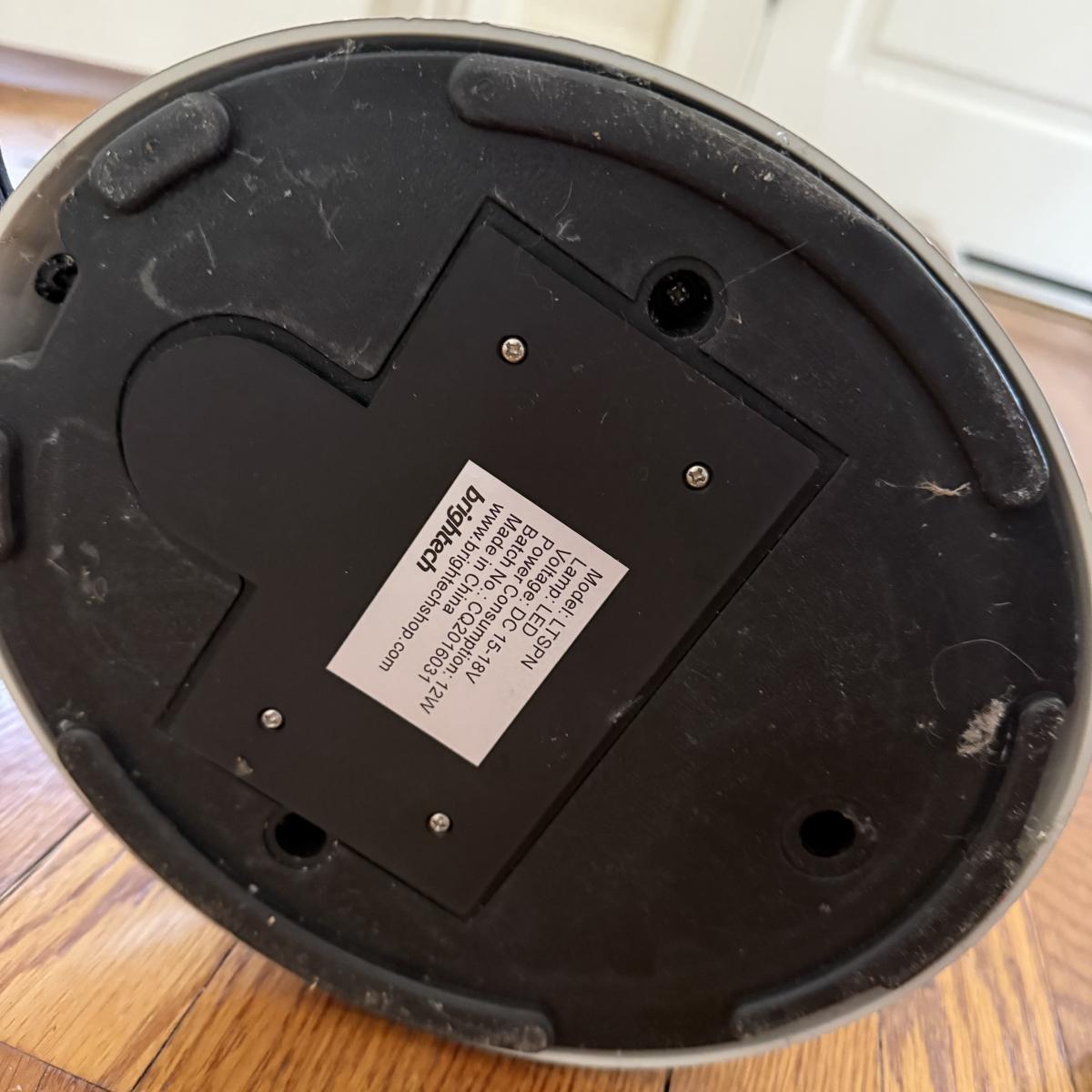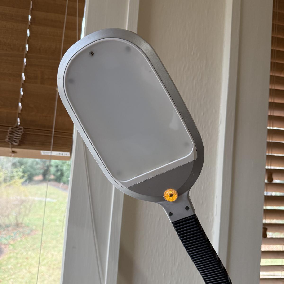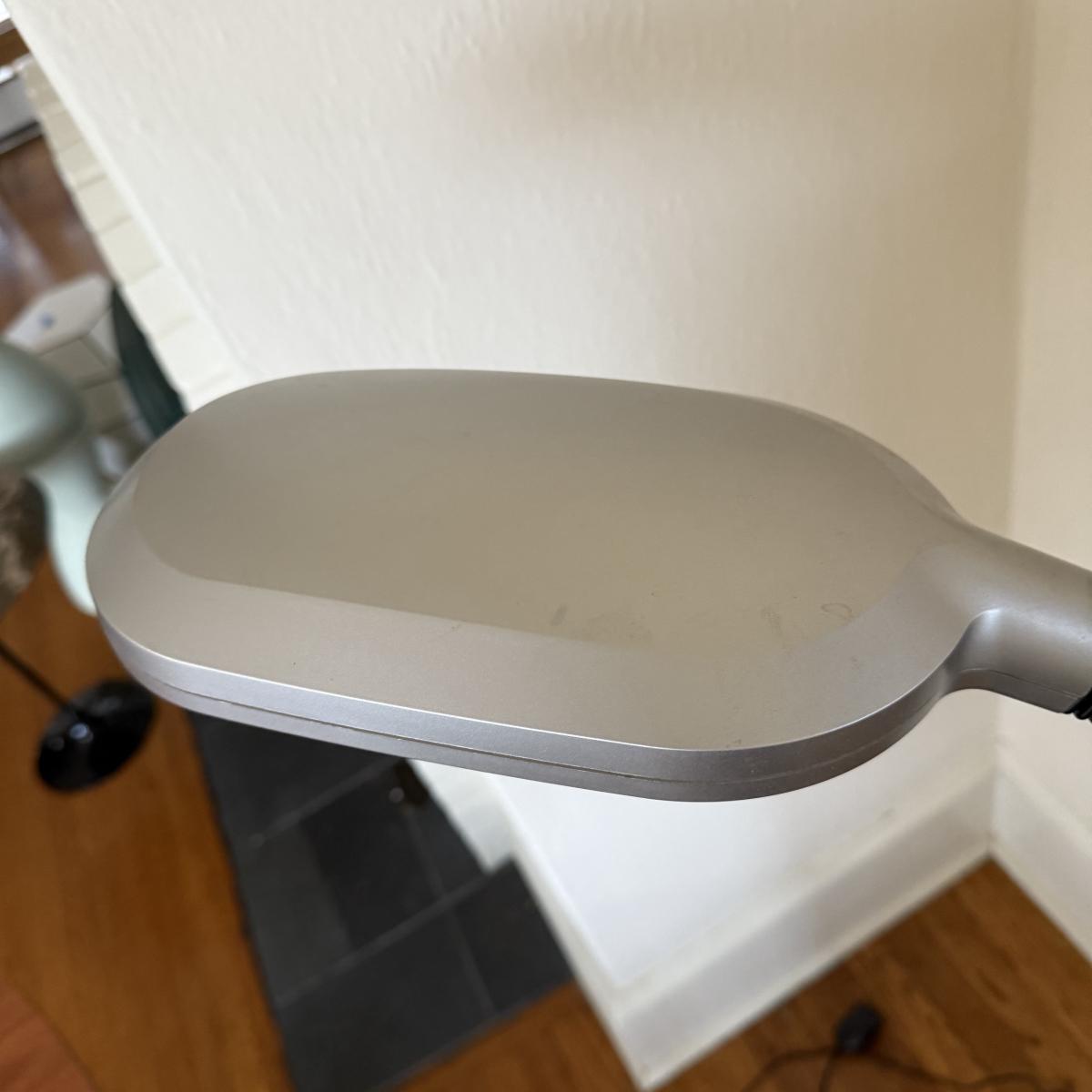 Lot includes a rolling adjustable laptop desk with metal frame and melamine style top. Piece at its tallest setting measures 19” x 23” x 33”H. Also included is a Brightech LED floor lamp reading light. Lamp powered on when plugged in.