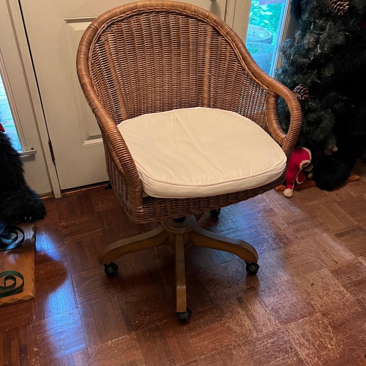 Sturdy rolling wicker chair is height adjustable. It has a cream-colored cotton cushion with removable cover. A few light stains that may wash out. Also, a small amount of damage on the one arm, see pic.