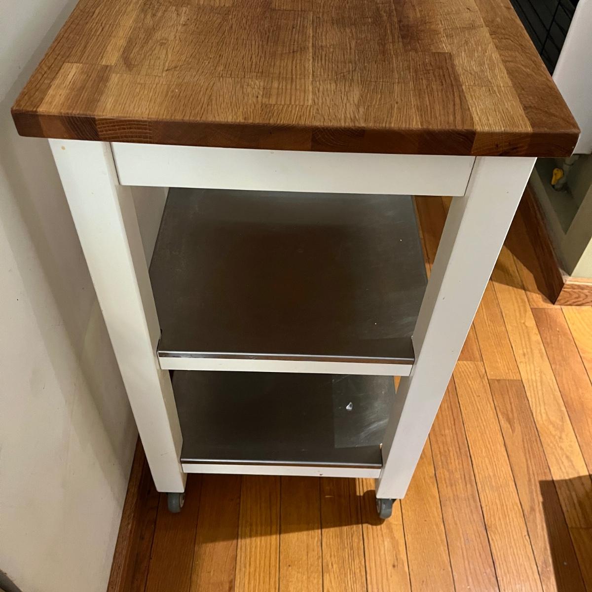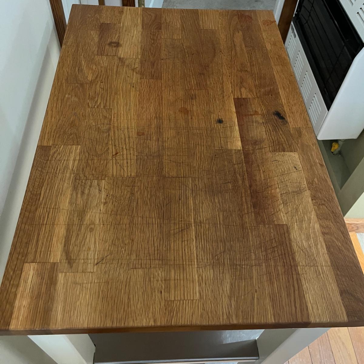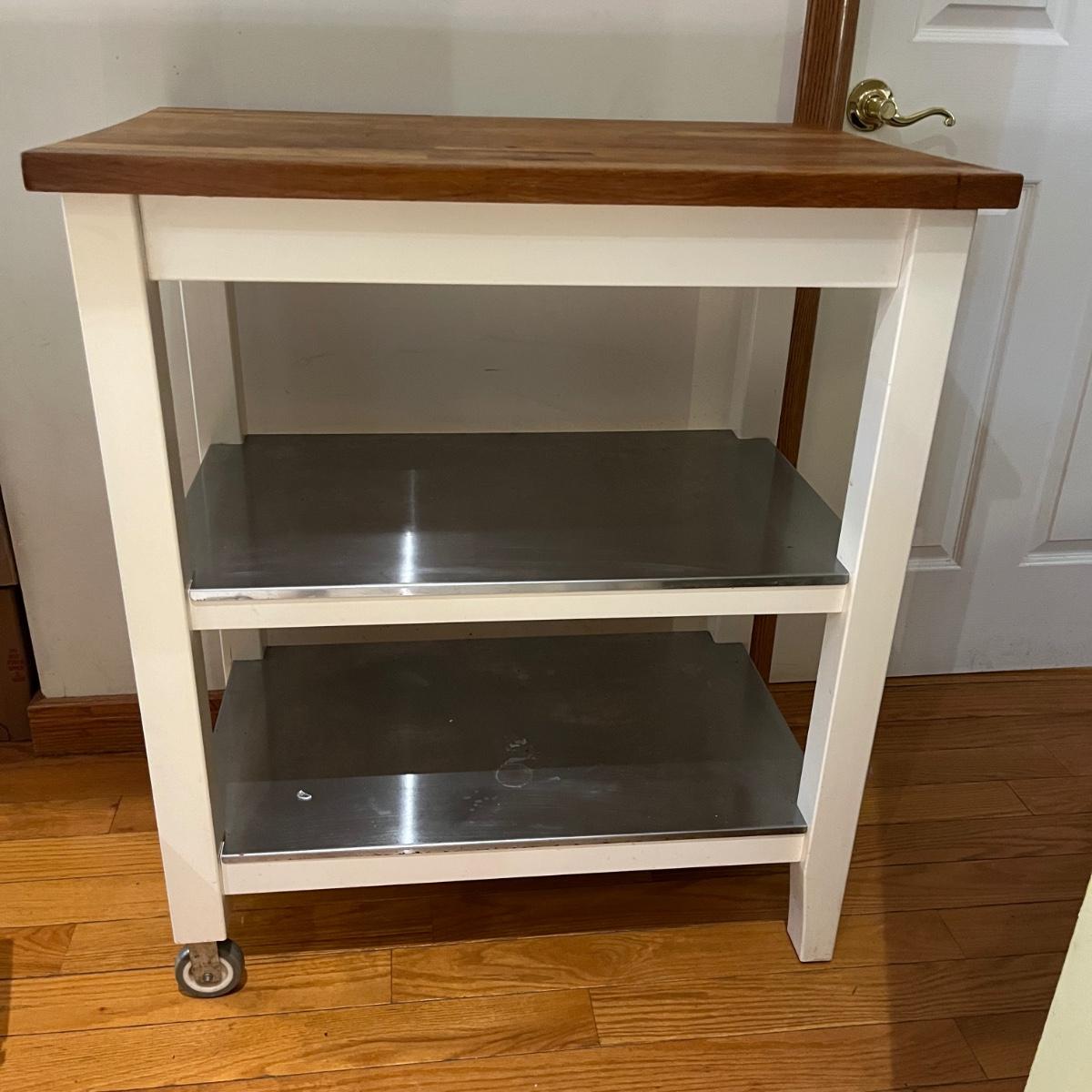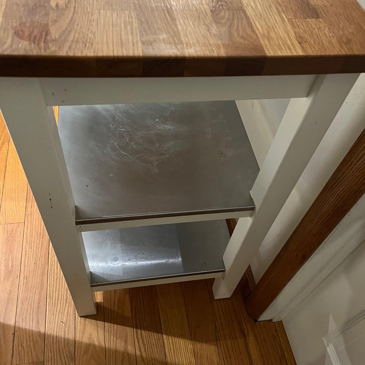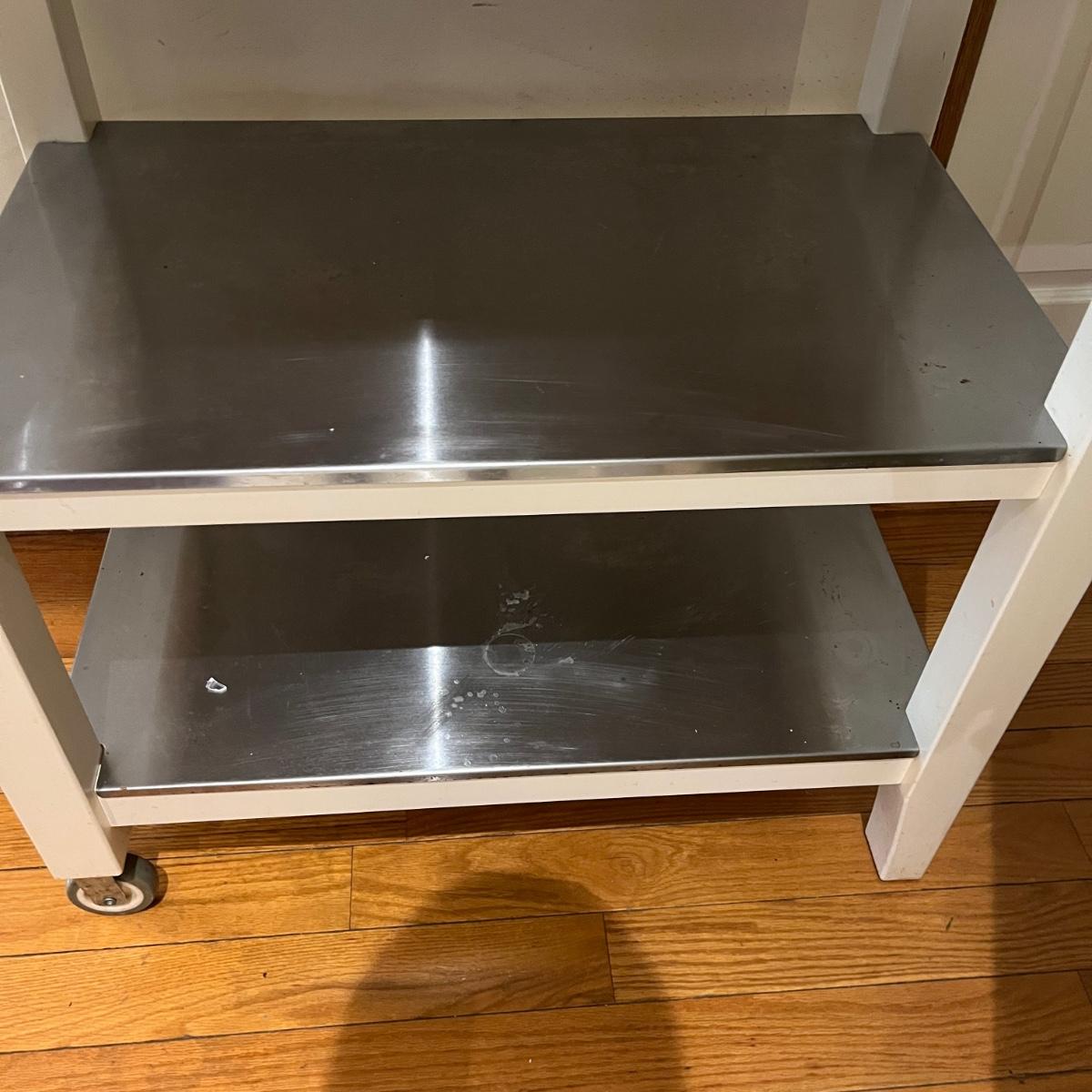 Lot includes a butcher block top rolling cart with stainless steel shelves. Cart has scratches and stains, see pictures. Cart measures 31” x 20” x 35”H.