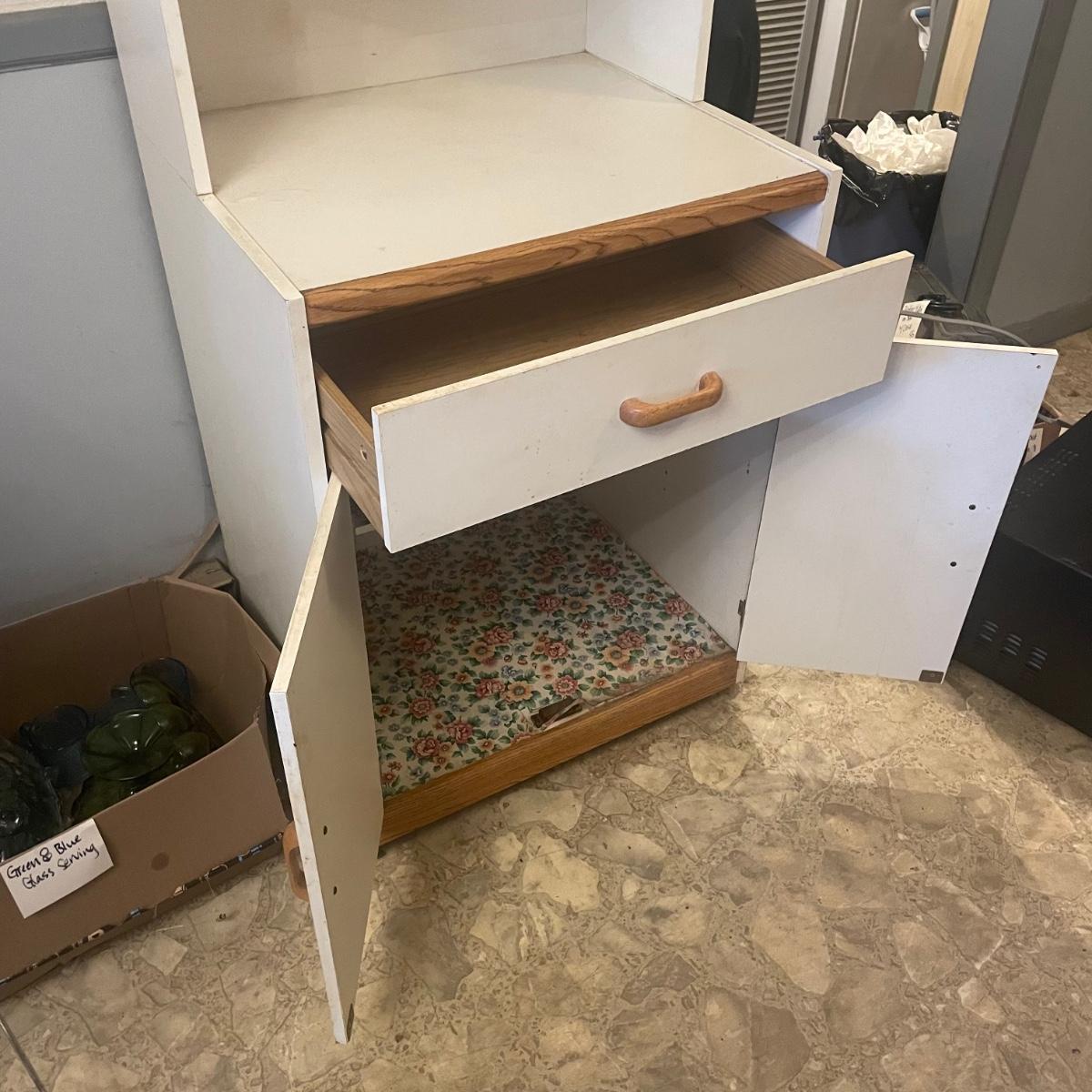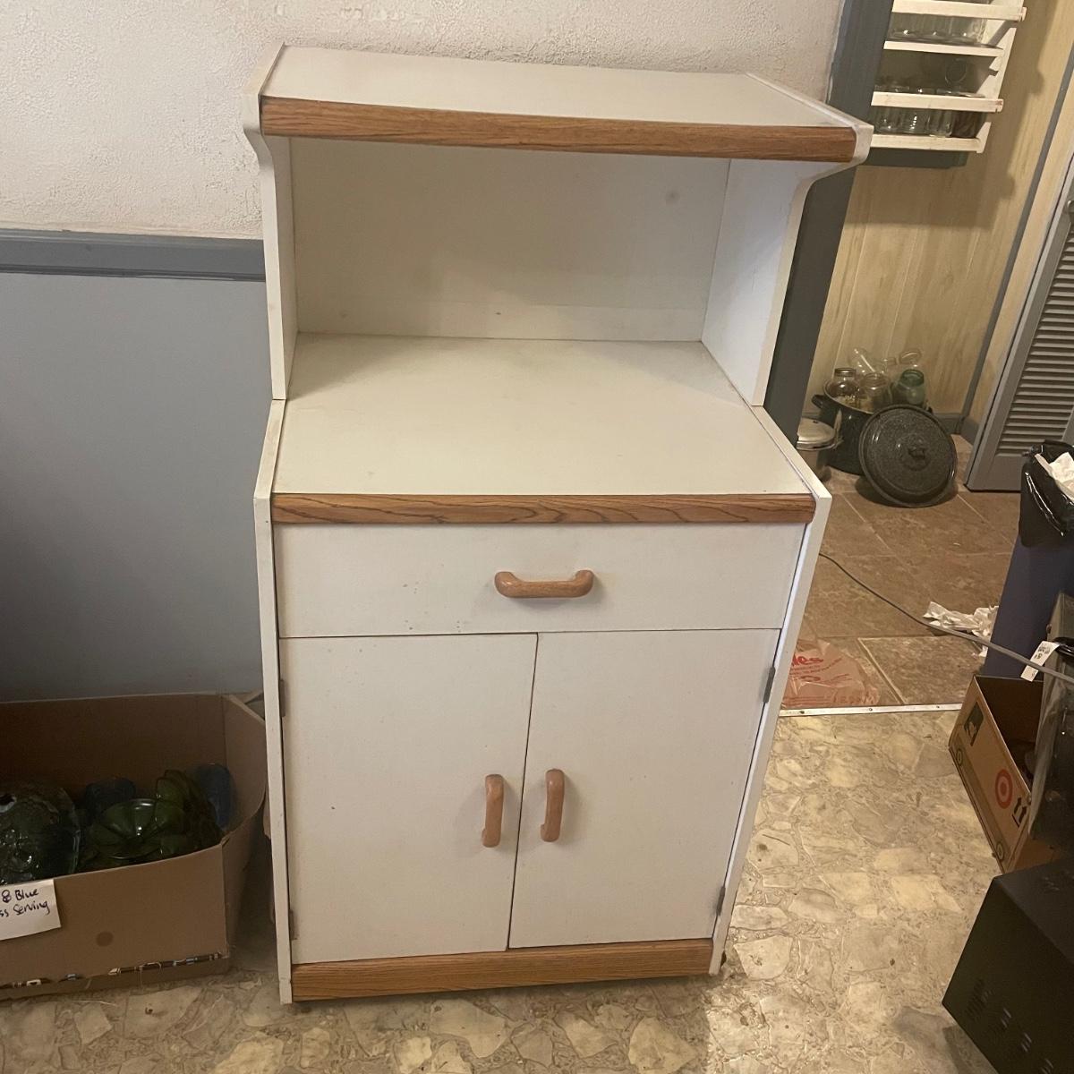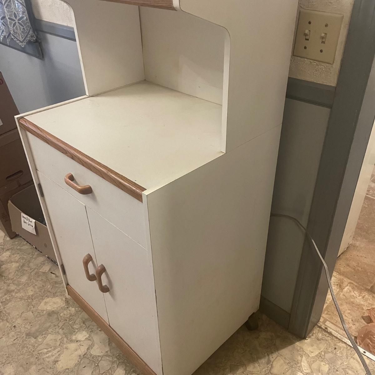 This handy rolling cabinet measures 20” deep x 25” wide x 48” tall. It has a spacious lower cabinet with shelf with a drawer above and an open area above that. Made of pressed wood and it has black plastic casters. There are some minor blemishes, see images.