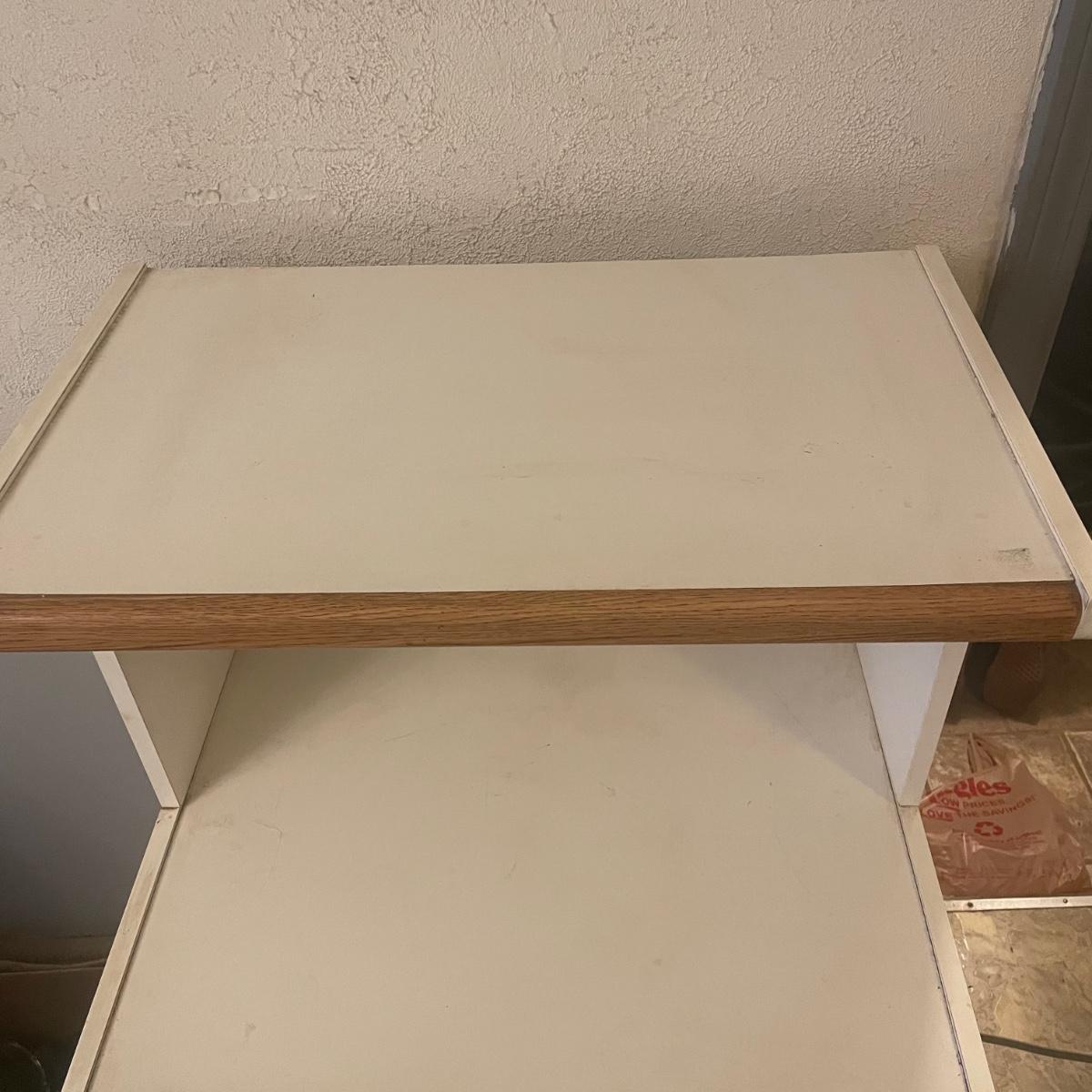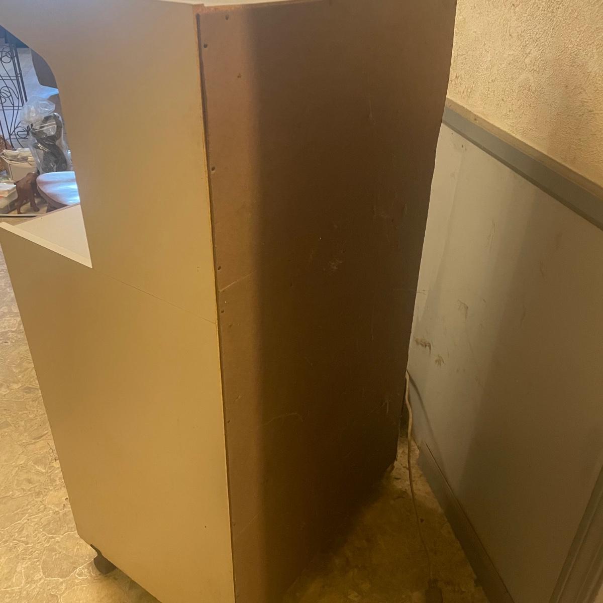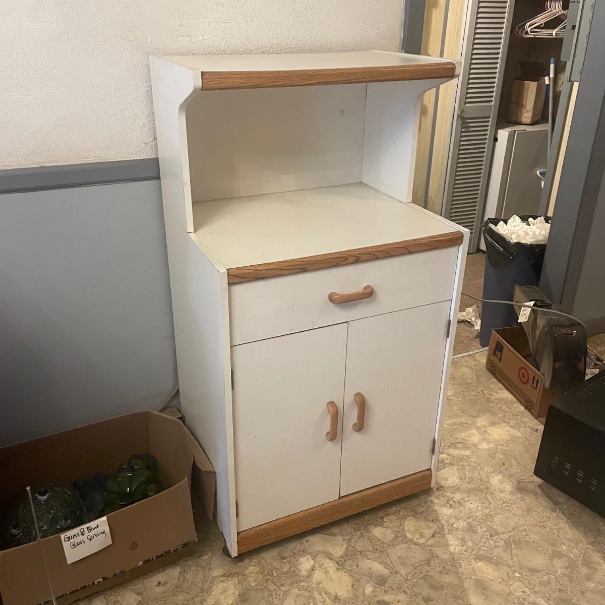 This handy rolling cabinet measures 20” deep x 25” wide x 48” tall. It has a spacious lower cabinet with shelf with a drawer above and an open area above that. Made of pressed wood and it has black plastic casters. There are some minor blemishes, see images.