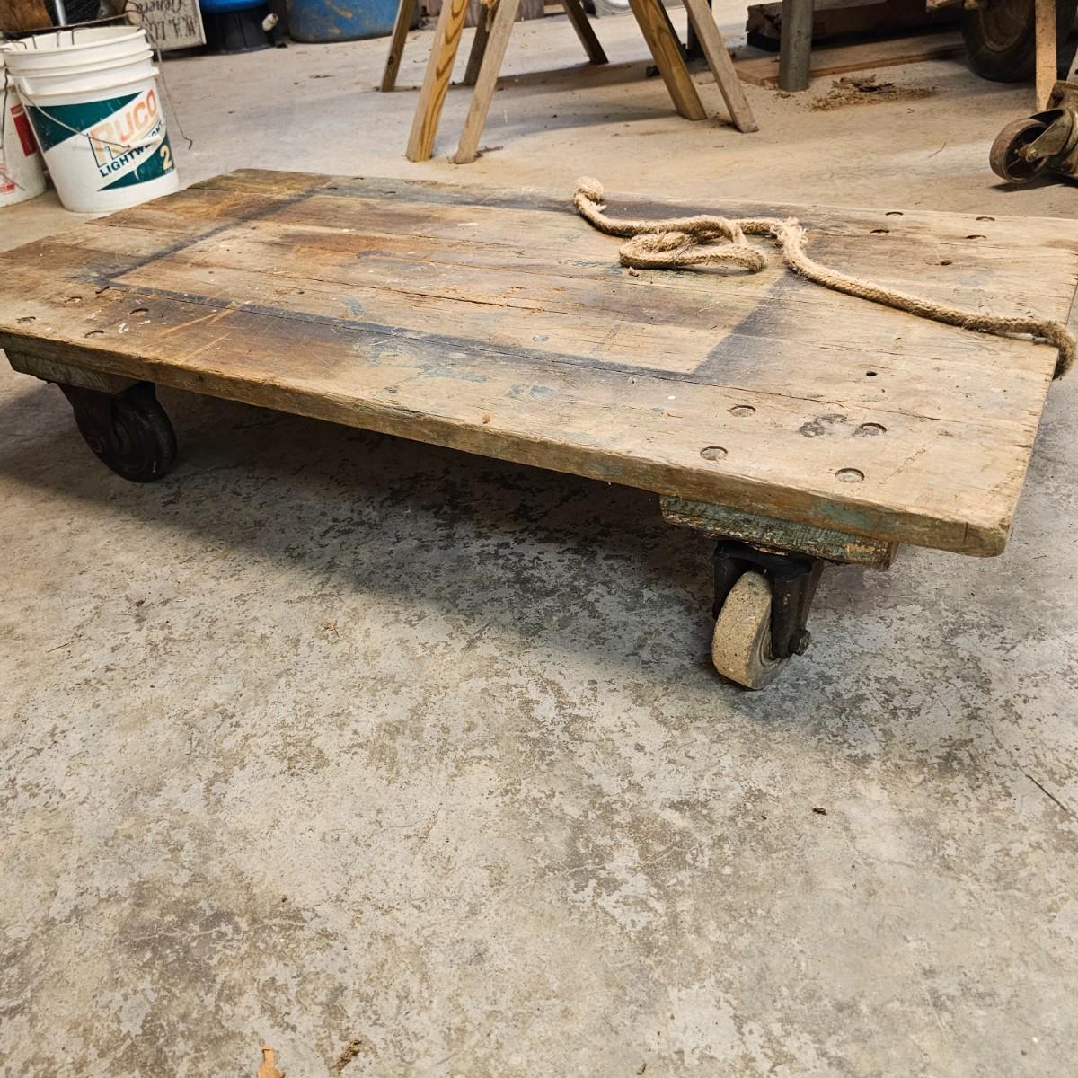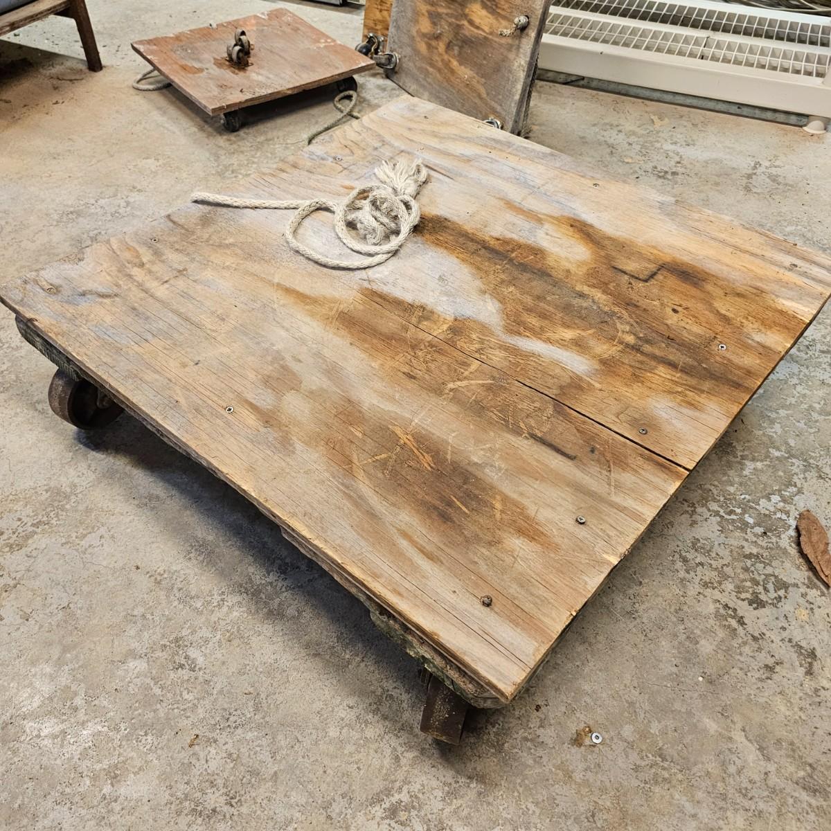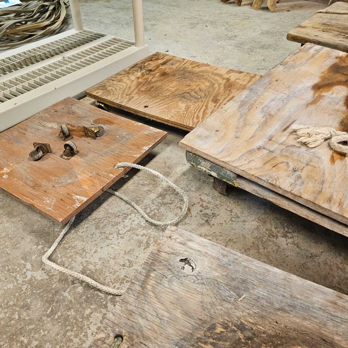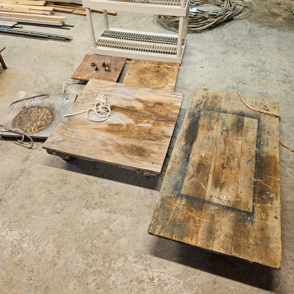 Five different sizes of platform rolling carts. All units are either plywood or solid tops. Sizes range from 16"Sq x 3"H to 48" x 24" x 8"H. Most have pull ropes, see photos for details. Local pickup only.