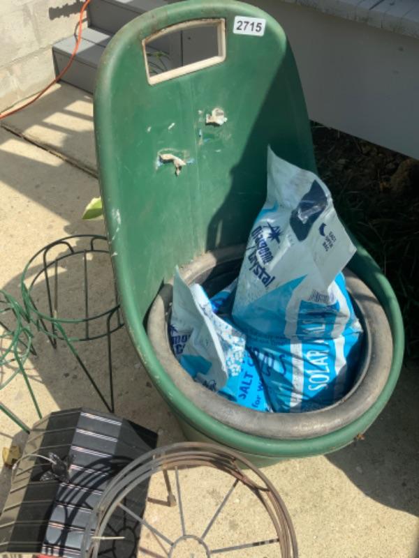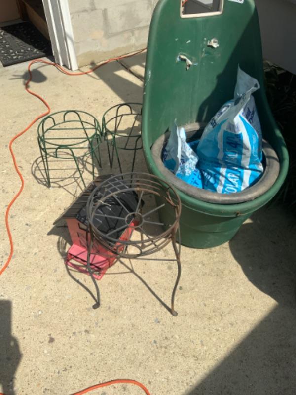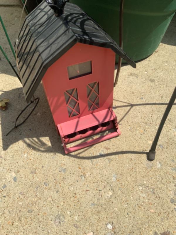 Rolling cart, planters, metal bird house lot 2715