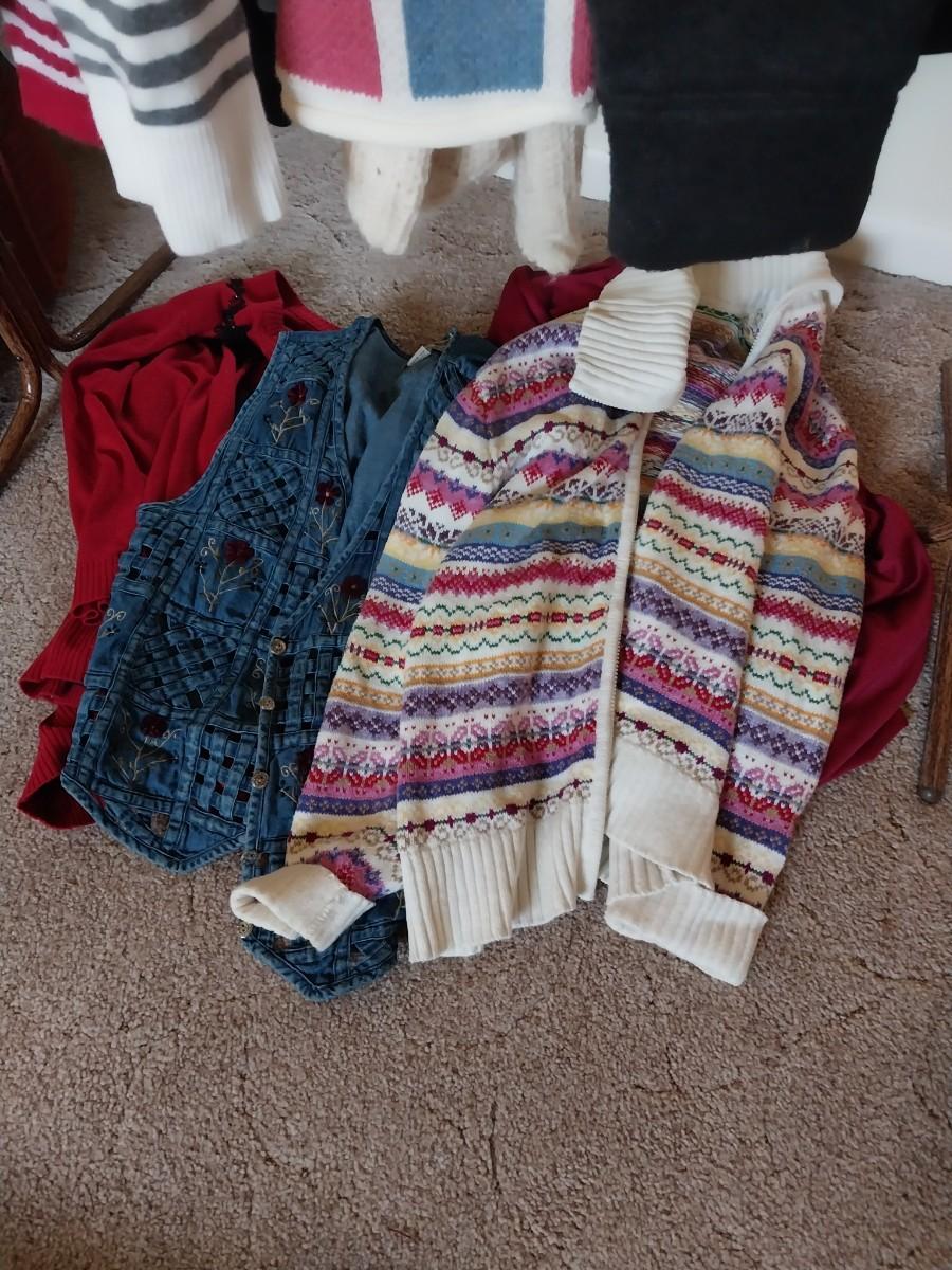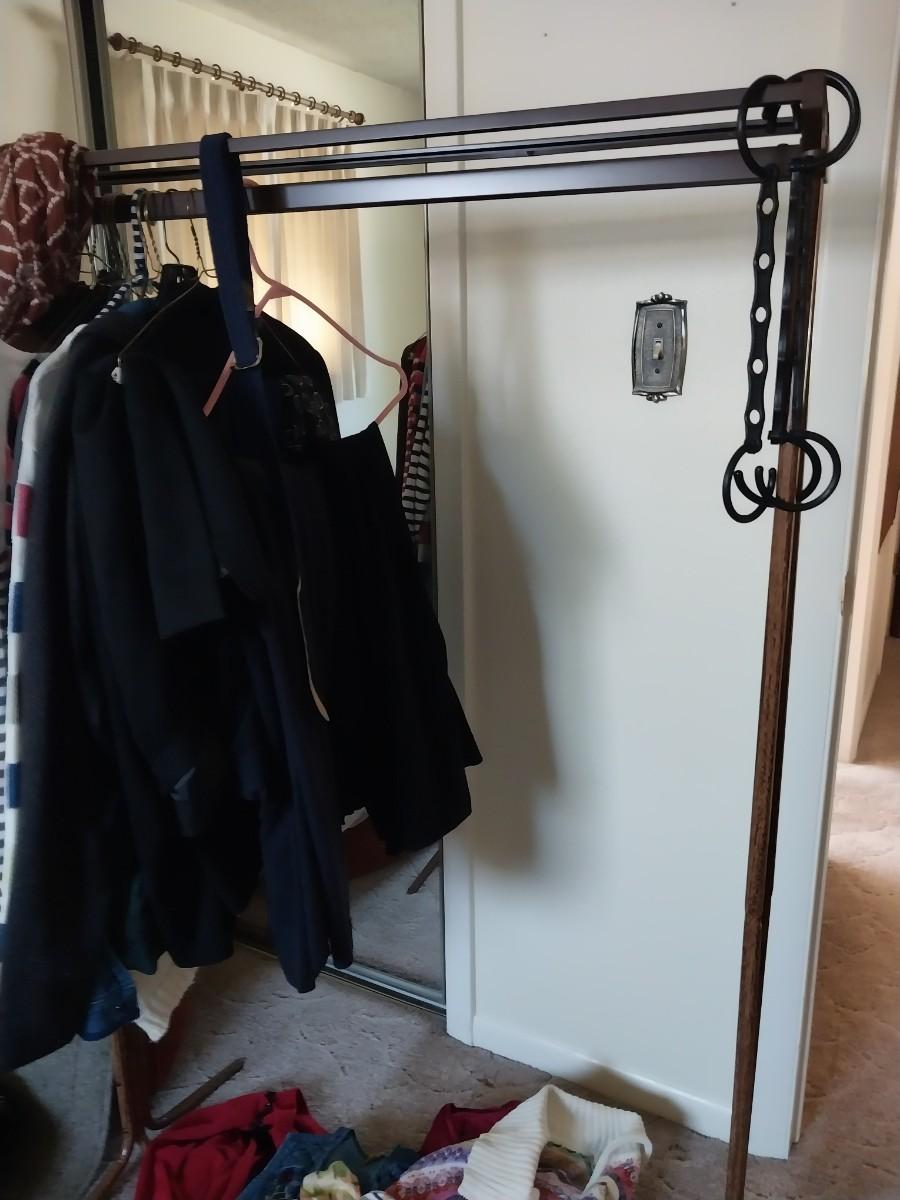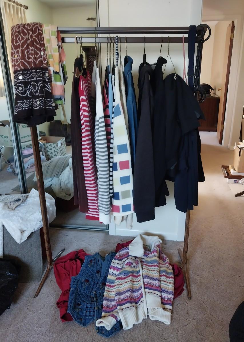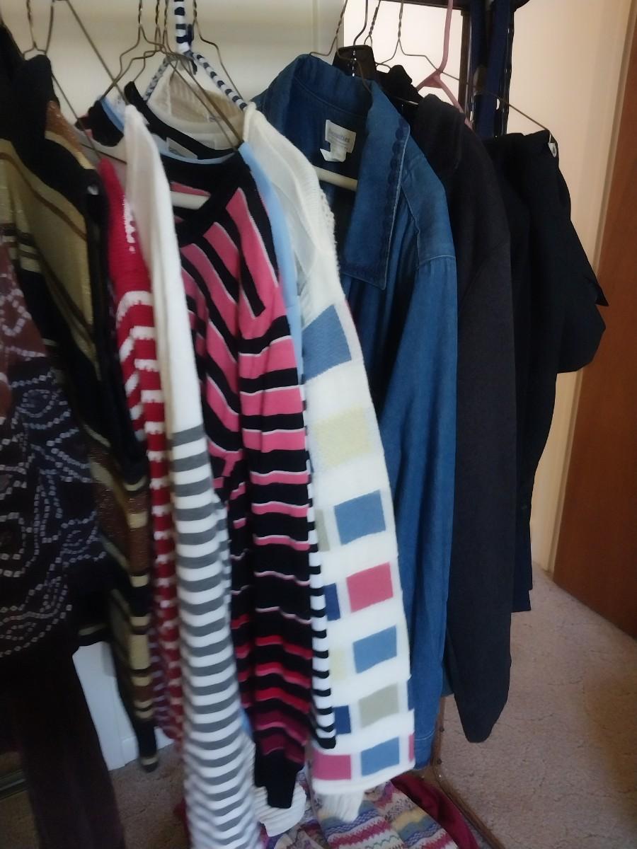 ROLLING CLOTHES RACK AND LADIES SWEATERS, TOPS AND SKIRT