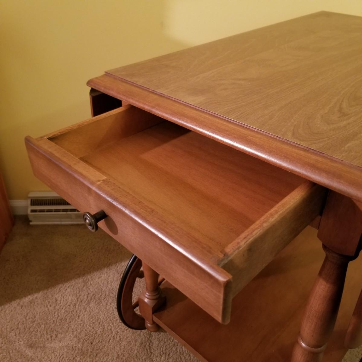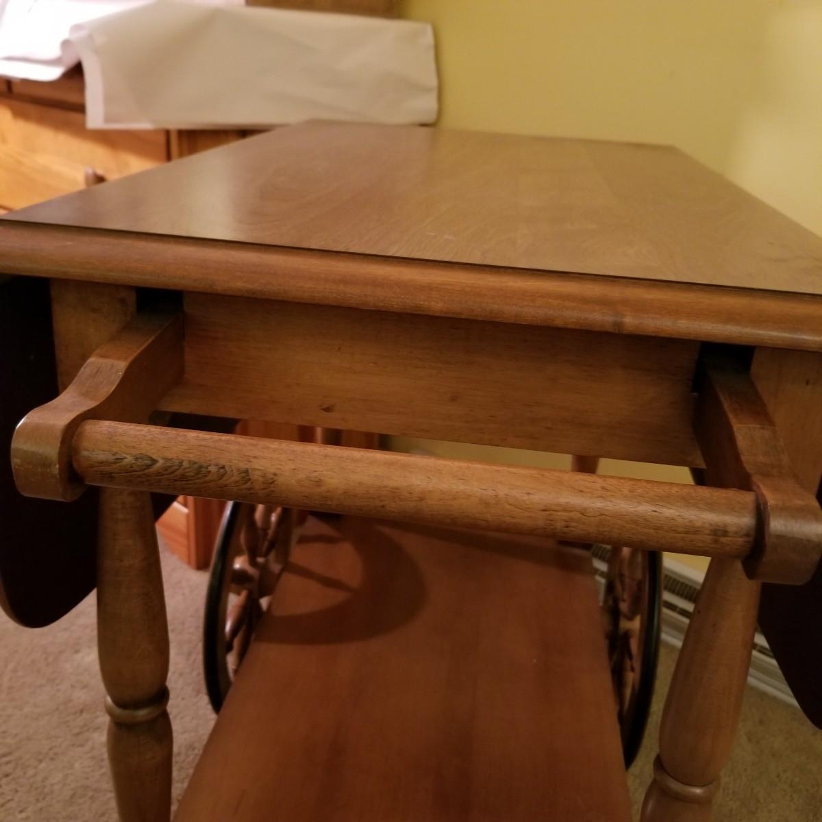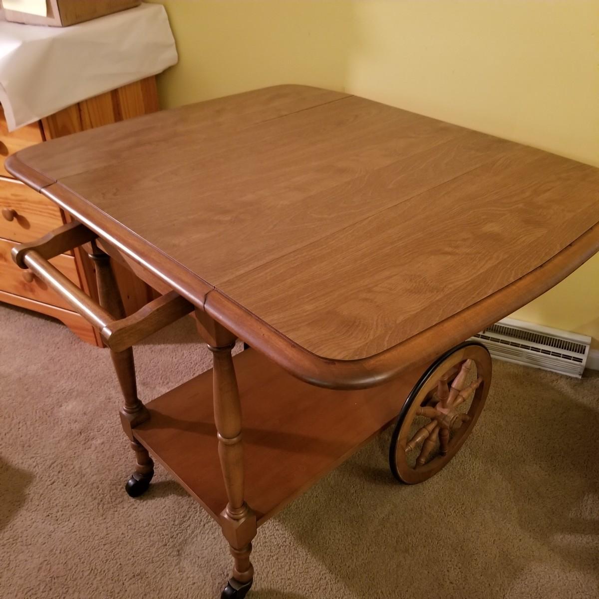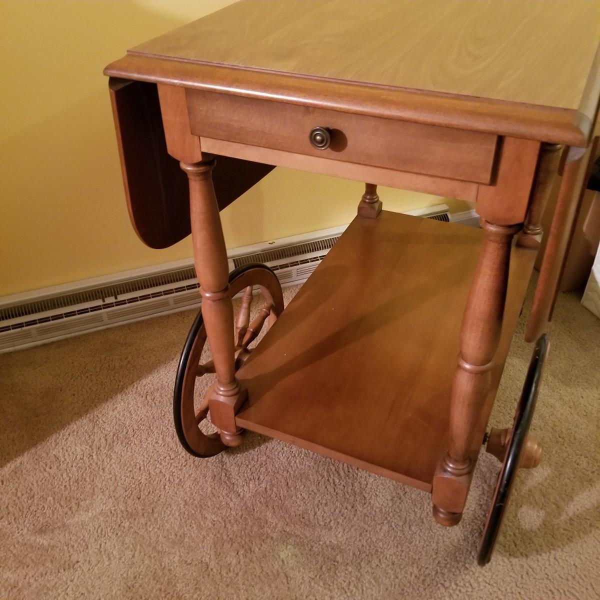 Rolling tea cart with drop leaf sides and slide out drawer on end. Turned posts and legs on casters, this piece measures 33"x38"x28" opened, and 33"x19"x28" closed. Single drawer for storage on one end. Main wheels are 13"d. Wood is maple colored, see photos for details. Local pickup only.