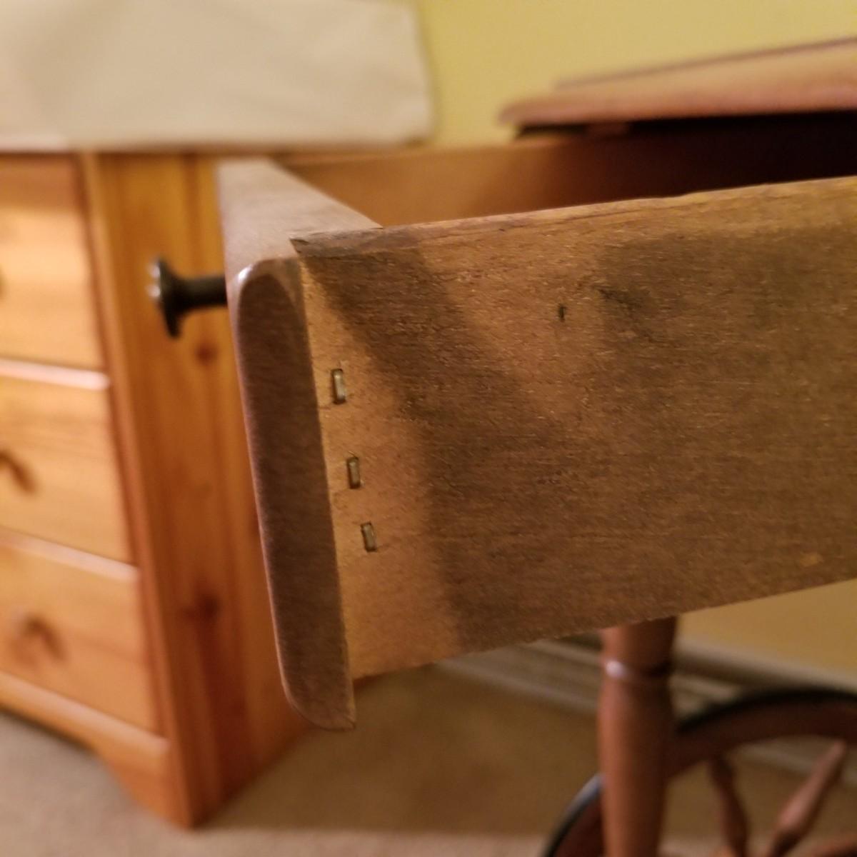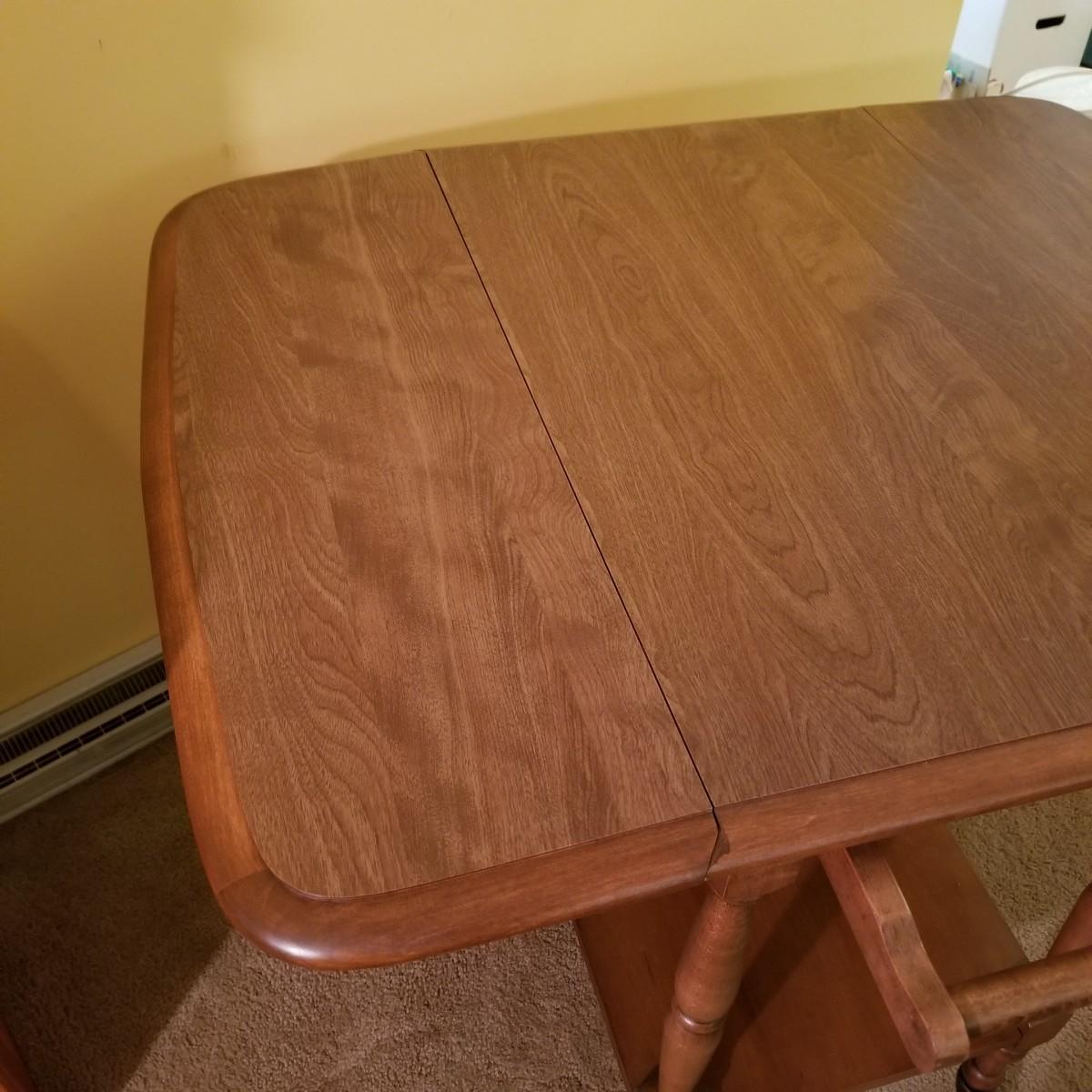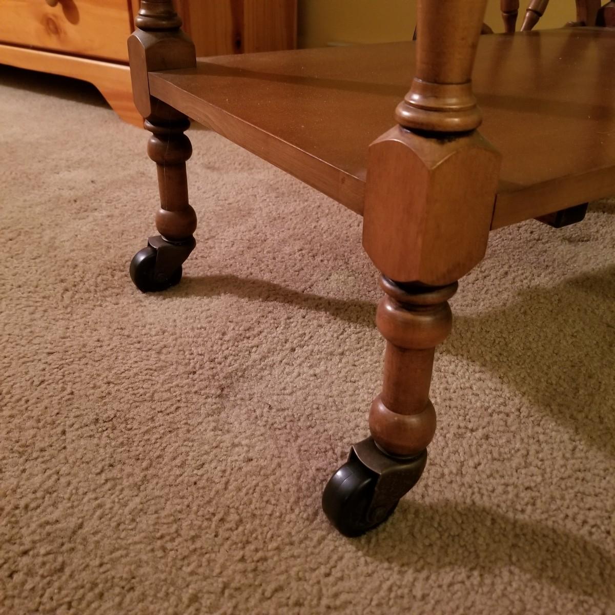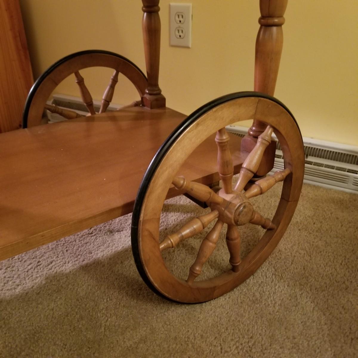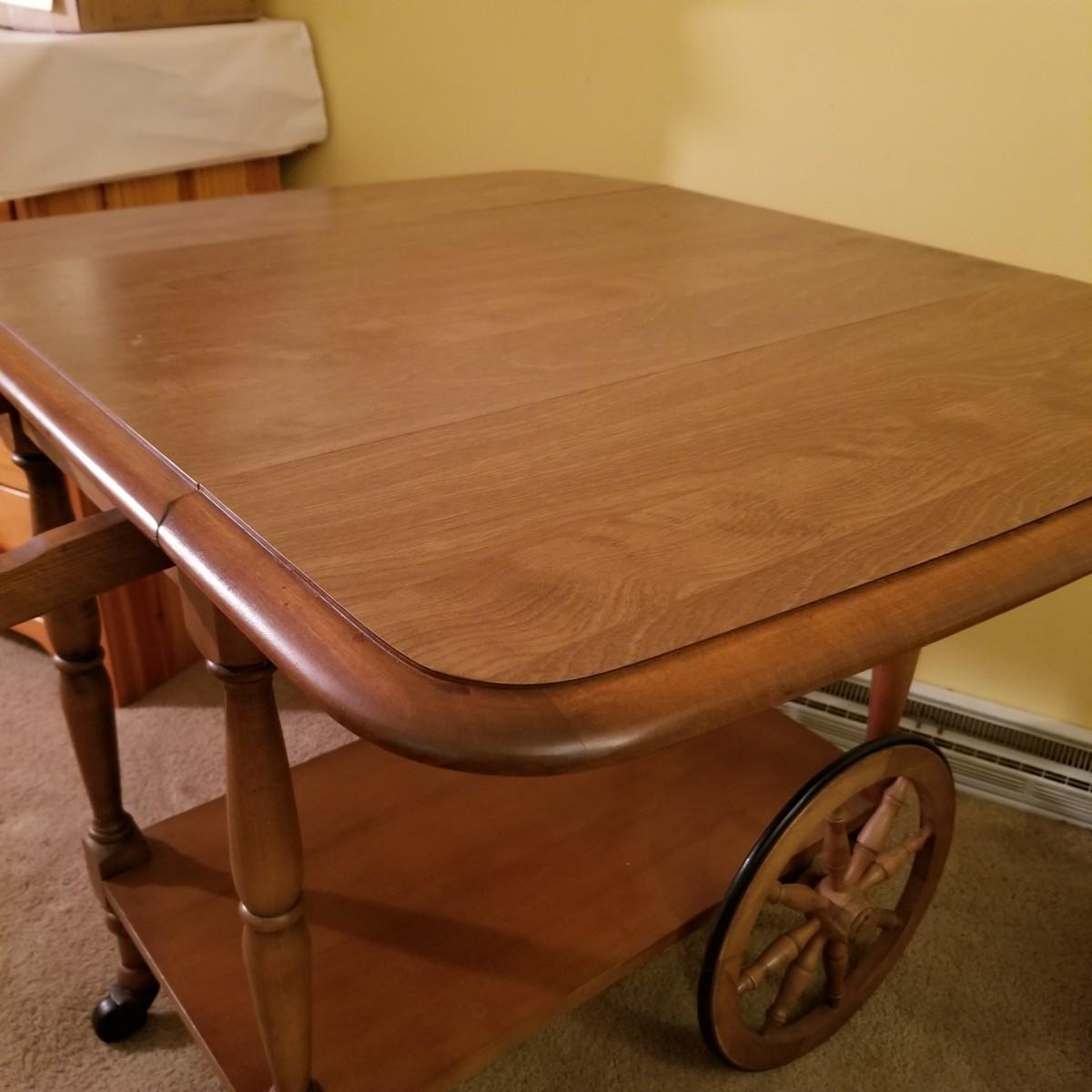 Rolling tea cart with drop leaf sides and slide out drawer on end. Turned posts and legs on casters, this piece measures 33"x38"x28" opened, and 33"x19"x28" closed. Single drawer for storage on one end. Main wheels are 13"d. Wood is maple colored, see photos for details. Local pickup only.