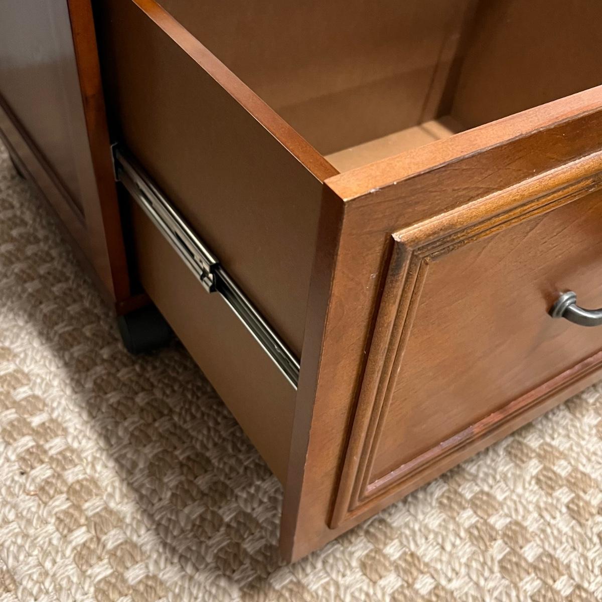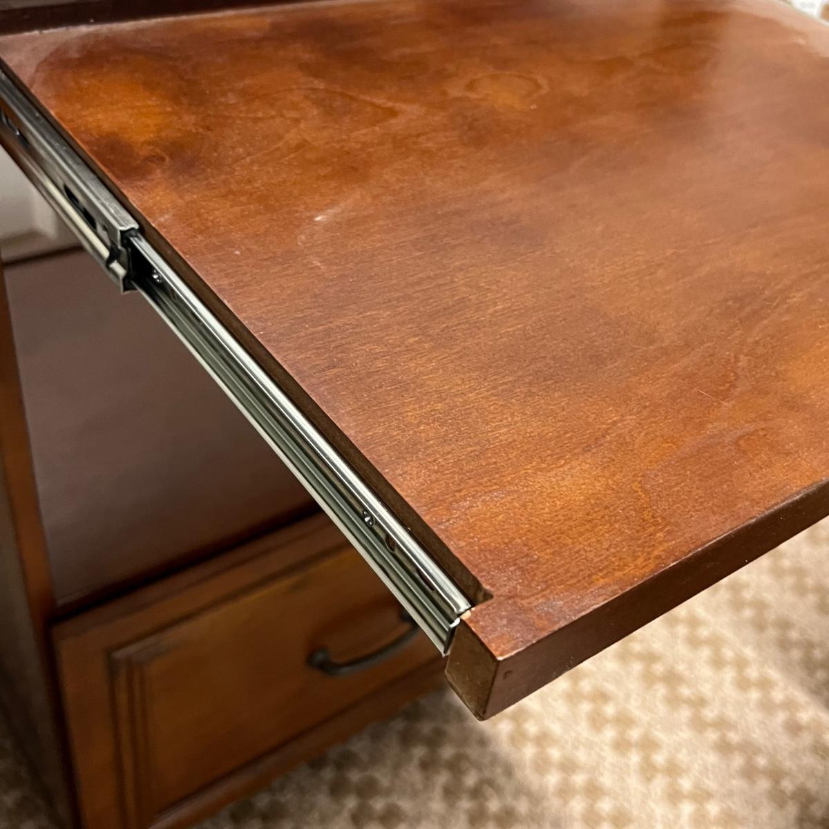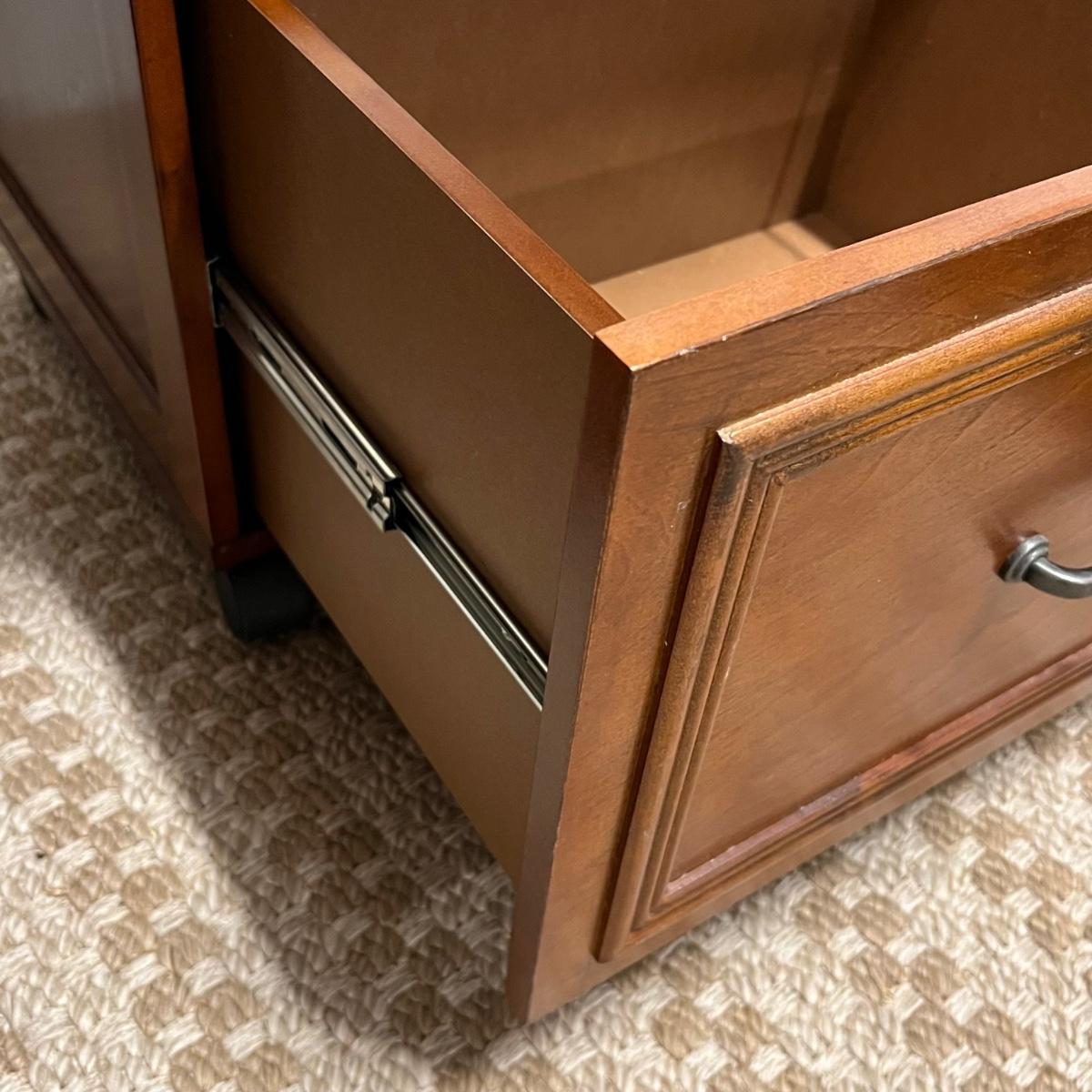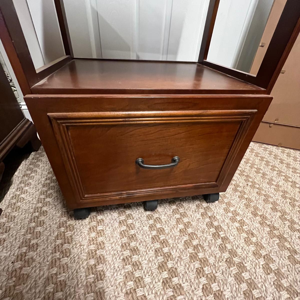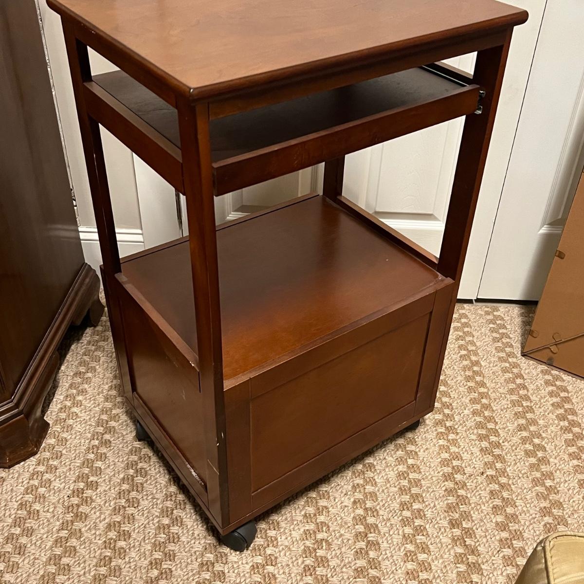 This convenient small desk has a file cabinet drawer and a pull out keyboard. It appears to be composite wood with a walnut finish. It has a few blemishes that are shown in images. Caster wheels are plastic.