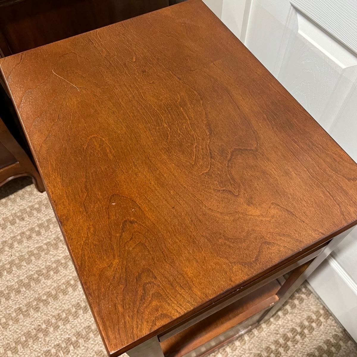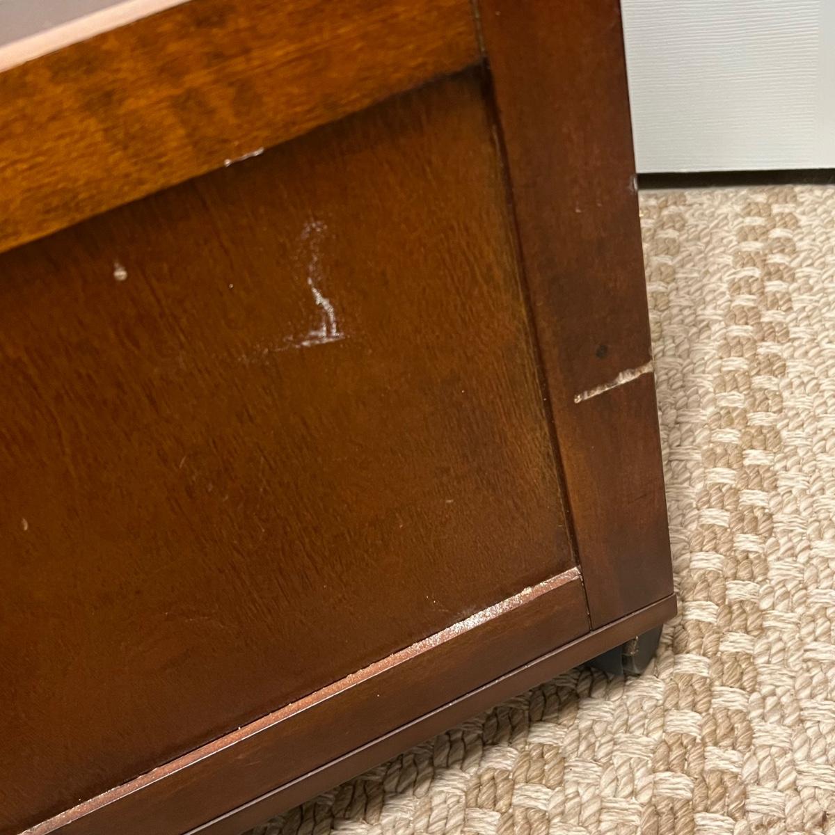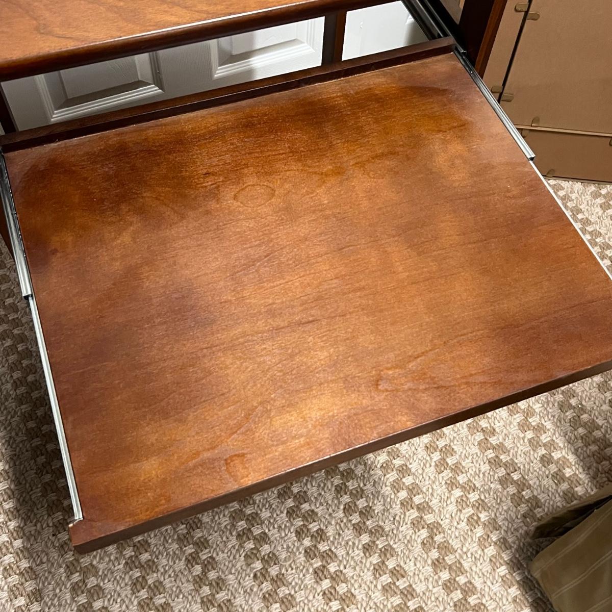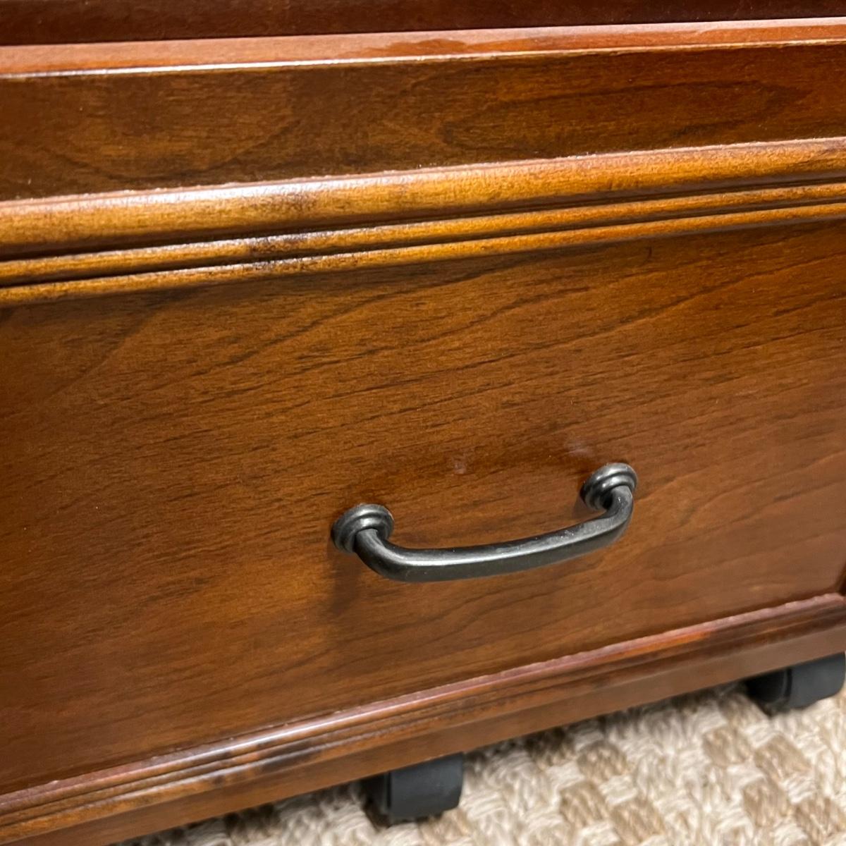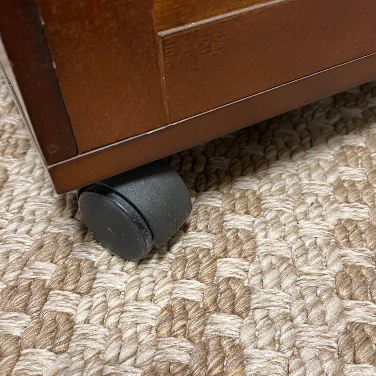 This convenient small desk has a file cabinet drawer and a pull out keyboard. It appears to be composite wood with a walnut finish. It has a few blemishes that are shown in images. Caster wheels are plastic.