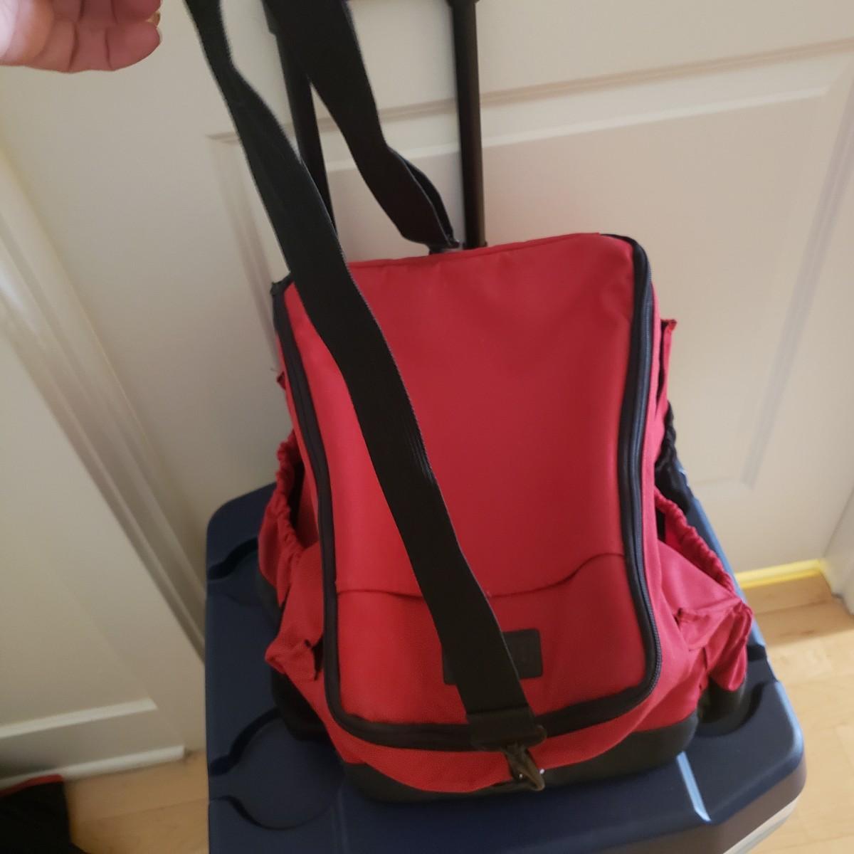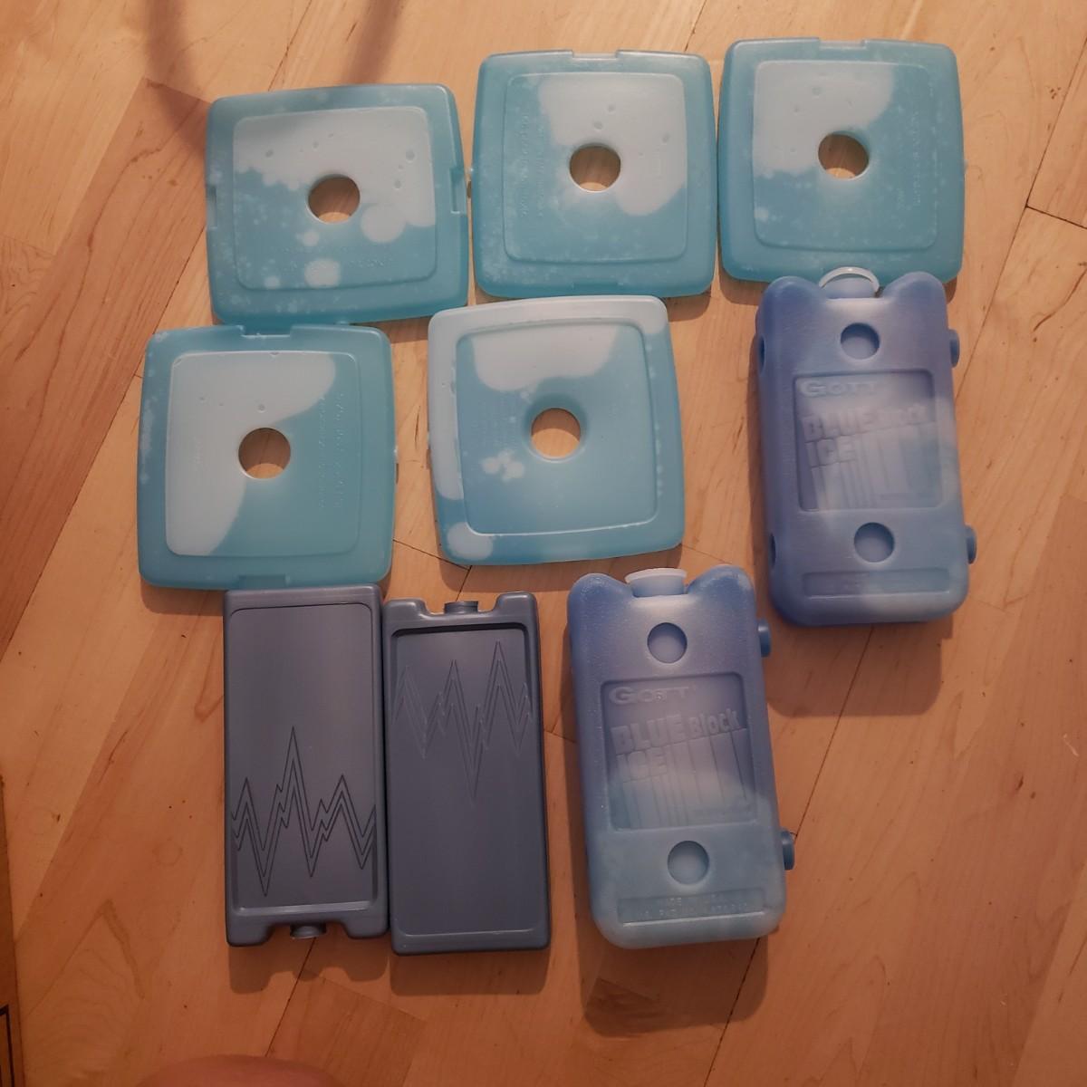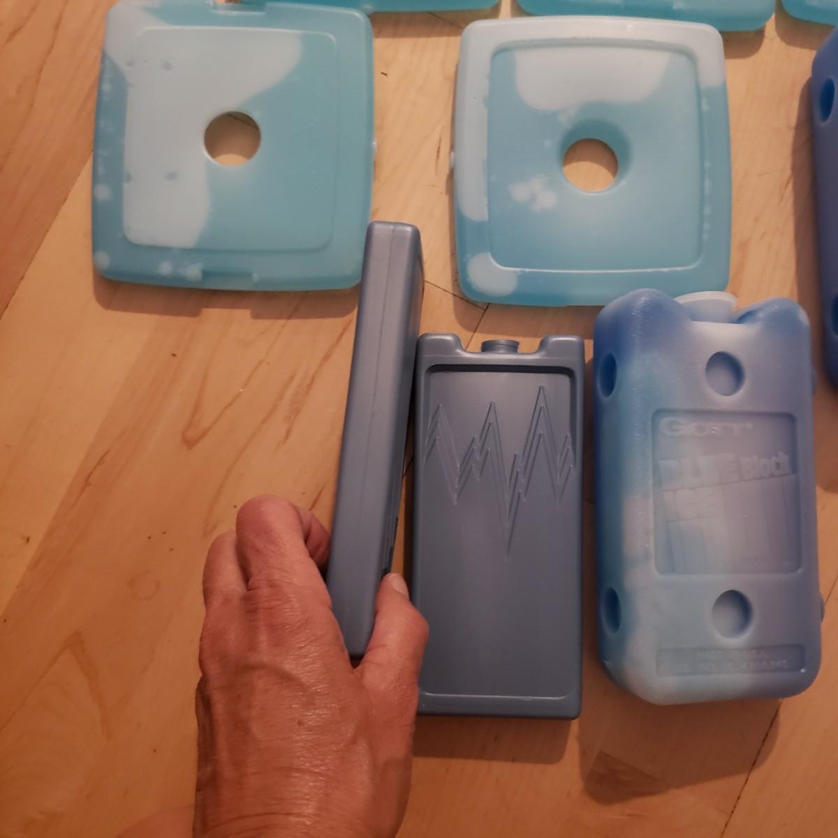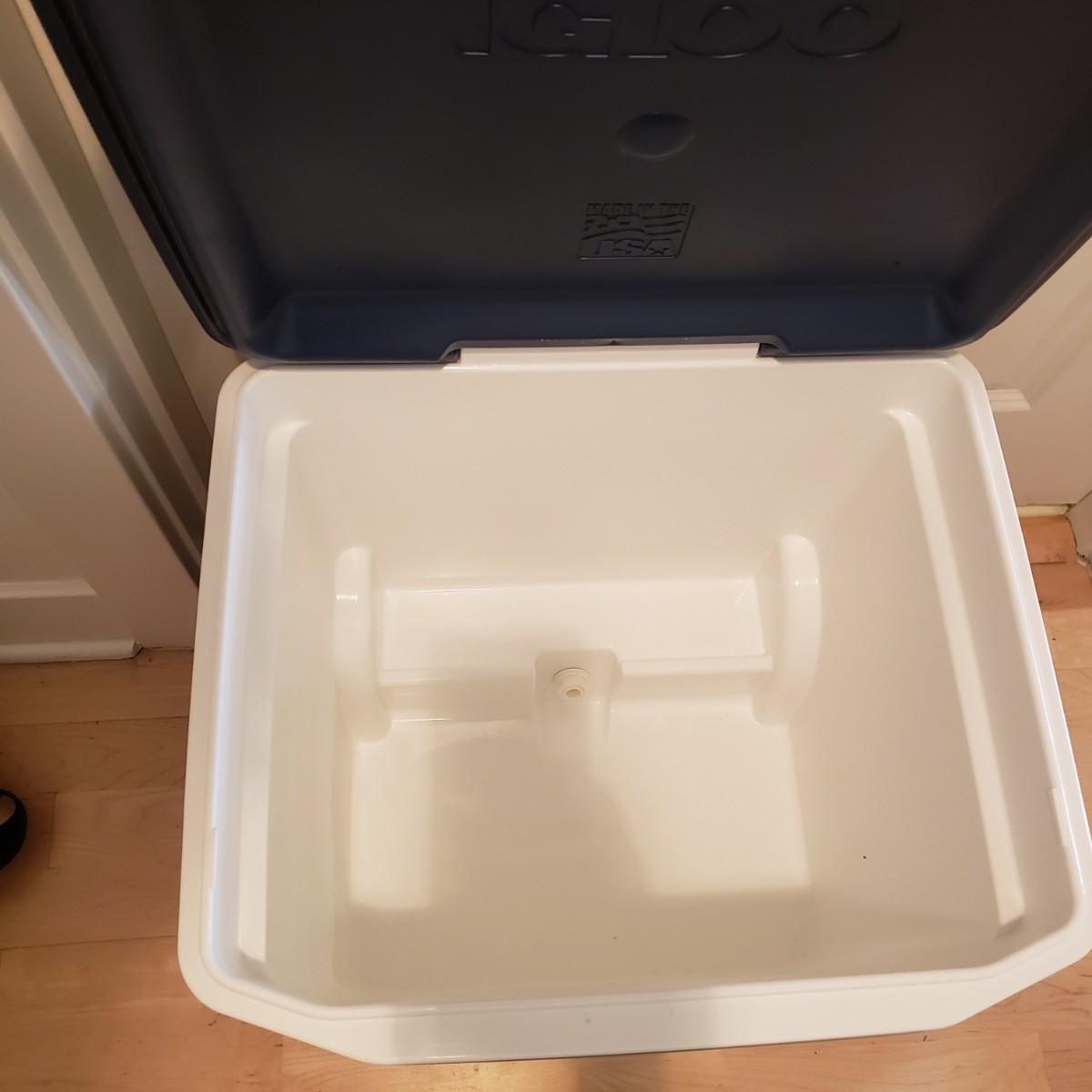 This cooling lot contains a 62qt rolling Igloo cooler with expandable handle. There are four cup holders on the top and a drainage hole on the bottom. The red Lands End soft sided cooler (12" x 13" x 11"H) has an adjustable strap, six side pockets and two mesh inner pockets. The bottom is covered in a thicker rubber like material, see pictures. The purple Cool Tote also has an adjustable strap, soft sides, two plastic champagne glasses and wine opener in handy elastic holders! The Trader Joe's cooler bag is perfect for picking up groceries. Lastly, a variety of nine plastic freezer packs, perfect for any of these coolers!