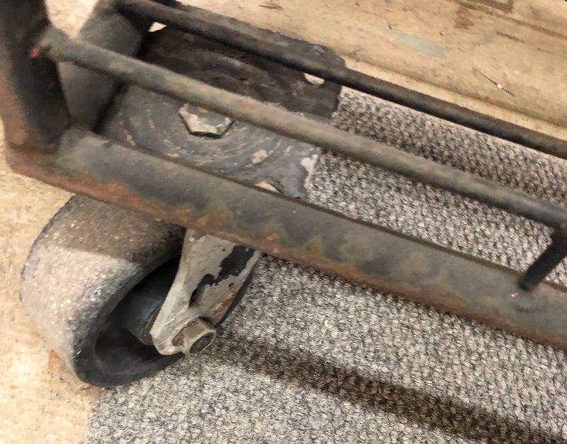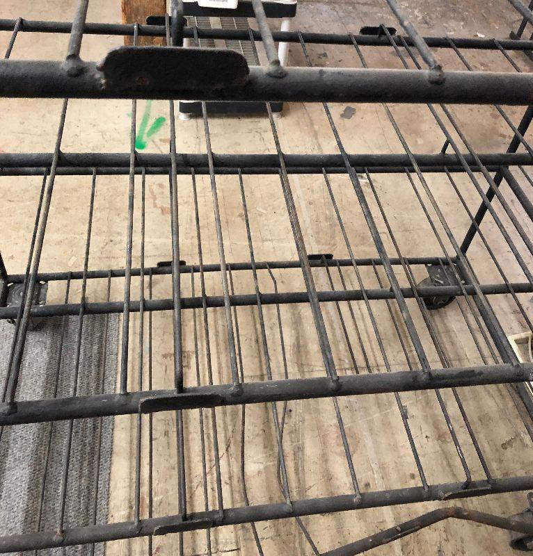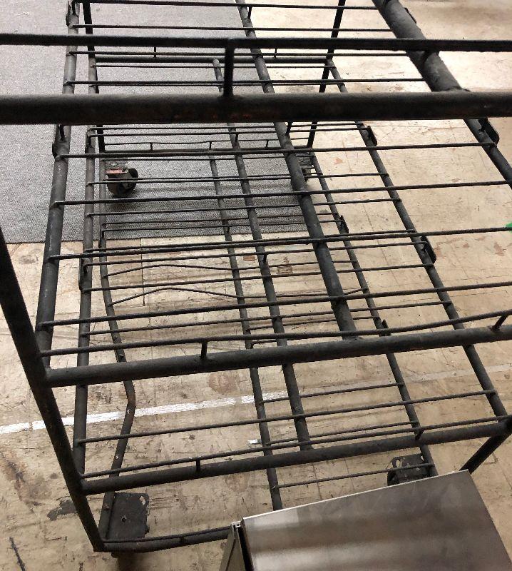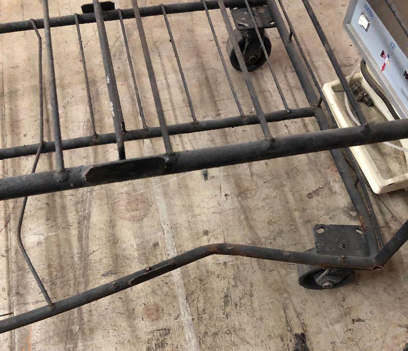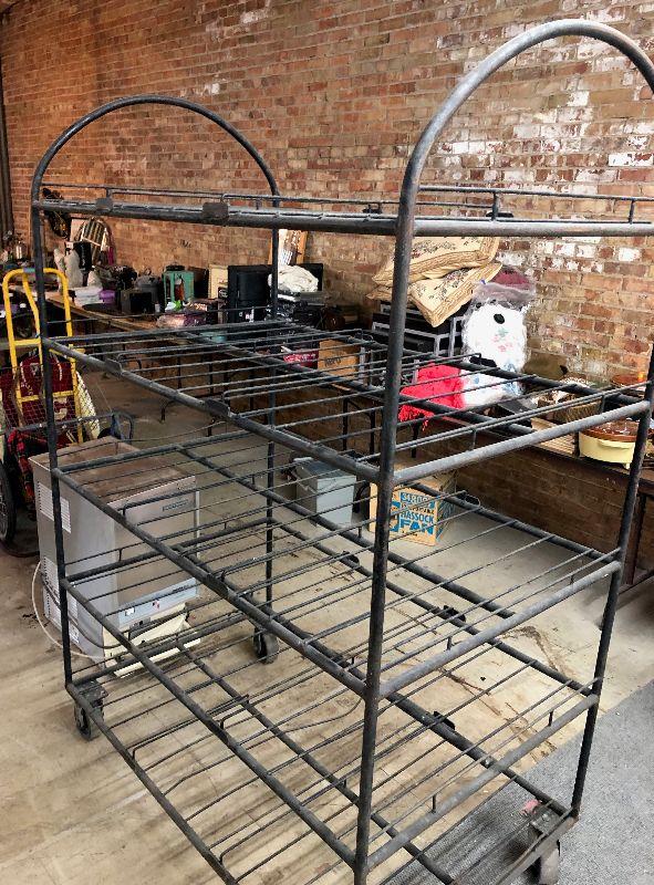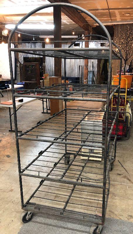 Here is a rolling iron shelf...bend on bottom...Large at 53 x 52 x 78"....Great for a shop space....