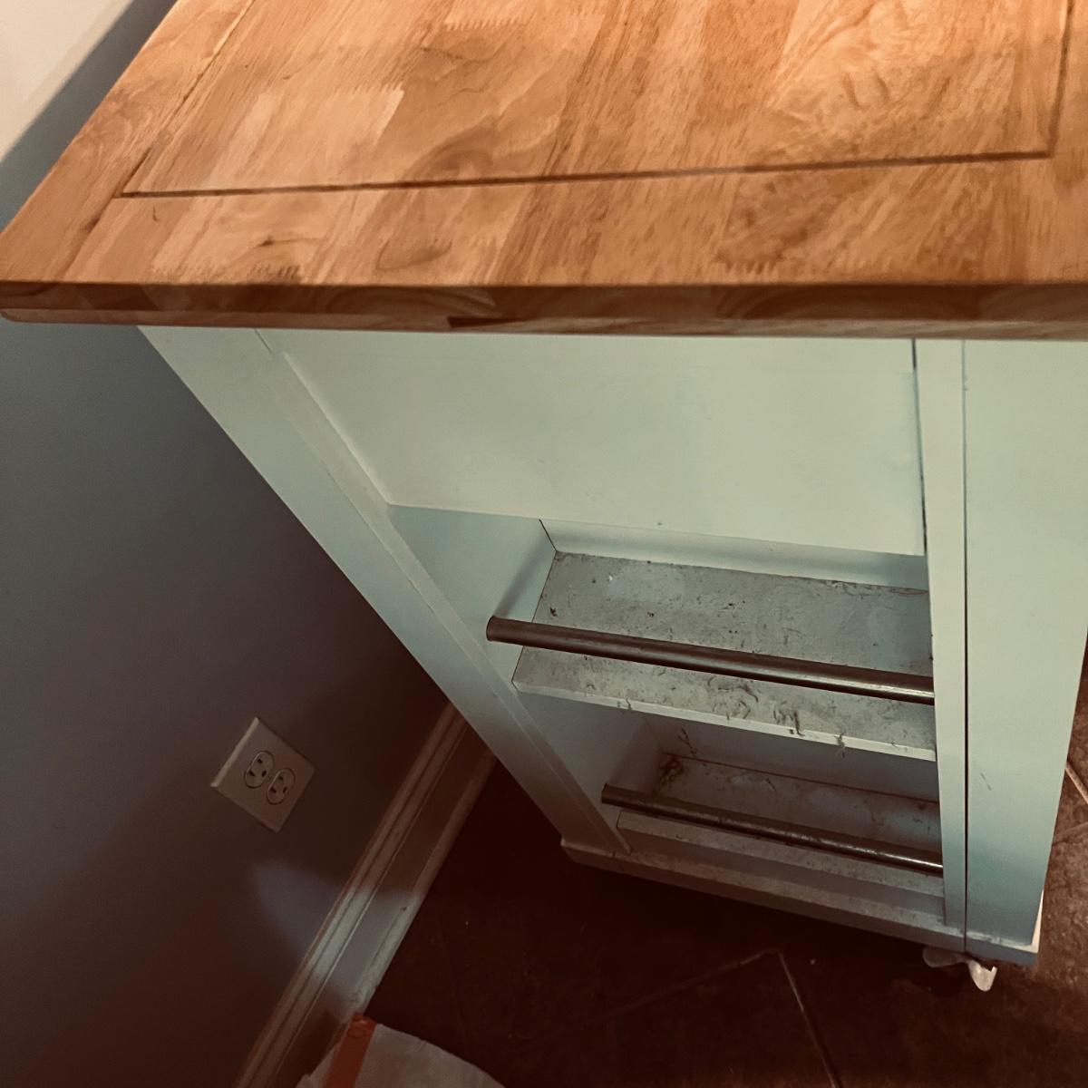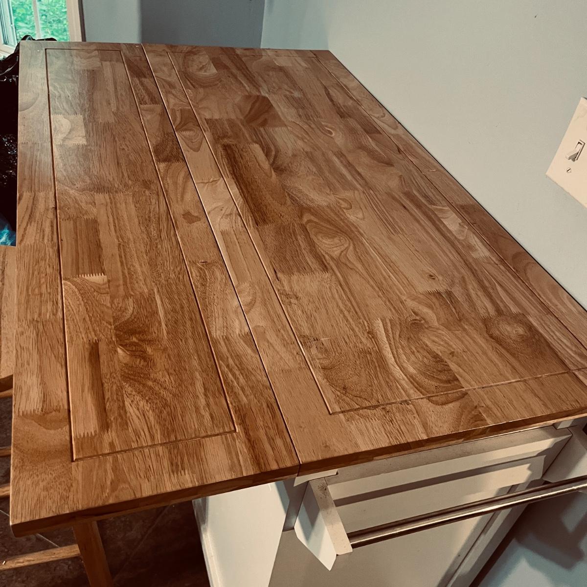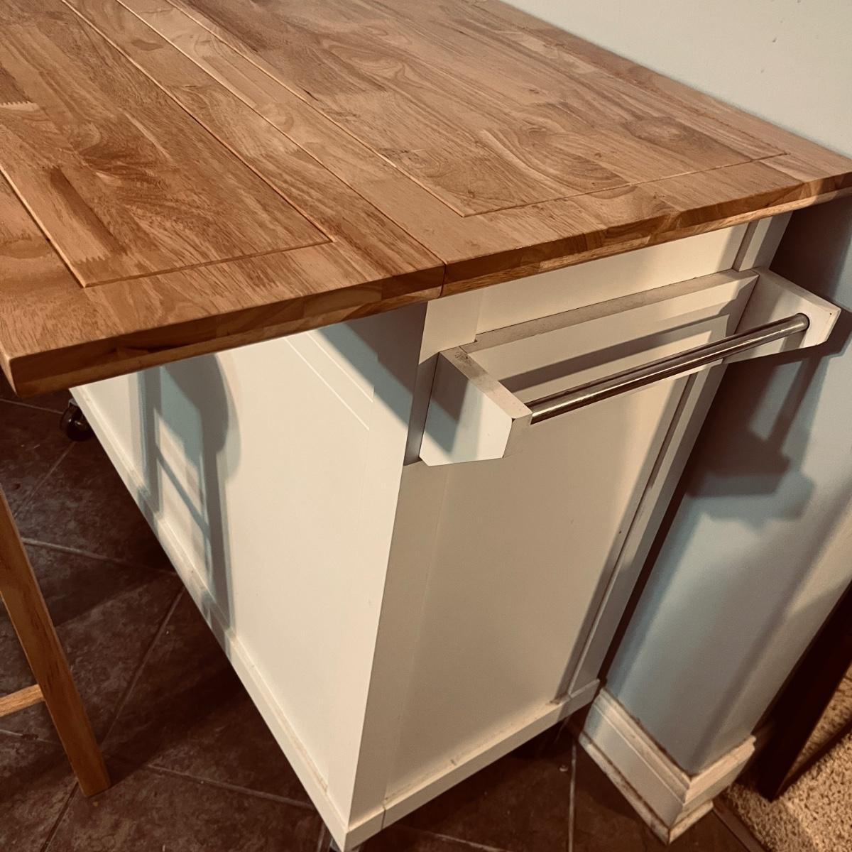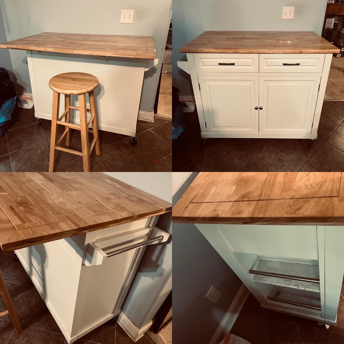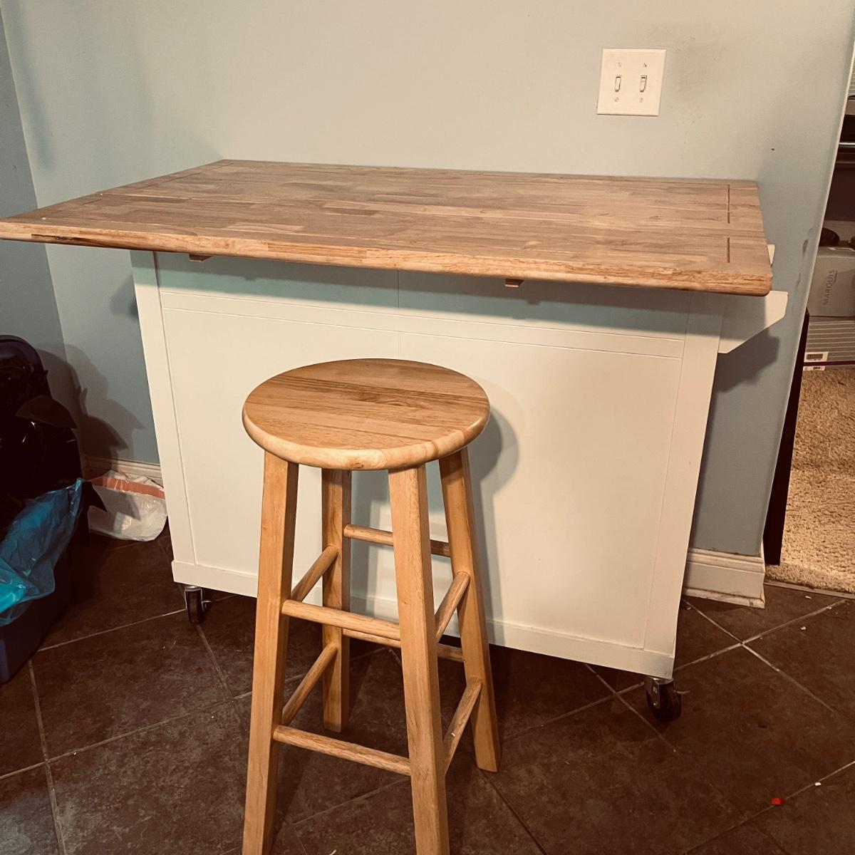 Lot includes a rolling kitchen cart with a one side drop leaf, two storage cubbies on one side, two drawers and a two door cabinet with one adjustable shelf. Cart measures 44” x 28” x 37” with leaf up and 44” x 19” x 37” with leaf down. Cart is MDF with what appears to be a solid wood top. Also include wooden stool standing 29" tall..