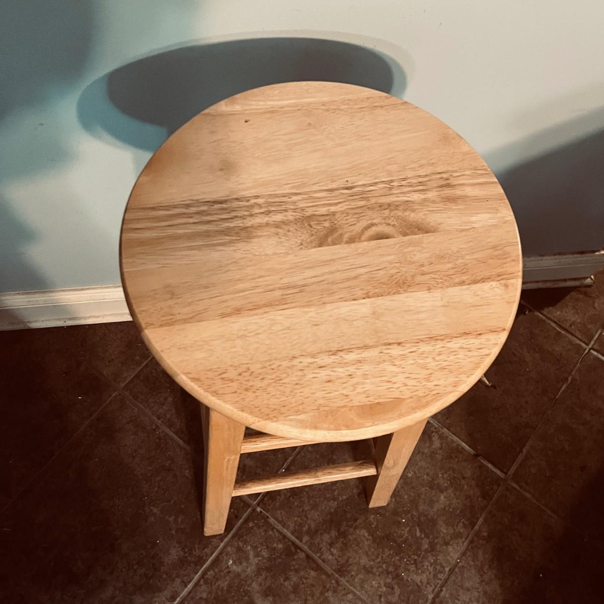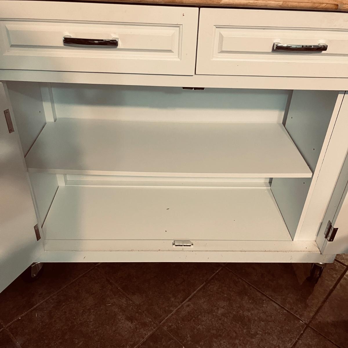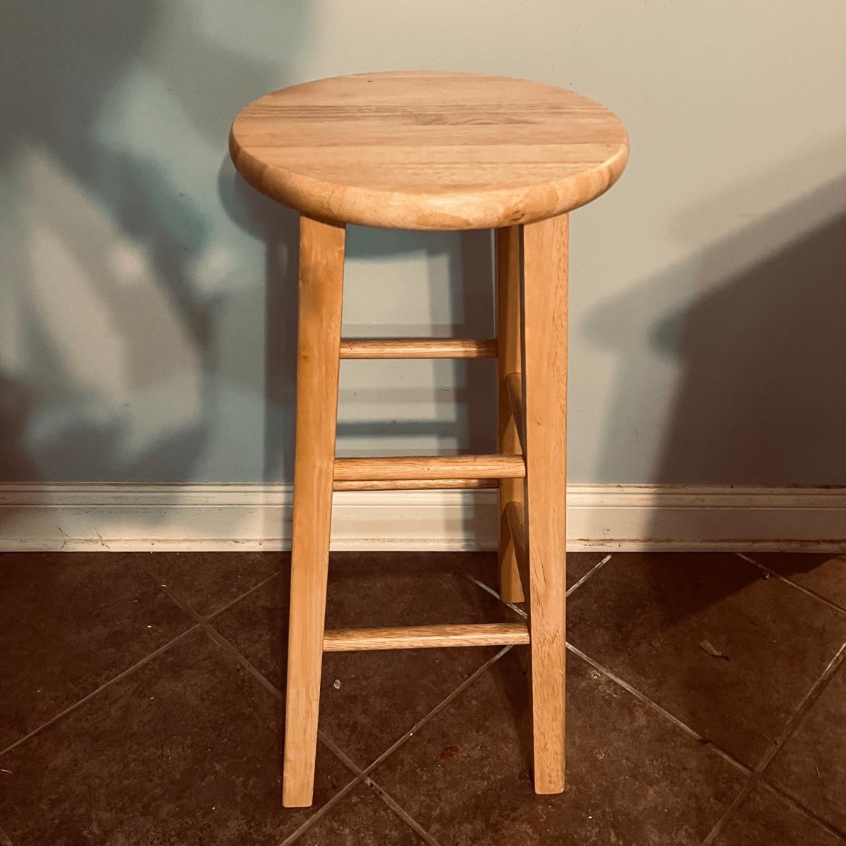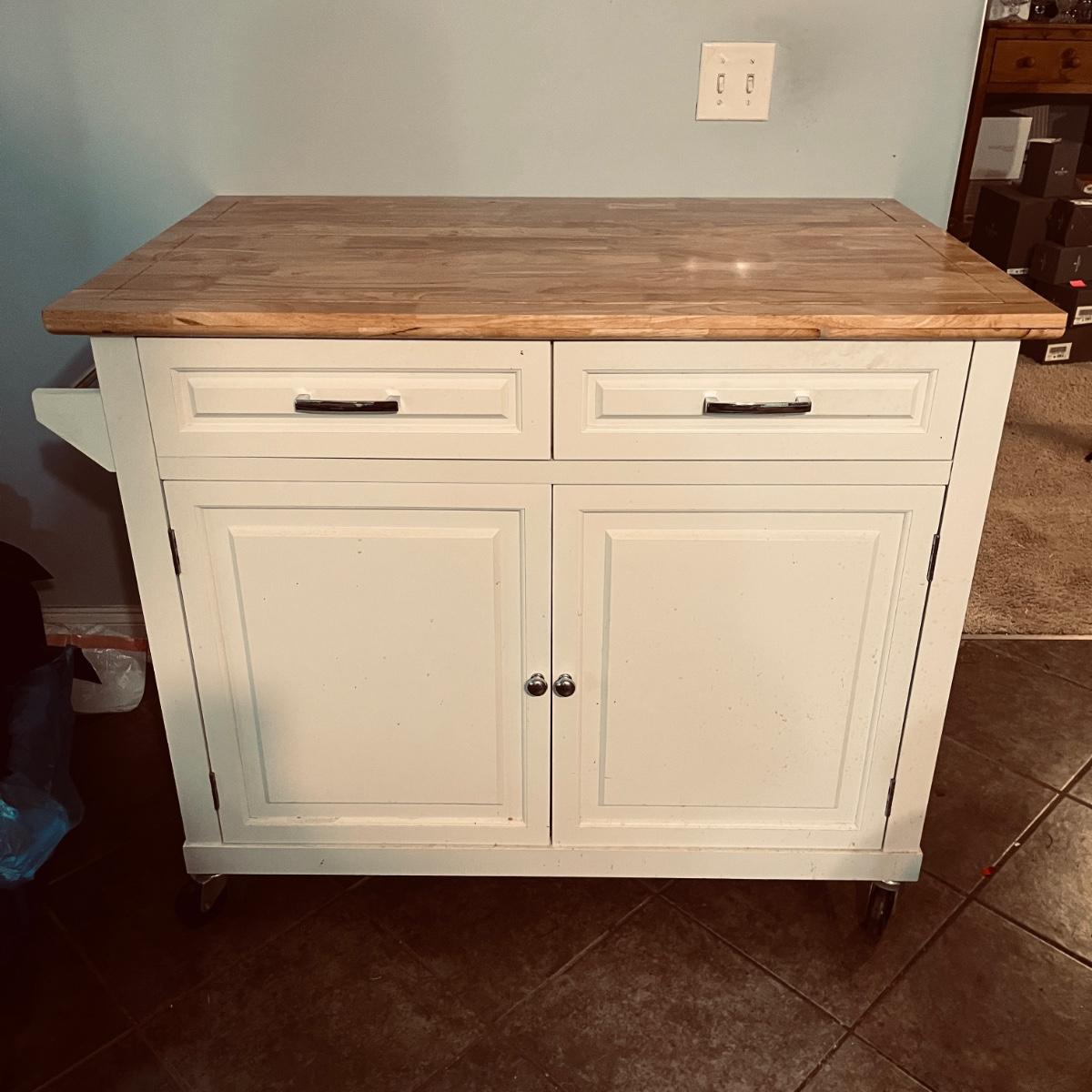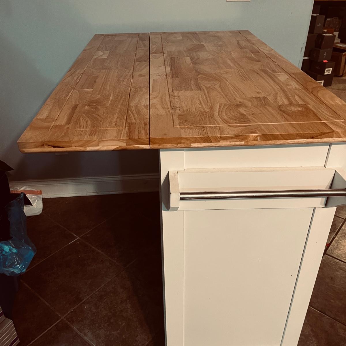 Lot includes a rolling kitchen cart with a one side drop leaf, two storage cubbies on one side, two drawers and a two door cabinet with one adjustable shelf. Cart measures 44” x 28” x 37” with leaf up and 44” x 19” x 37” with leaf down. Cart is MDF with what appears to be a solid wood top. Also include wooden stool standing 29" tall..