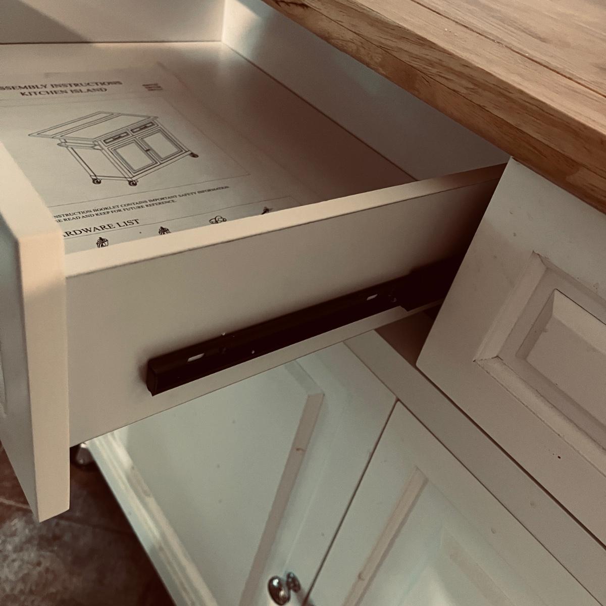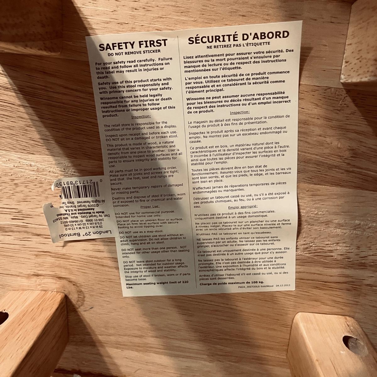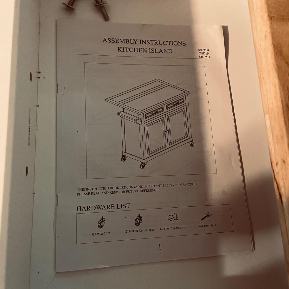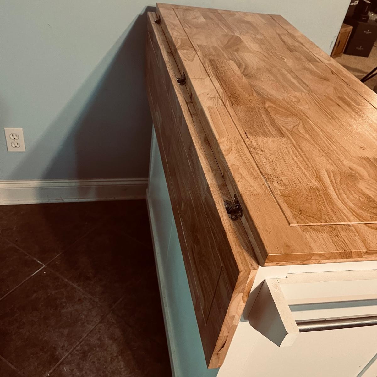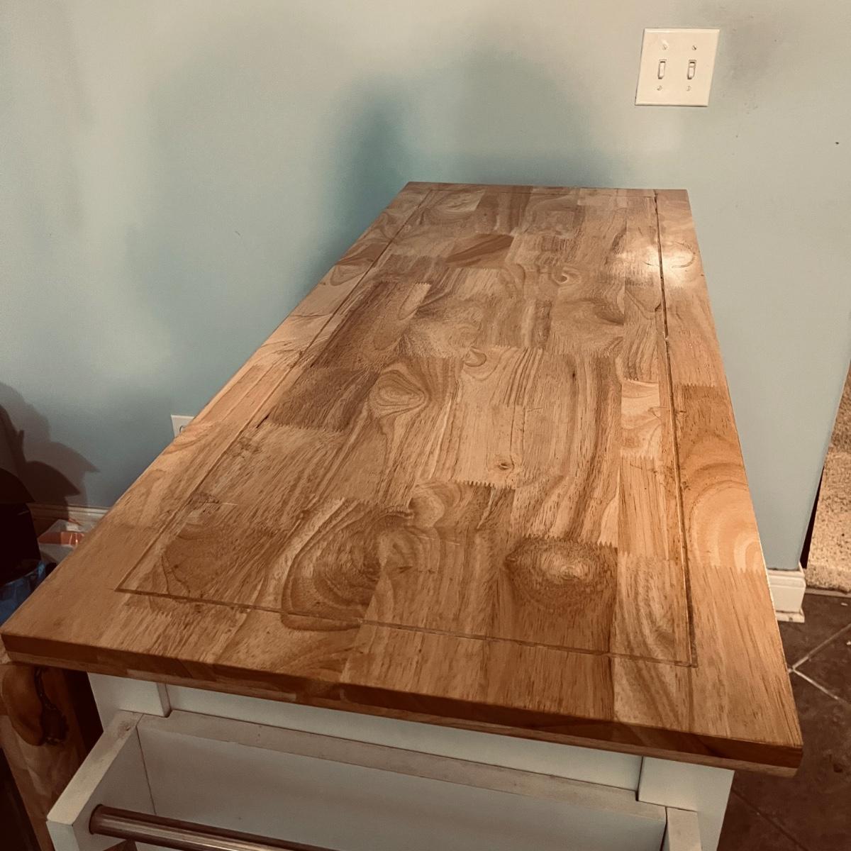 Lot includes a rolling kitchen cart with a one side drop leaf, two storage cubbies on one side, two drawers and a two door cabinet with one adjustable shelf. Cart measures 44” x 28” x 37” with leaf up and 44” x 19” x 37” with leaf down. Cart is MDF with what appears to be a solid wood top. Also include wooden stool standing 29" tall..