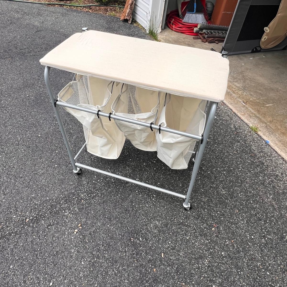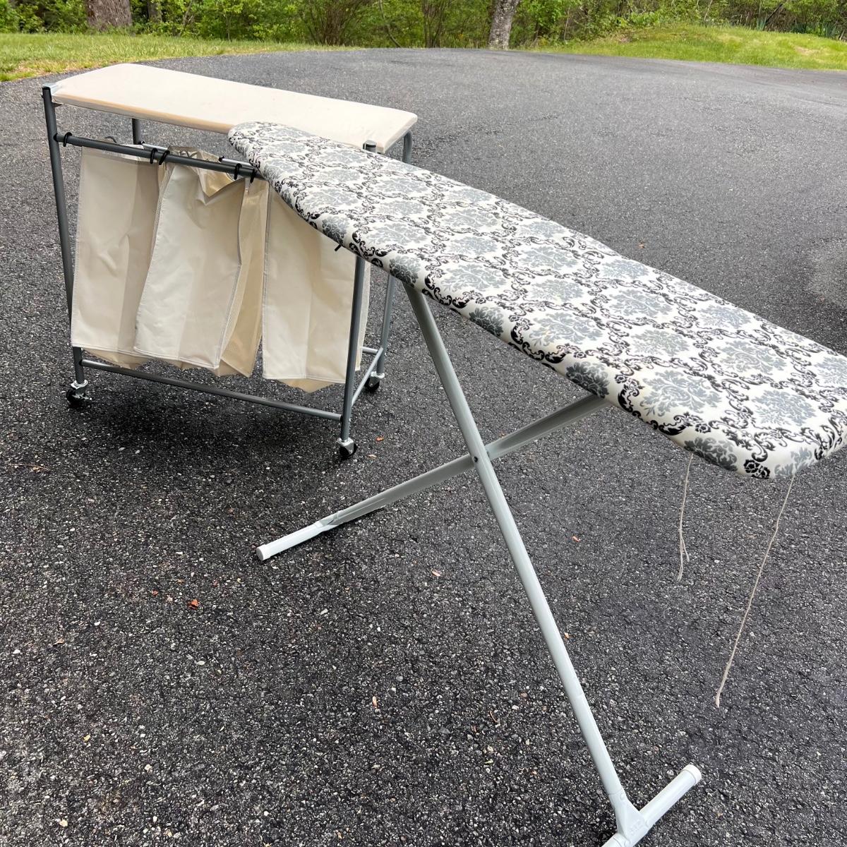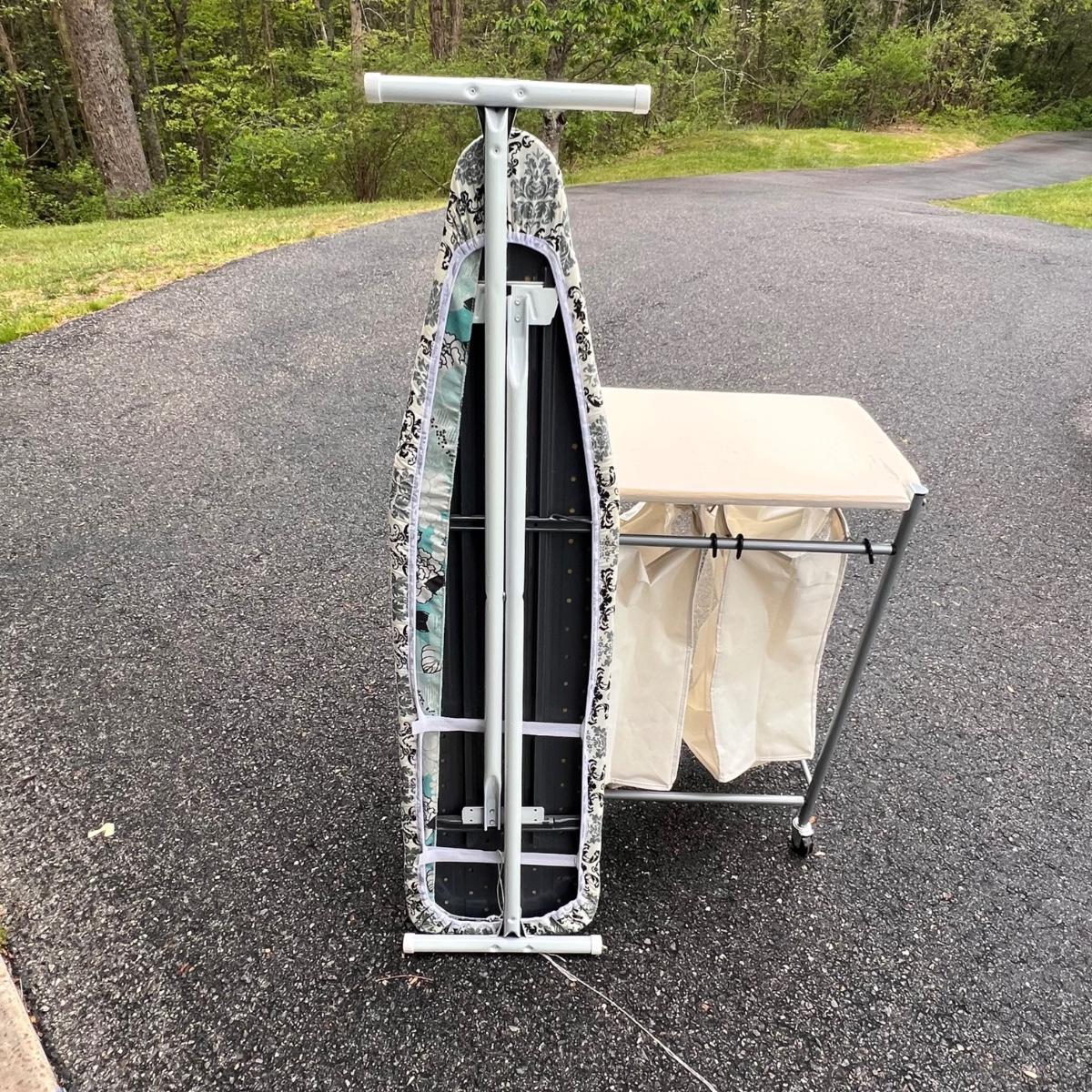 Lightweight rolling hamper has three compartments and lockable wheels. Ironing board is also included.