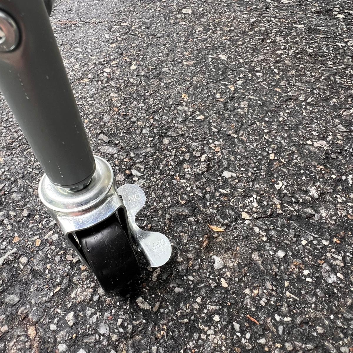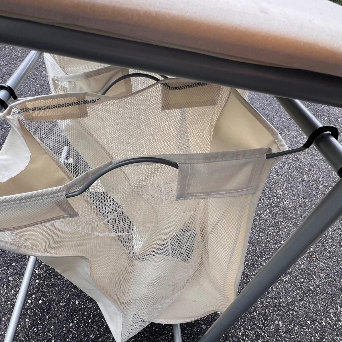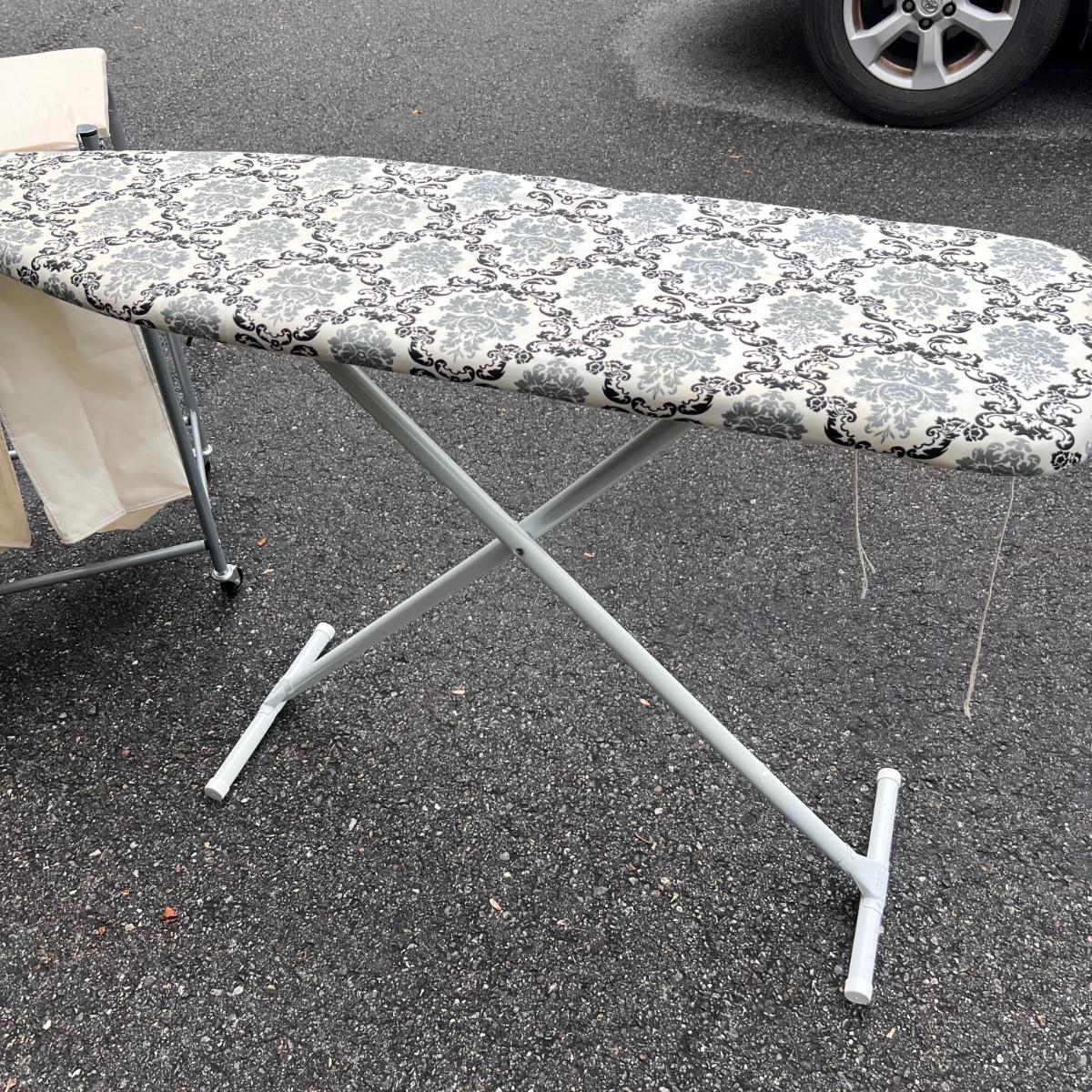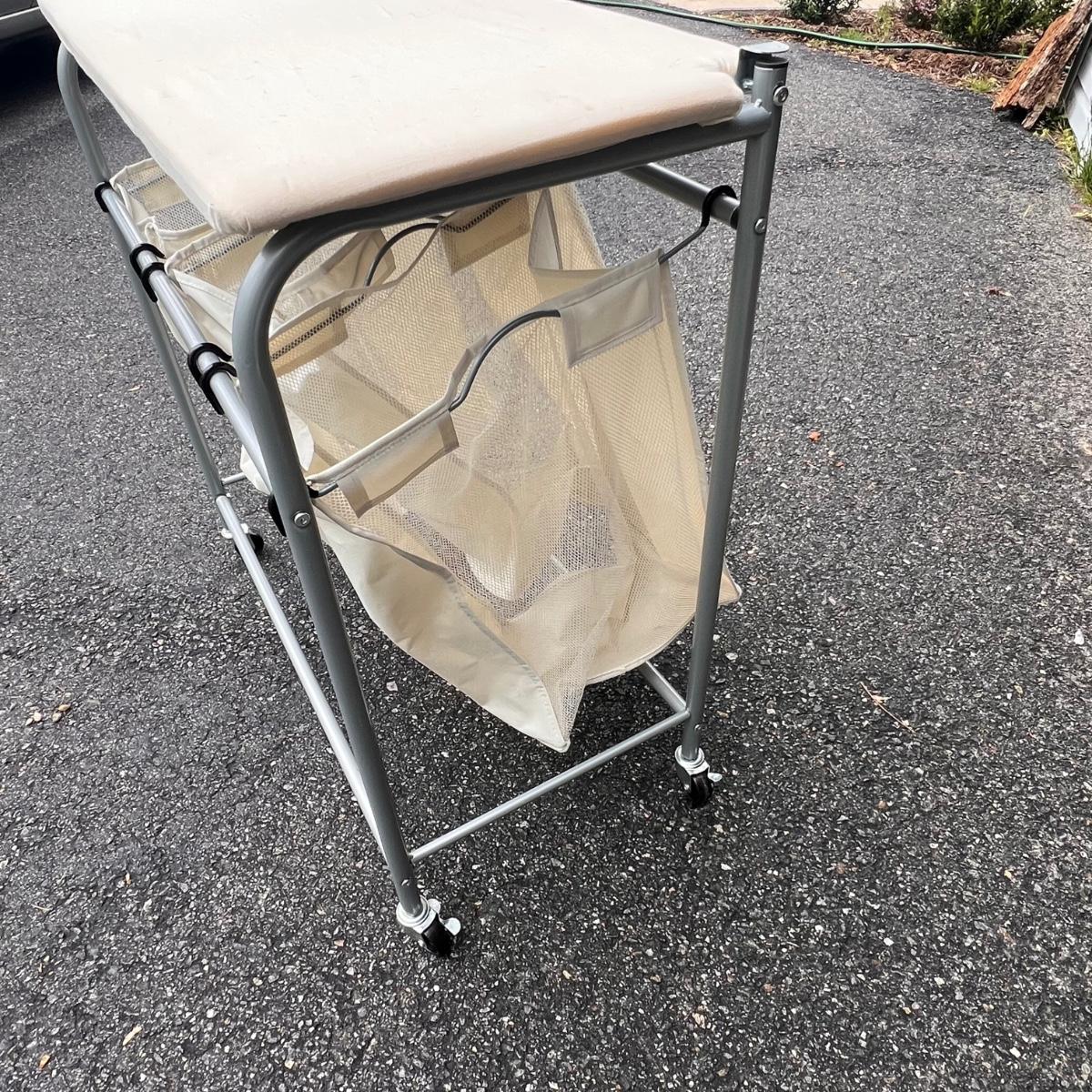 Lightweight rolling hamper has three compartments and lockable wheels. Ironing board is also included.