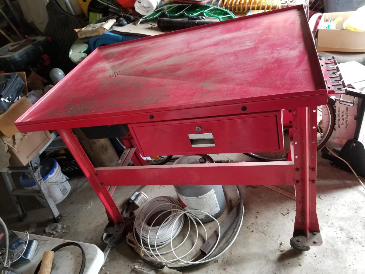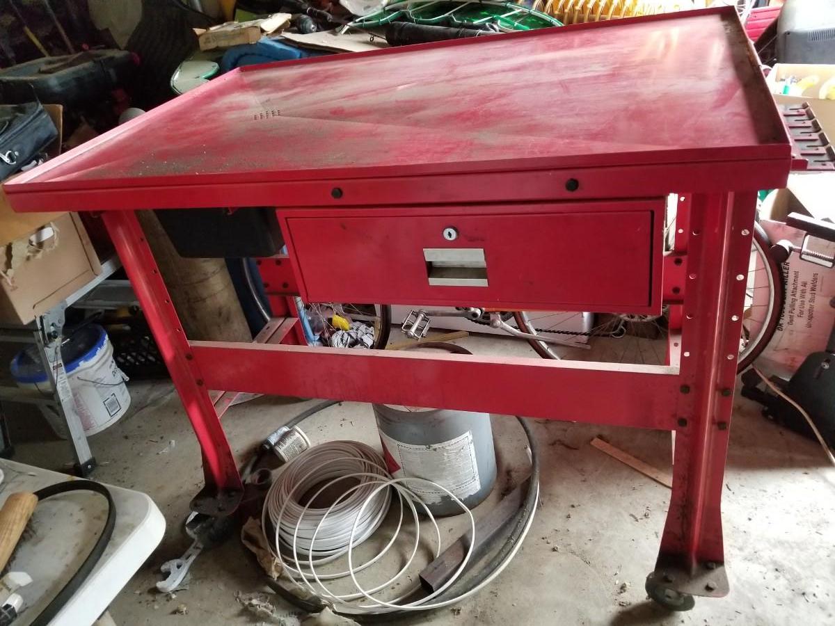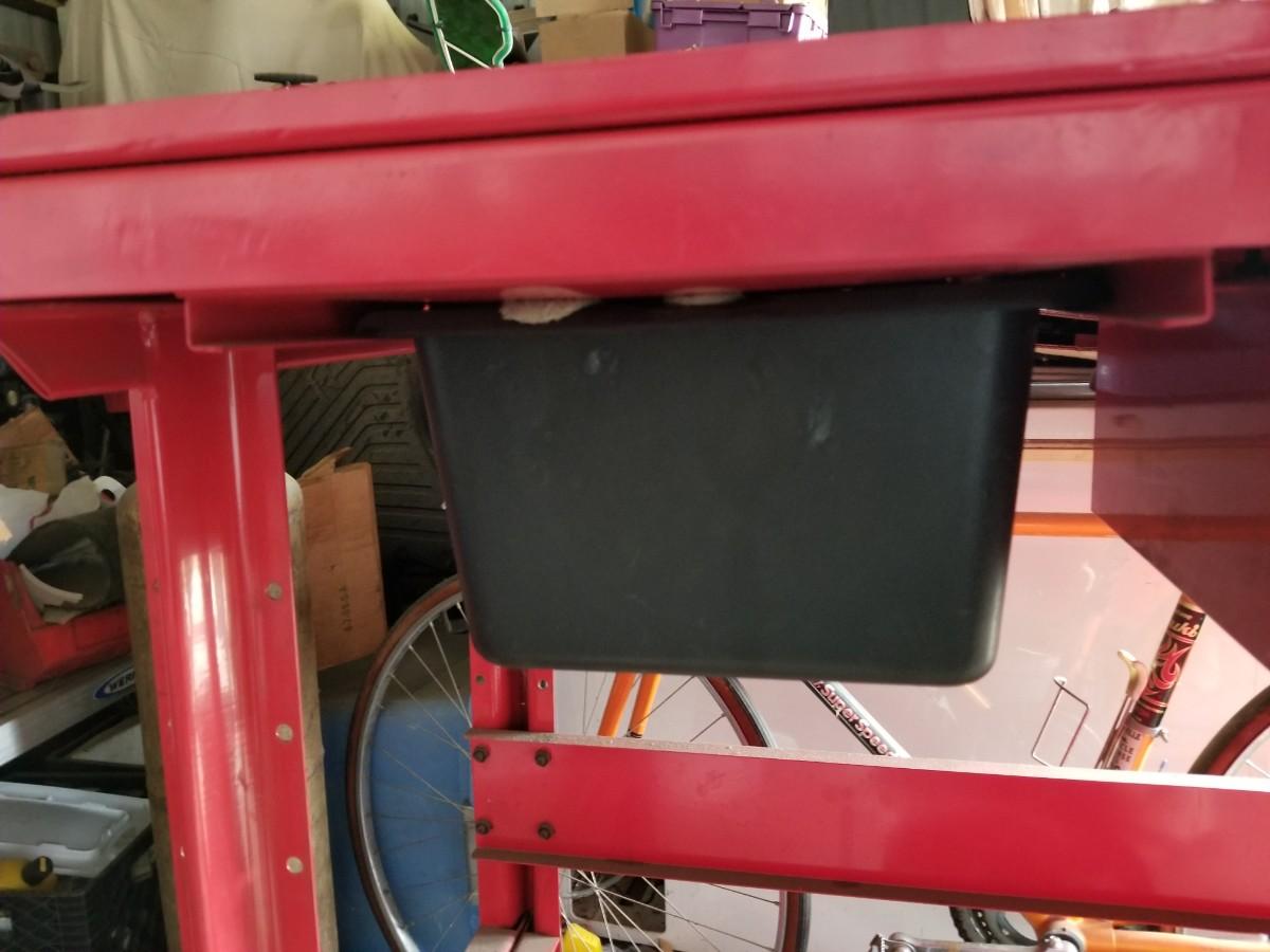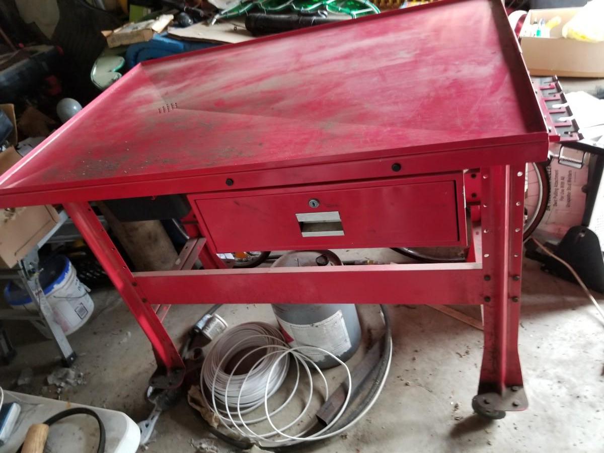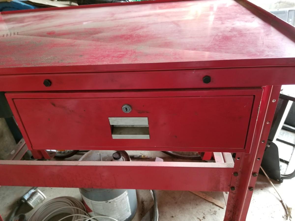 Has a single drawer and a tub to catch fluids. 47"x32"x41"